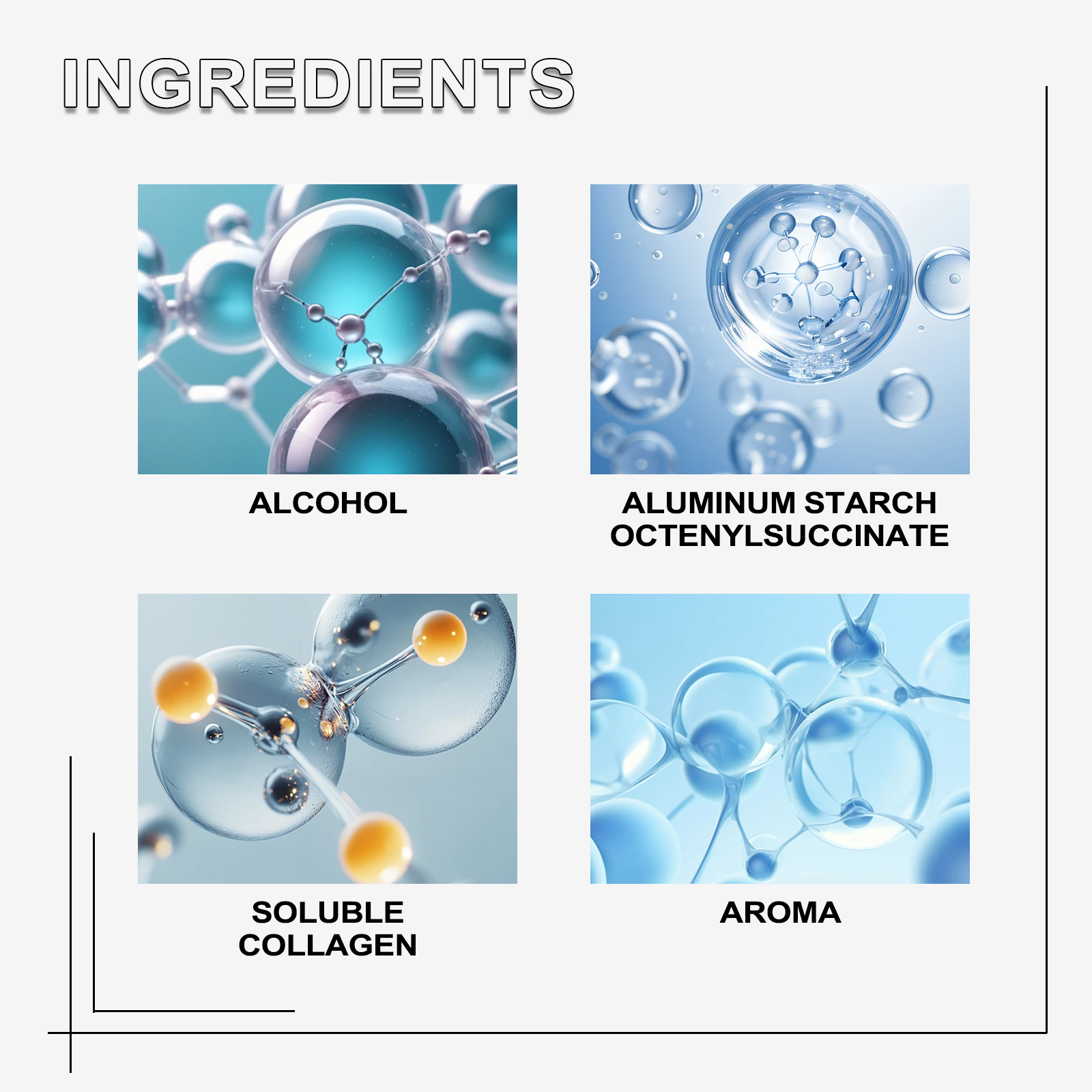 | 成分 | 淀粉辛烯基琥珀酸铝、香精、可溶性胶原 |