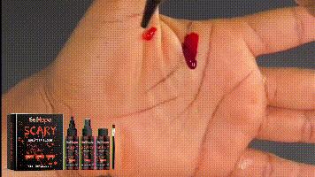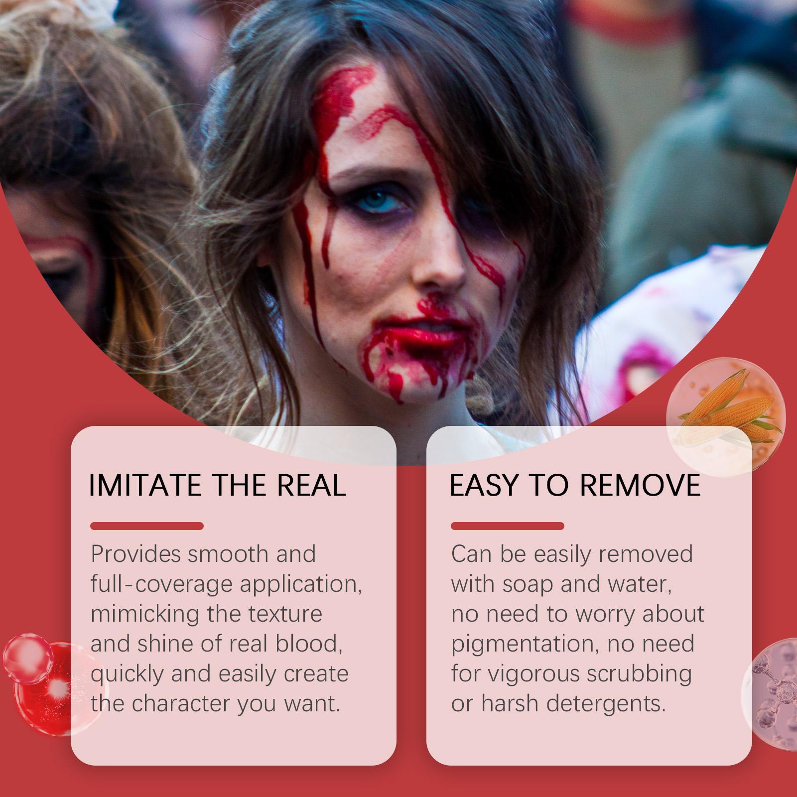 我们的万圣节假血套装,由二氧化钛、山梨酸钾、纤维素胶精心调配而成。专为模仿真实血液的纹理和光泽,快速轻松地创建您想要的角色设计。使用方法极为便捷:将假血滴、喷洒或者倒在身体或脸上,用刷子涂抹出逼真的效果即可。并且可以很容易地用肥皂和水去除,不需要担心色素沉淀,不需要剧烈的擦洗或刺激性的洗涤剂。