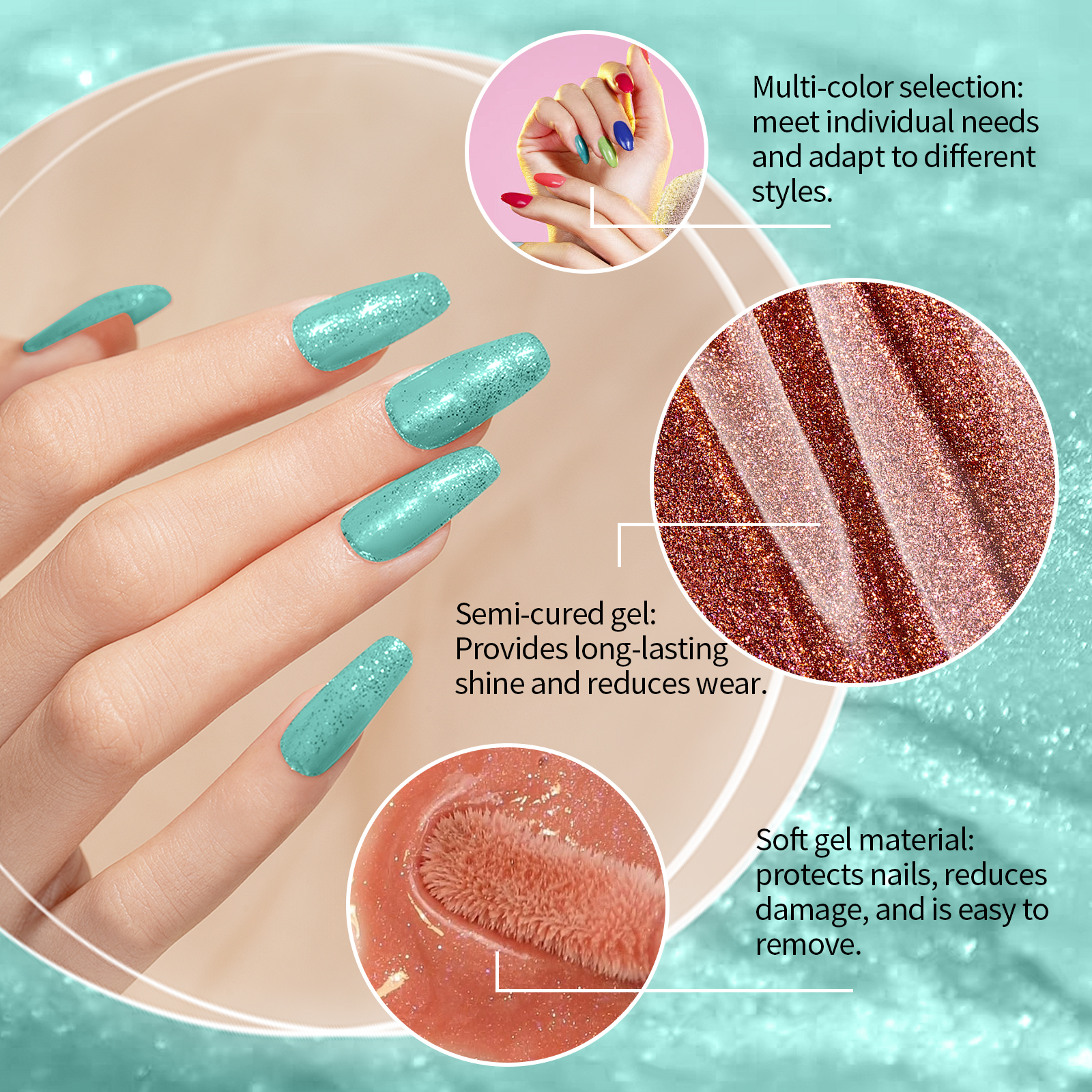 我们的软凝胶指甲贴套装(闪光蓝绿色),由半固化凝胶精心调配而成。专为轻松恢复指甲原有状态设计。使用方法极为便捷:1.用酒精垫清洁指甲,选择适合你指甲的尺寸;2.把钉贴贴在钉子上,用木棒沿边缘压紧,用钉子把多余的部分剪掉;3.最后用指甲锉和剪刀把指甲的边缘打磨一下。并且可以提供多种颜色,满足不同需求。