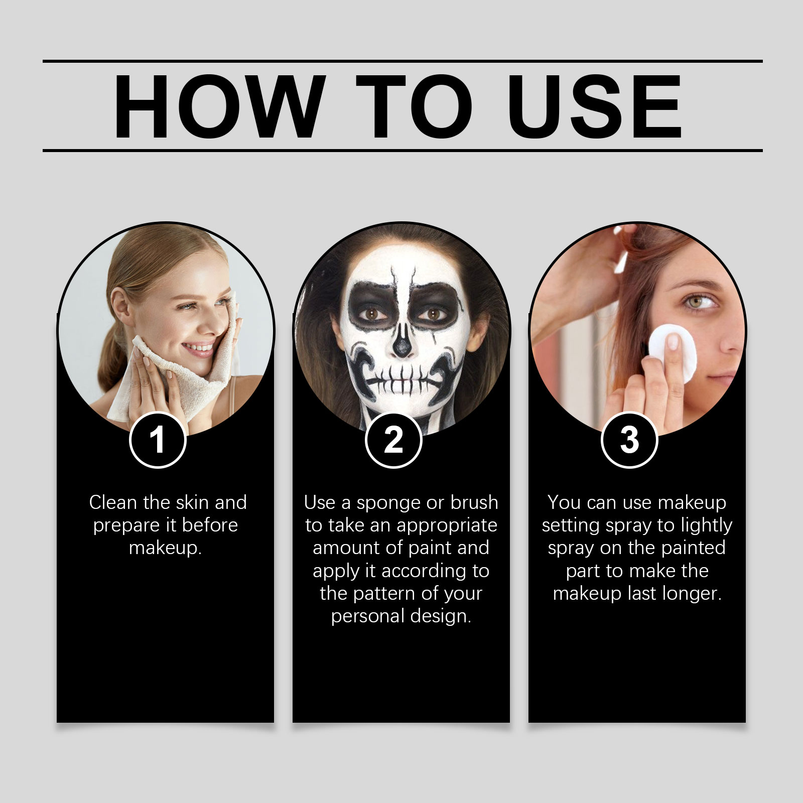 我们的万圣节面部彩绘棒套装,由矿油、霍霍巴籽油精心调配而成。专为适合打造任何惊艳的造型设计。使用方法极为便捷:1.清洁皮肤并做好妆前准备工作。2.用海绵或刷子取适量的彩绘,按照个人设计的图案进行涂抹。3.可以使用定妆喷雾轻轻喷洒在彩绘部分,让妆容更加持久。并且可以持续一整天,不易褪色,而且颜色持久。