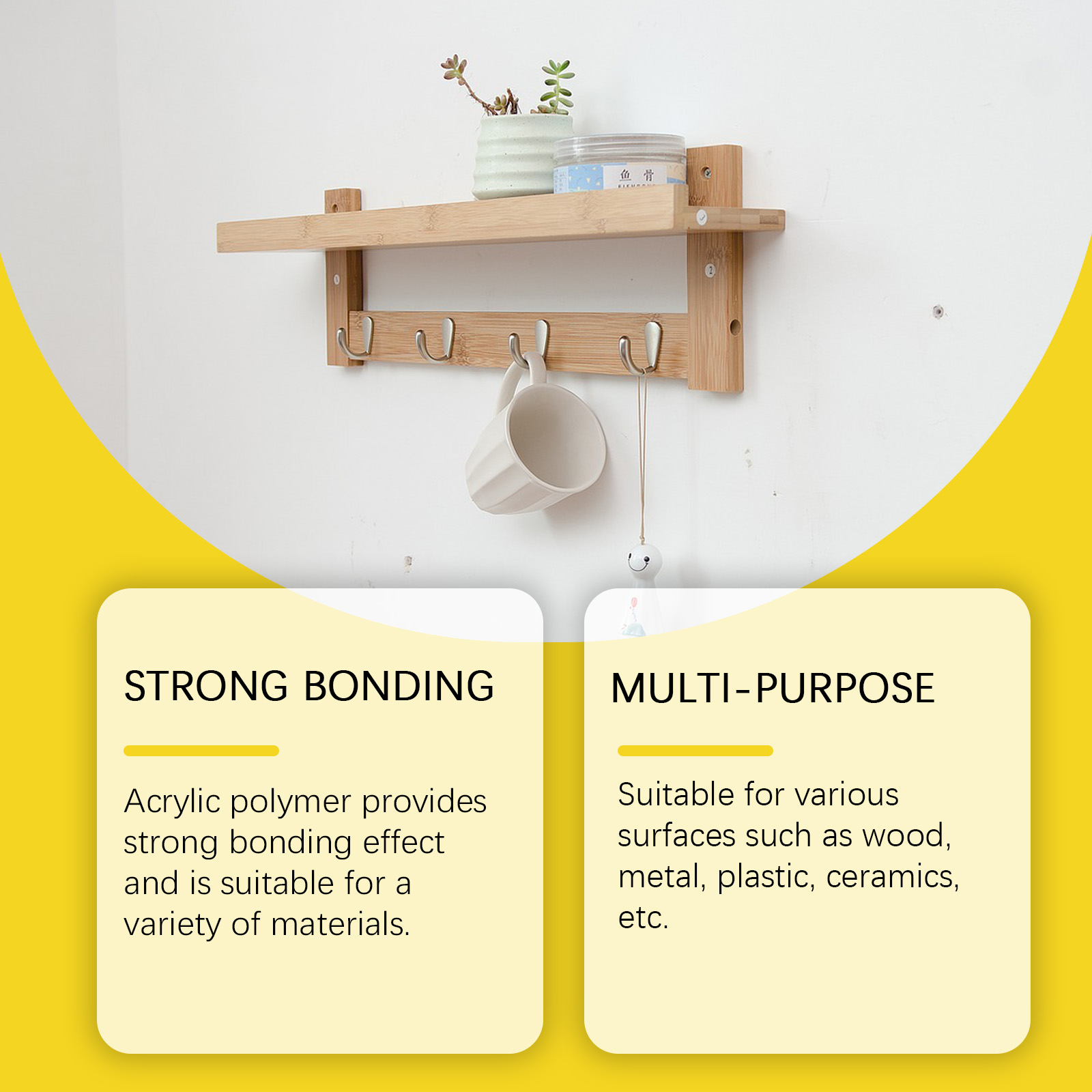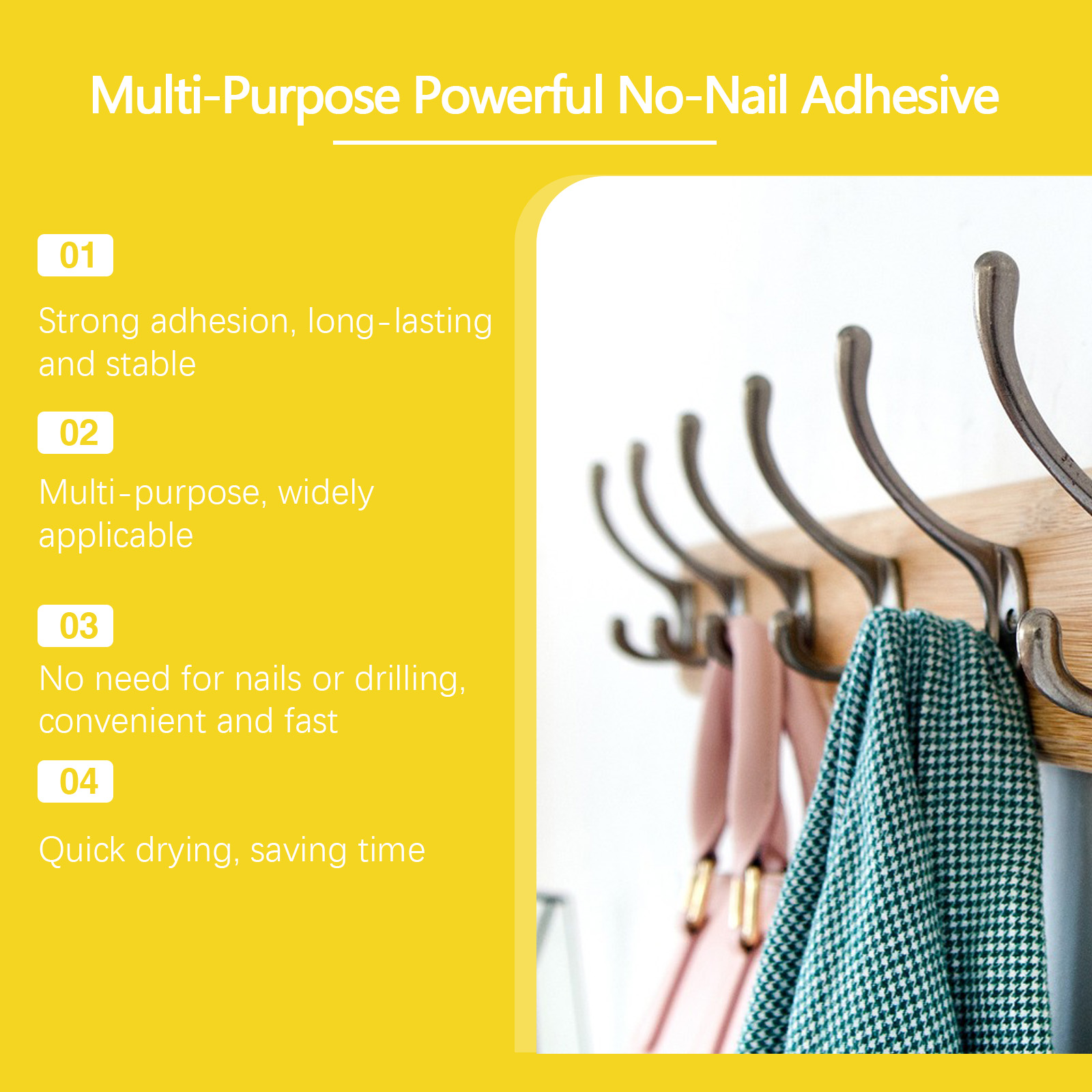我们的多用途免钉胶,由丙烯酸酯聚合物、消泡剂精心调配而成。专为高效粘接,免钉免钻设计。使用方法极为便捷:1. 清洁墙壁并保持干燥。2. 在要粘贴的物品的背面均匀地涂上免钉胶,点或条。3. 使用后,等待24小时干燥,然后可以永久使用。并且具有很强的粘接效果,适用于各种材料。适用于木材、金属、塑料、陶瓷等各种表面。