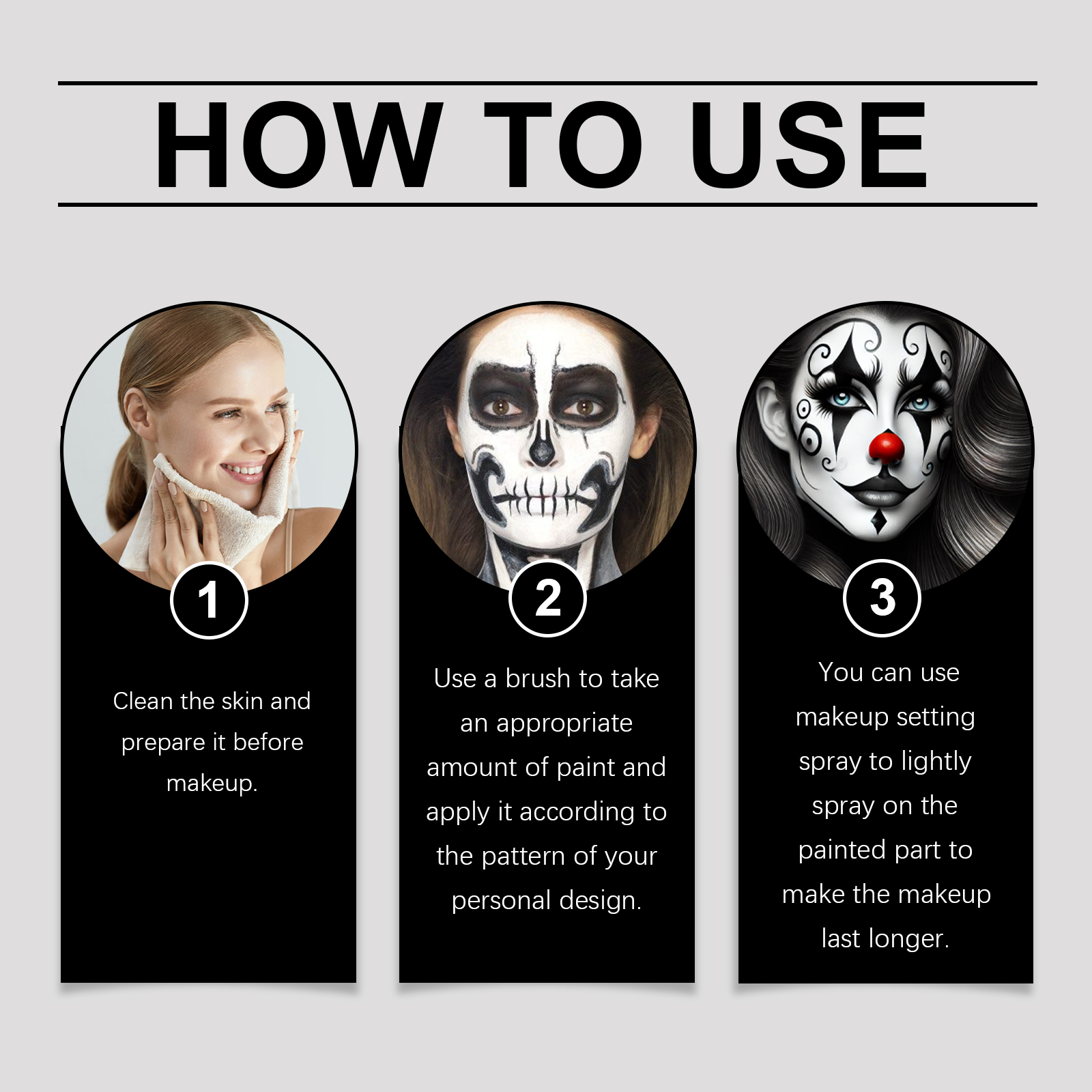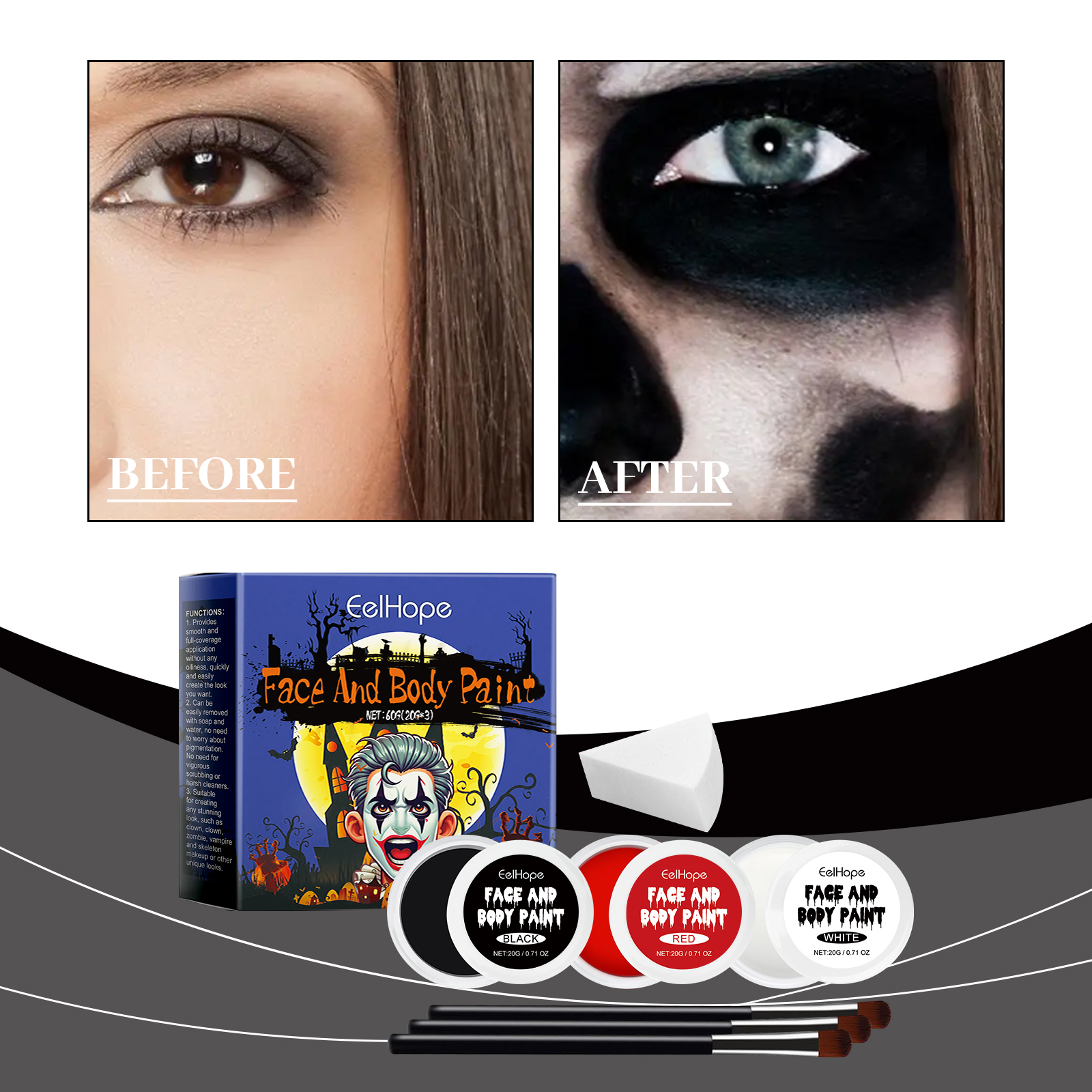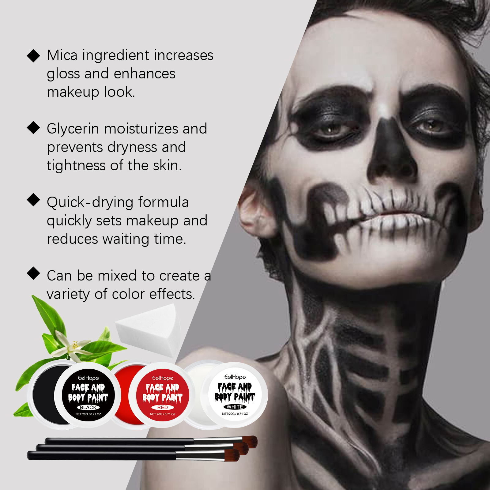我们的万圣节调色板套装,由甜橙花油、透明质酸钠、云母精心调配而成。专为快速轻松地打造您想要的角色设计。使用方法极为便捷:1. 化妆前清洁皮肤并做好准备。2. 用刷子或海绵取适量的颜料,根据个人设计的图案涂抹。3. 您可以使用化妆定型喷雾轻轻喷在涂的部分,使彩妆持久。并且质地柔滑,易于化妆和均匀覆盖。