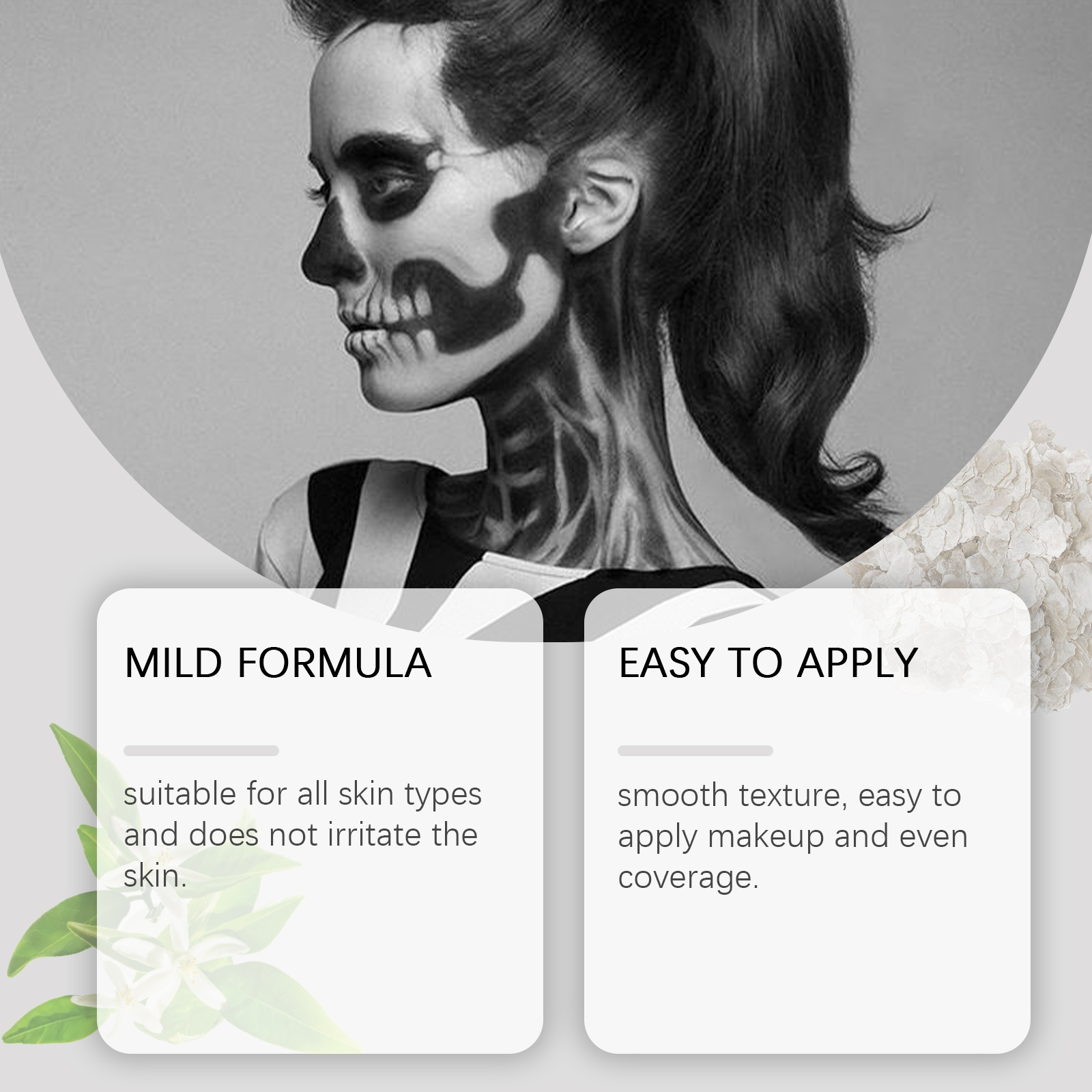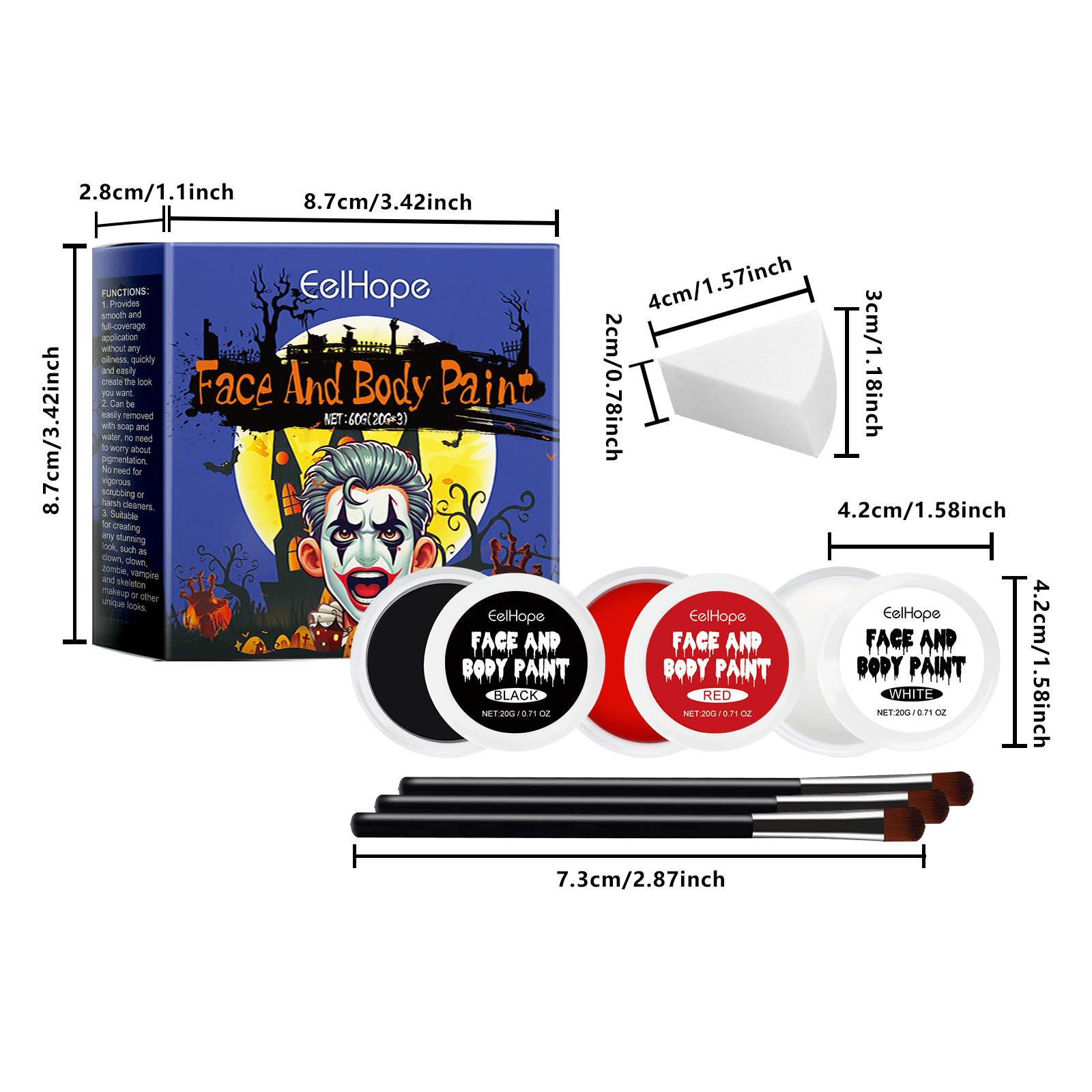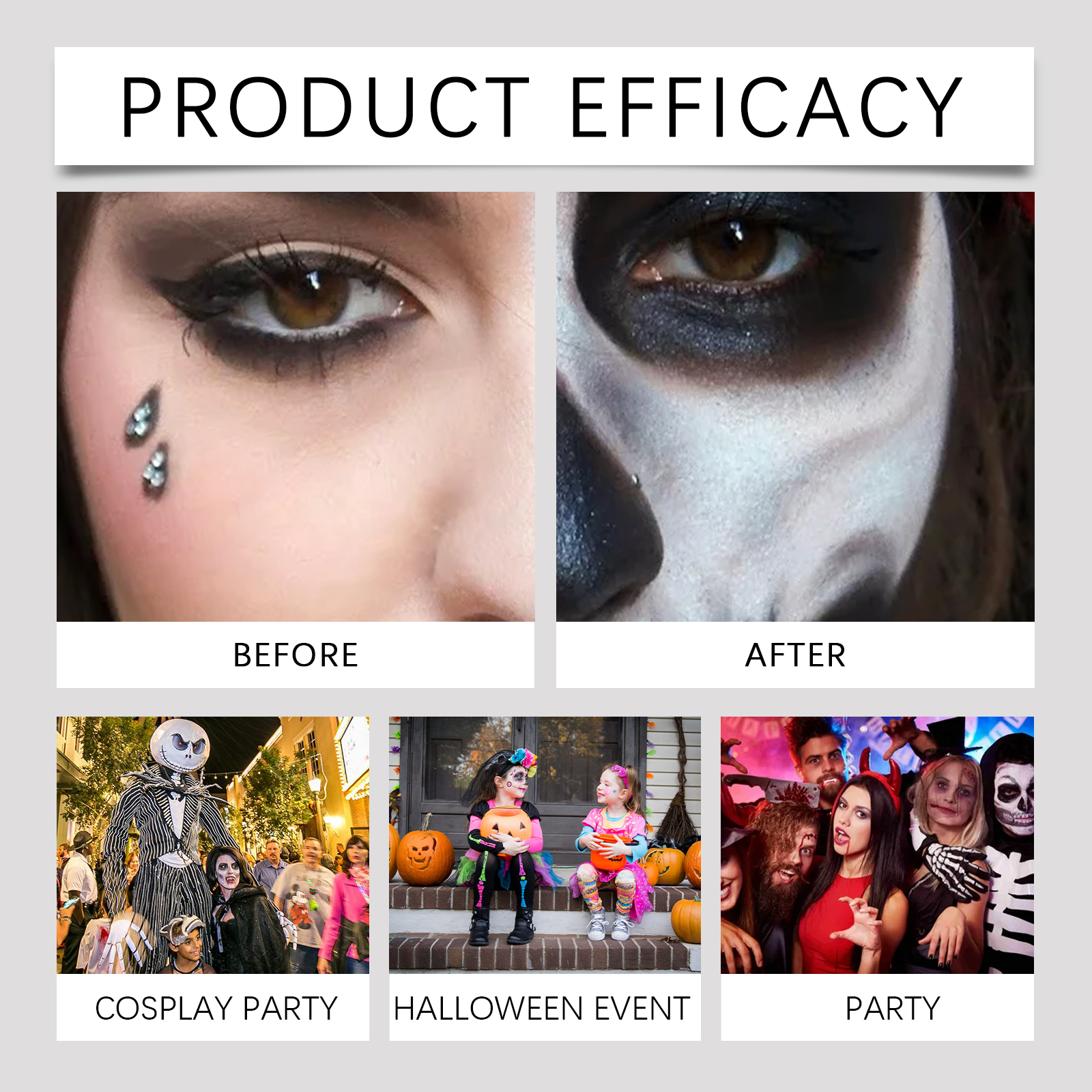 我们的万圣节调色板套装,由甜橙花油、透明质酸钠、云母精心调配而成。专为快速轻松地打造您想要的角色设计。使用方法极为便捷:1. 化妆前清洁皮肤并做好准备。2. 用刷子或海绵取适量的颜料,根据个人设计的图案涂抹。3. 您可以使用化妆定型喷雾轻轻喷在涂的部分,使彩妆持久。并且质地柔滑,易于化妆和均匀覆盖。