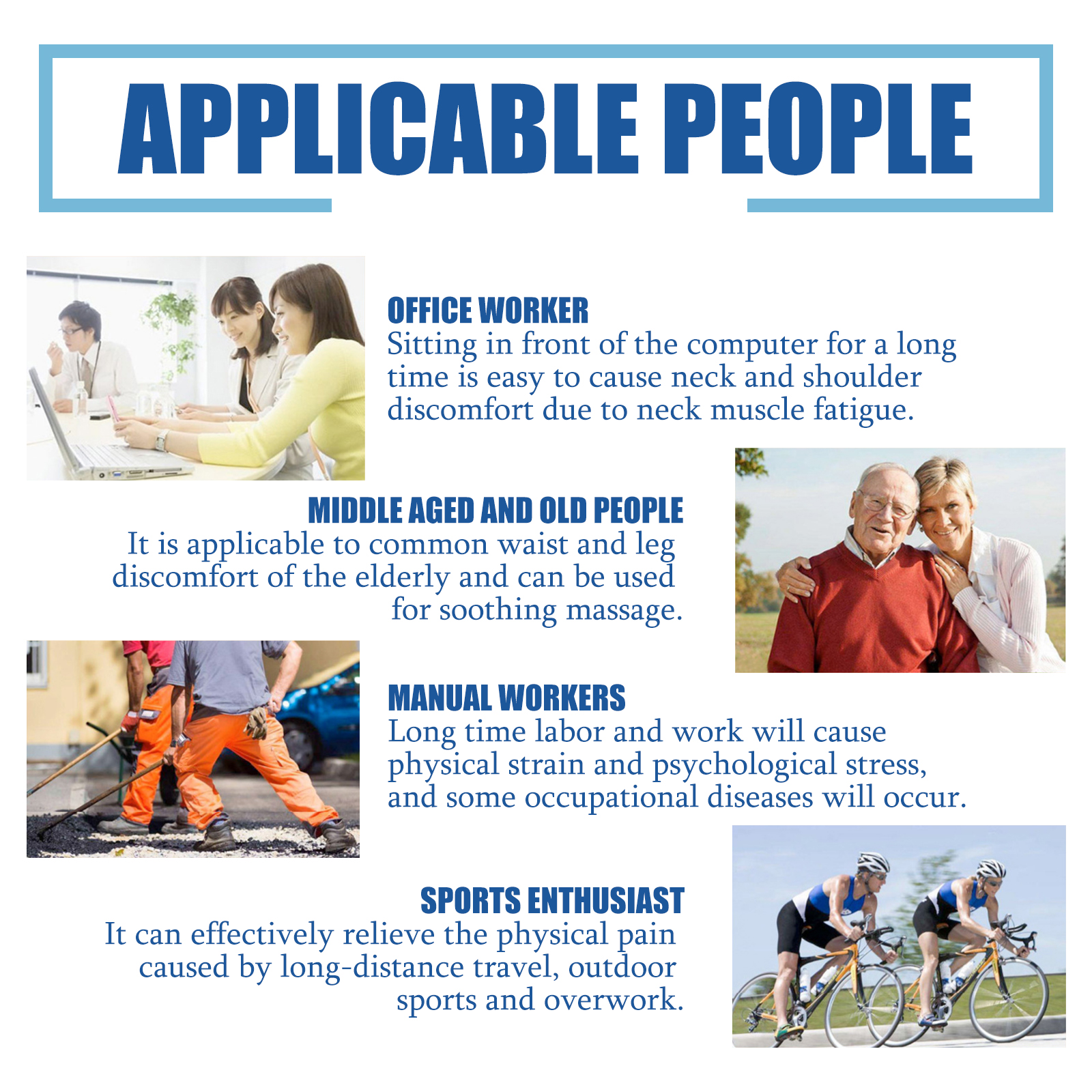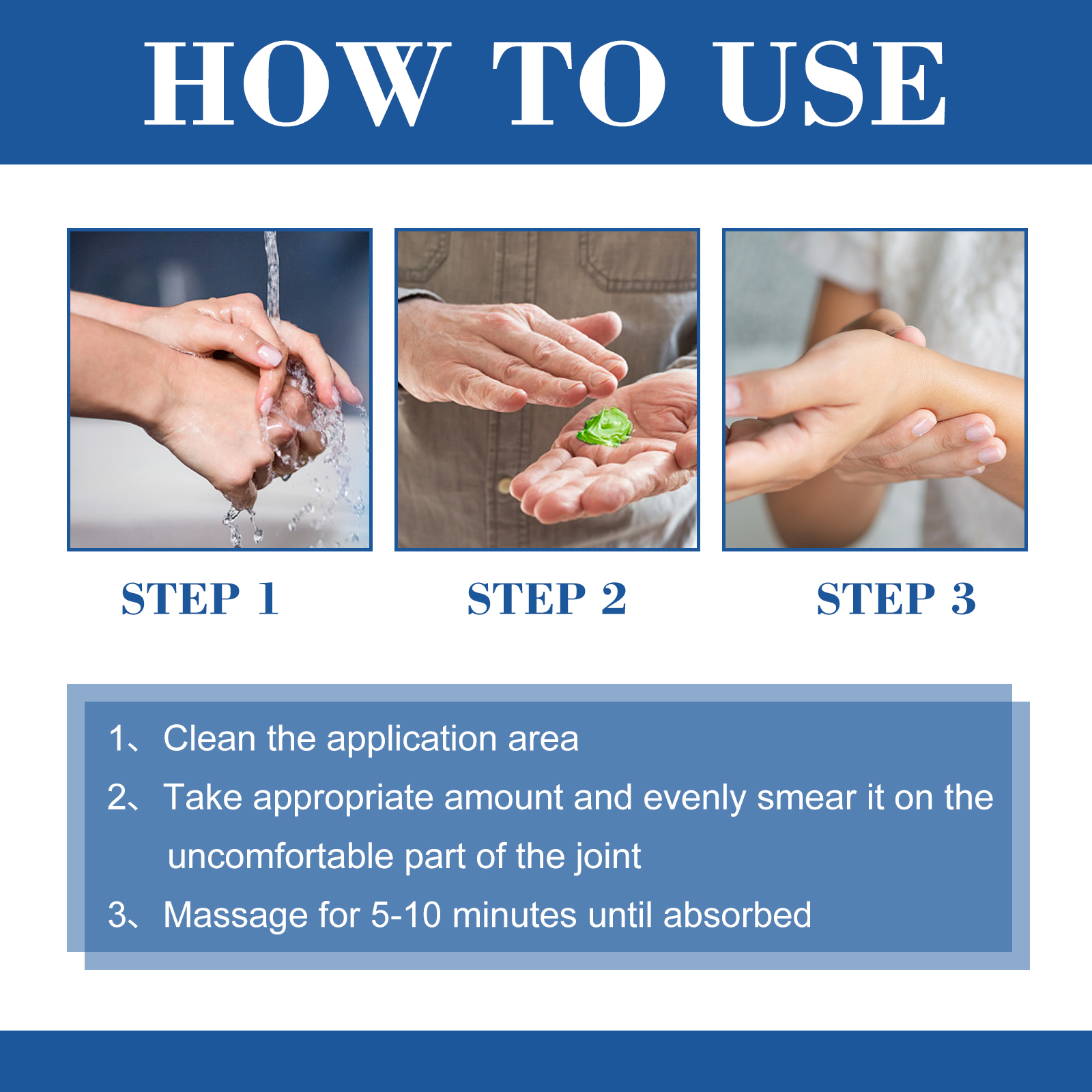 我们的关节疼痛缓解膏含有薄荷醇、水杨酸薄荷醇。它可以有助于减少关节不适,缓解关节和肌肉疼痛,促进关节组织修复,提高关节弹性和流动性,同时促进血液循环。它的使用方法很简单:首先清洁疼痛区域,之后取适量的疼痛膏均匀涂抹于关节不舒服的部位,最后按摩5-10分钟,直至吸收。使用后有助于减少关节不适和关节和肌肉疼痛,促进关节组织修复,提高关节弹性和流动性,同时促进血液循环,让疼痛得到缓解。