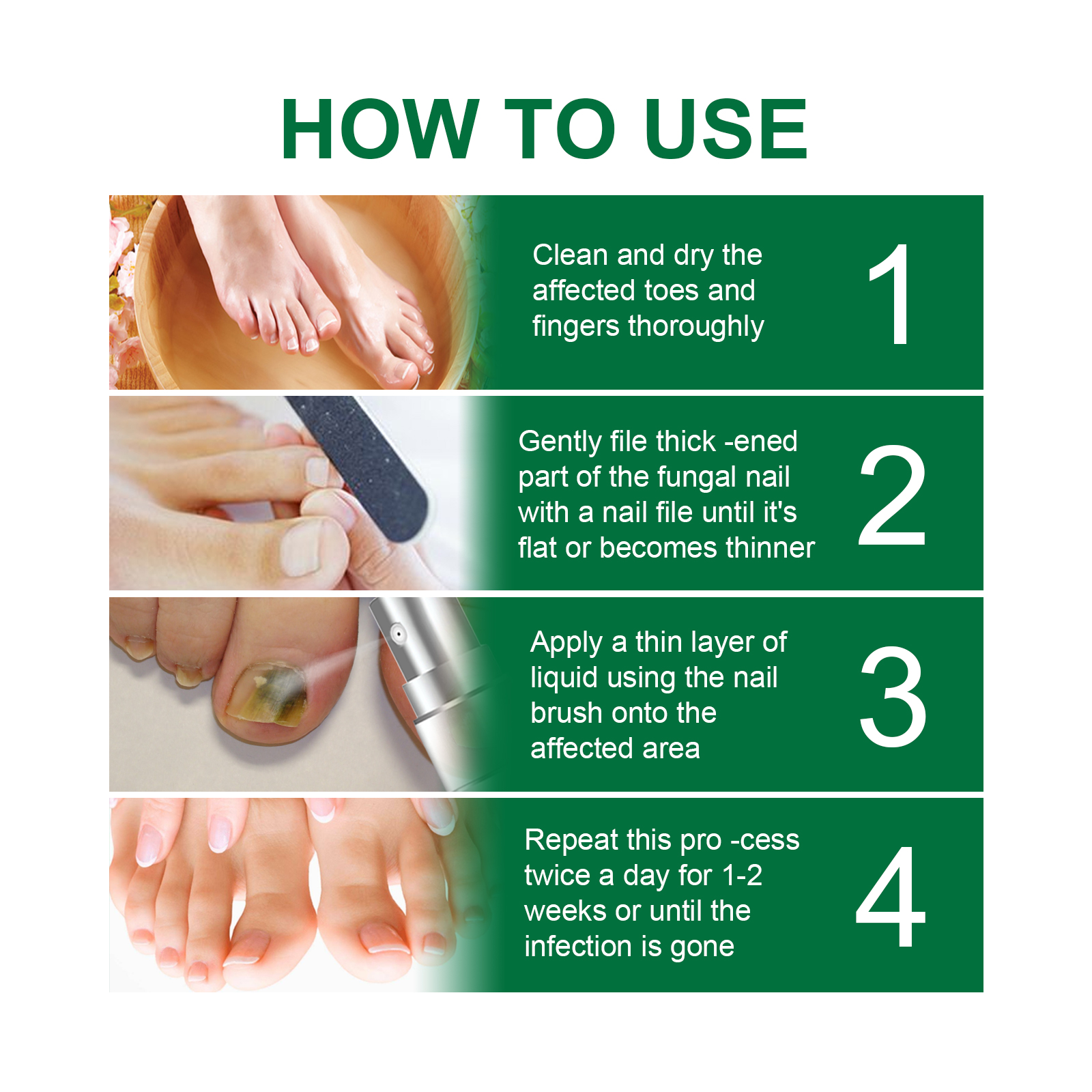 我们的趾甲修护精华含有水杨酸、艾蒿提取物、地黄。它可以强化指甲,深层保湿,滋养角质层,帮助消除影响指甲的真菌,促进生长。它的使用方法很简单:首先清洗并擦干受影响的脚趾和手指,用指甲刀和锉刀尽可能多地去除受损的指甲,直到指甲变平或变薄,之后用指甲刷在患处涂上一层薄薄的液体,每天重复此过程两次,持续1-2周或直到感染消失。使用后化和修复干燥指甲,加强和滋养指甲,帮助消除影响指甲的真菌,让指甲重新看起来清澈健康。
