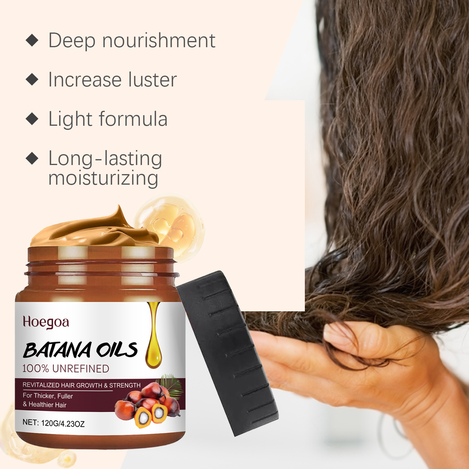 我们的巴塔纳油护发膏含有棕榈油、生育酚(维生素E)、蓖麻籽油。它可以深层滋养头发,修复受损头发。赋予头发自然光泽,使头发更顺滑明亮。它的使用方法很简单:1.滋润头发;2.取适量均匀涂于头发上;3.轻轻按摩至吸收,然后用水冲洗。深层滋养及修复受损肌肤。