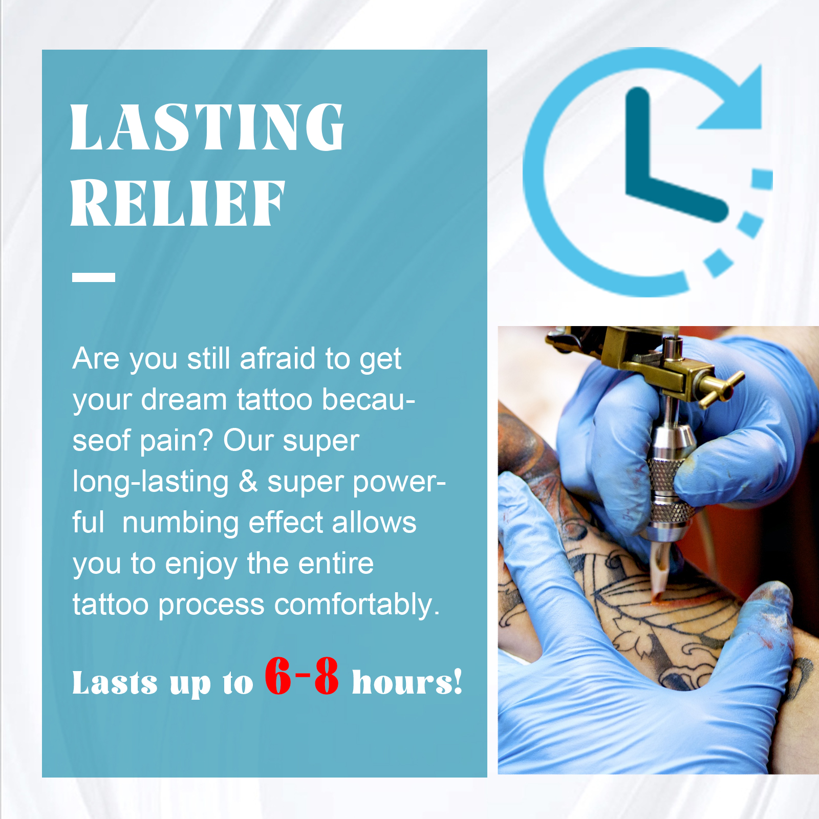 我们的纹身护理膏含有芦荟、利多卡因、维生素E,它有助于皮肤的纹身修护。它的使用方法很简单:1.用肥皂清洗特定区域把它拍干。2.用涂抹勺涂上一层厚厚的奶油。3.盖上保鲜膜并加压30-35分钟(完全麻木约45分钟)。4.涂抹产品前用纸巾或软布吸干。使用后减轻纹身皮肤疼痛。