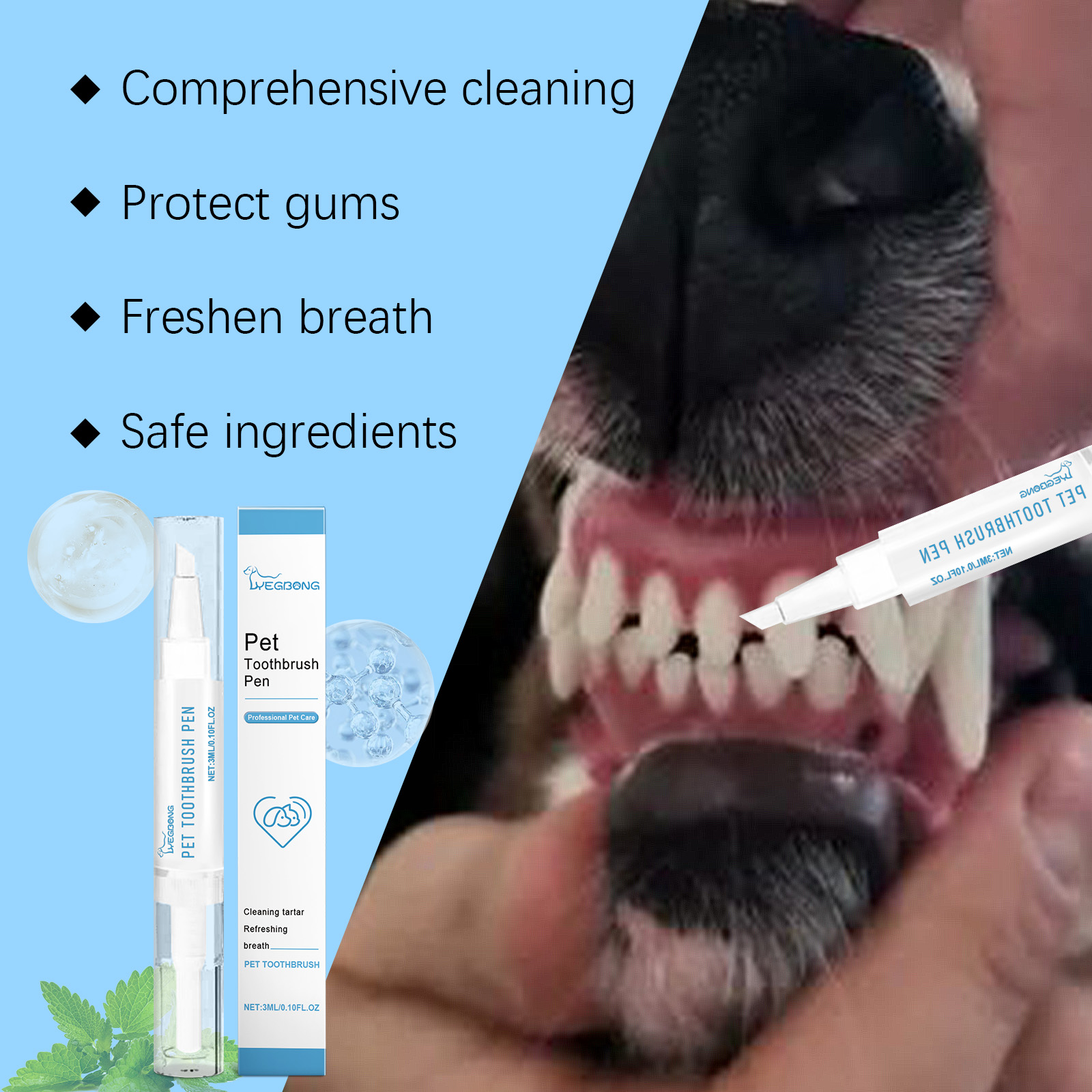 我们的宠物牙齿清洁护理刷含有去离子水、植物提取物、薄荷提取物。它可以淡化牙齿表面的黑色污渍,使宠物牙齿恢复明亮的白色光泽,改善口腔美观。它的使用方法很简单:1. 将牙刷旋转一下,以将牙面上的油渍冲洗掉。2.用牙刷笔清洁宠物的牙齿。3. 3分钟后,用工具慢慢刮掉宠物牙齿上的污垢。4.用牙刷再涂一次,以保护宠物的牙齿表面。维护和修复宠物牙齿和口腔环境。改善宠物牙齿状况,减少口腔疾病的发生。成分温和,不会对宠物的口腔造成任何刺激。