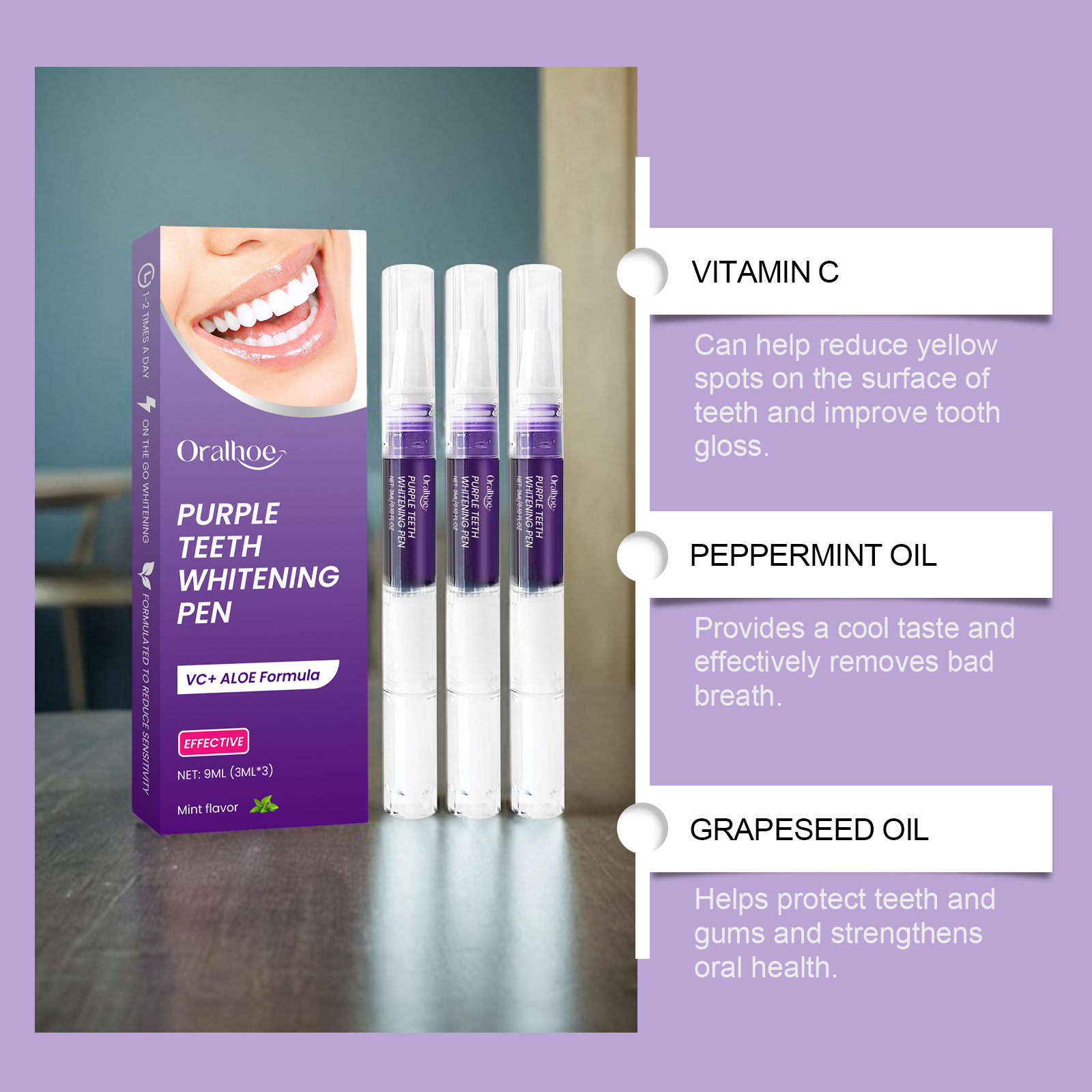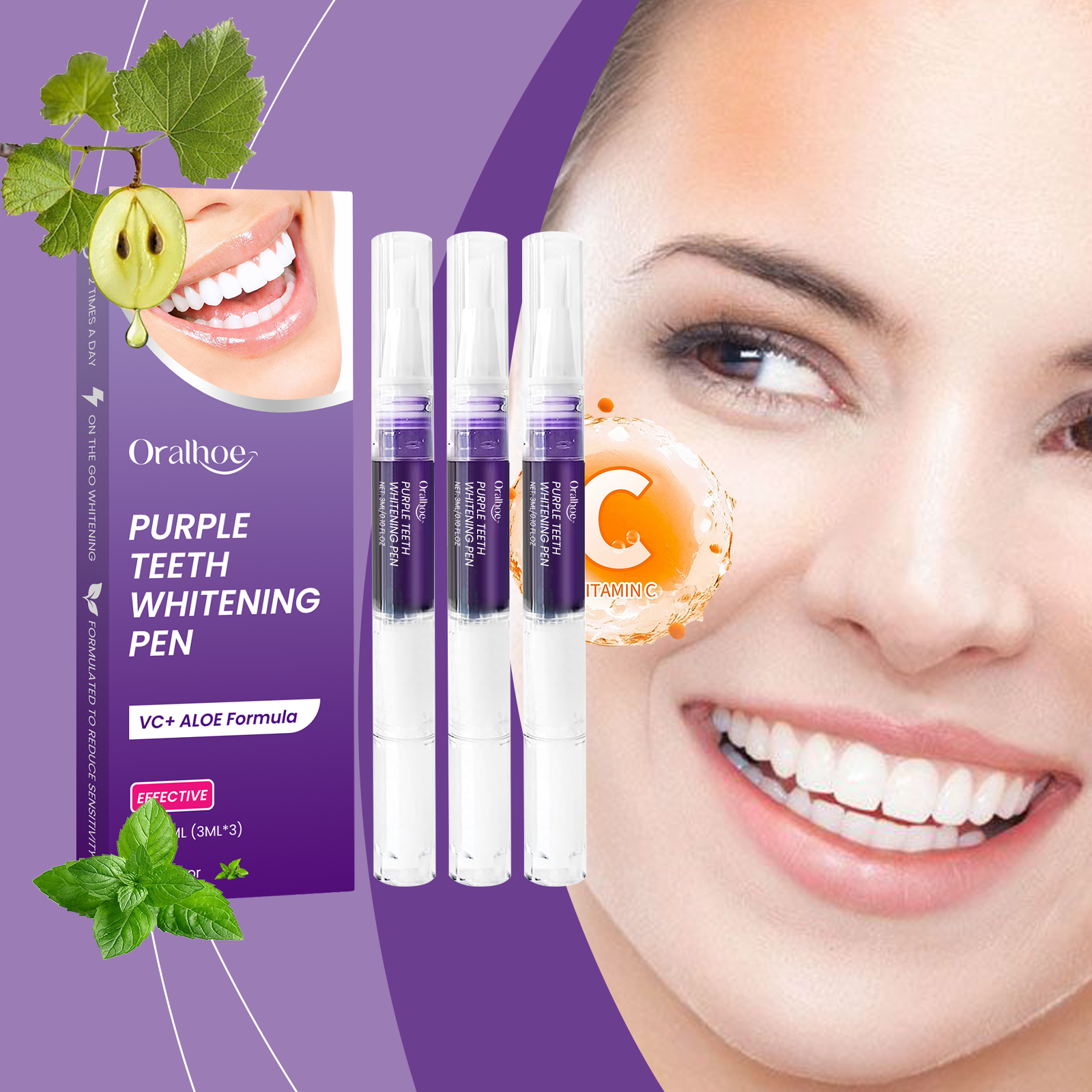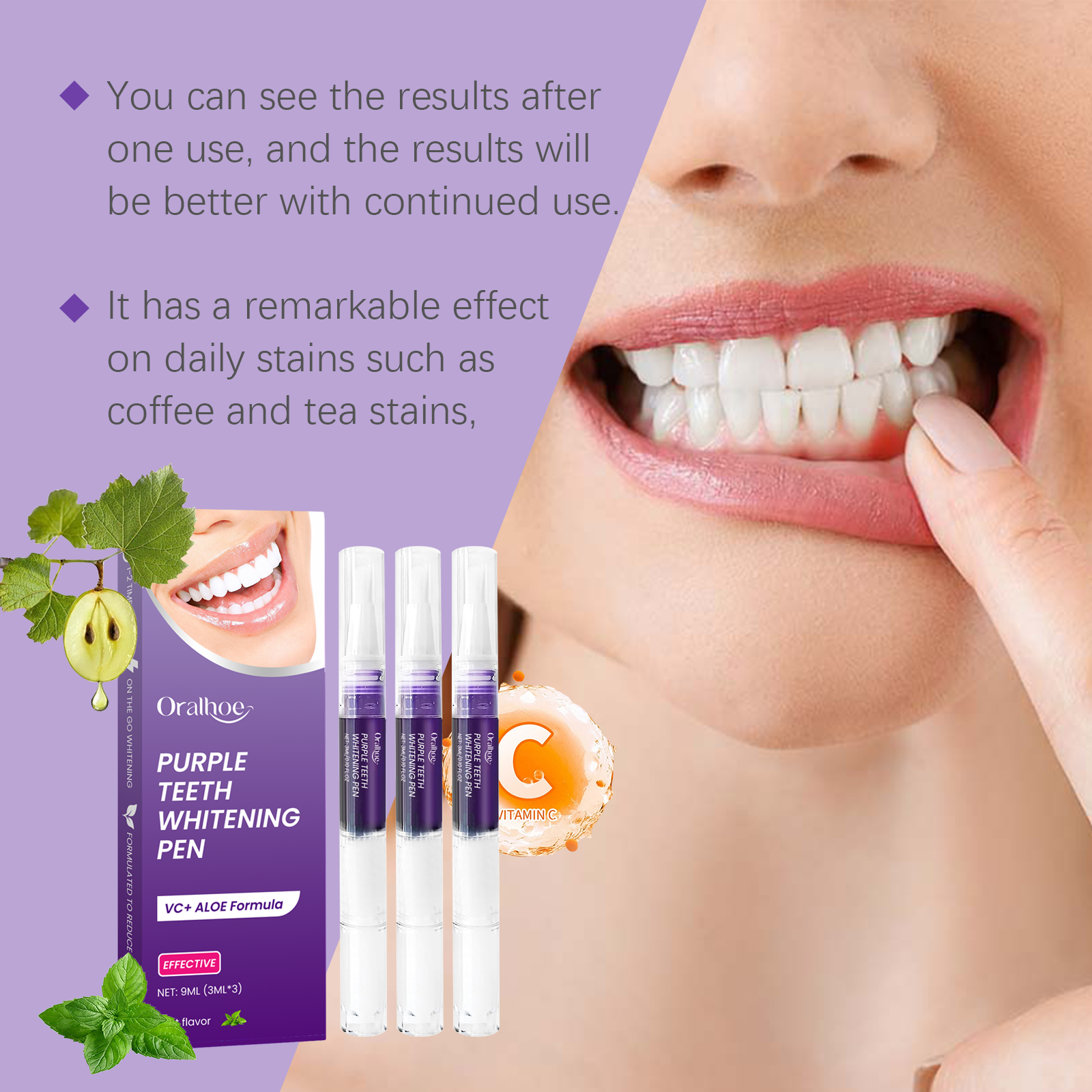我们的紫色牙齿护理笔,由维生素C(抗坏血酸)、芦荟叶提取物、薄荷油精心调配而成。专为有助于去除表面污渍,让牙齿看起来容光焕发设计。使用方法极为便捷:1.首先,确保你的牙齿清洁干燥。2.转动笔的底部,挤出适量的液体,轻轻涂抹在每颗牙齿上,均匀覆盖。然后等它变干。并且无需复杂的操作,简单易用,满足快节奏生活的需要。使用后清新的薄荷香味,持久清新的口气。