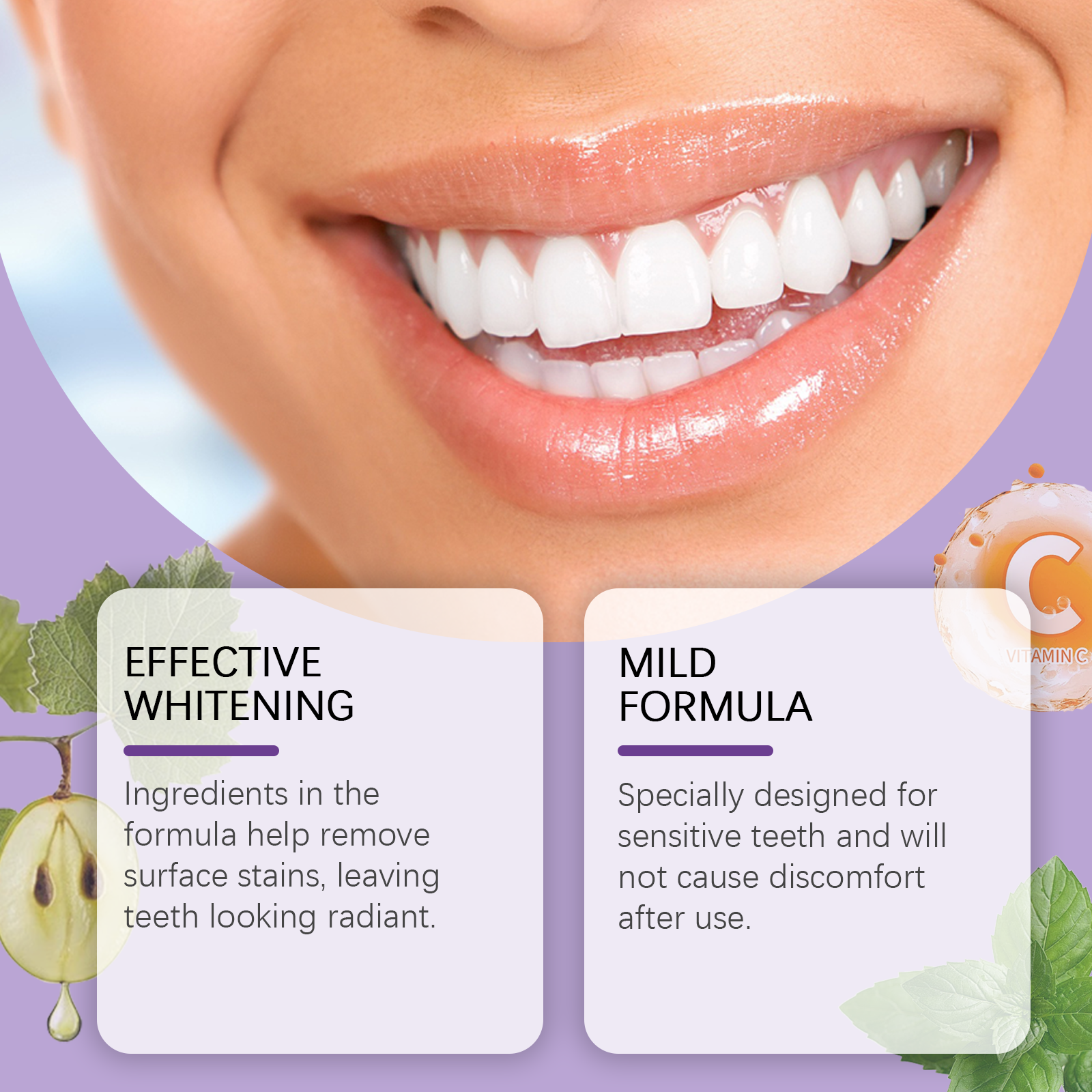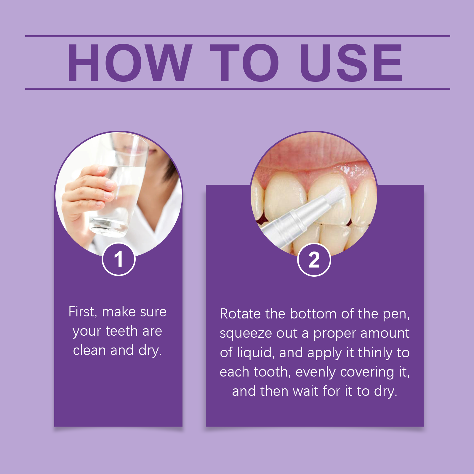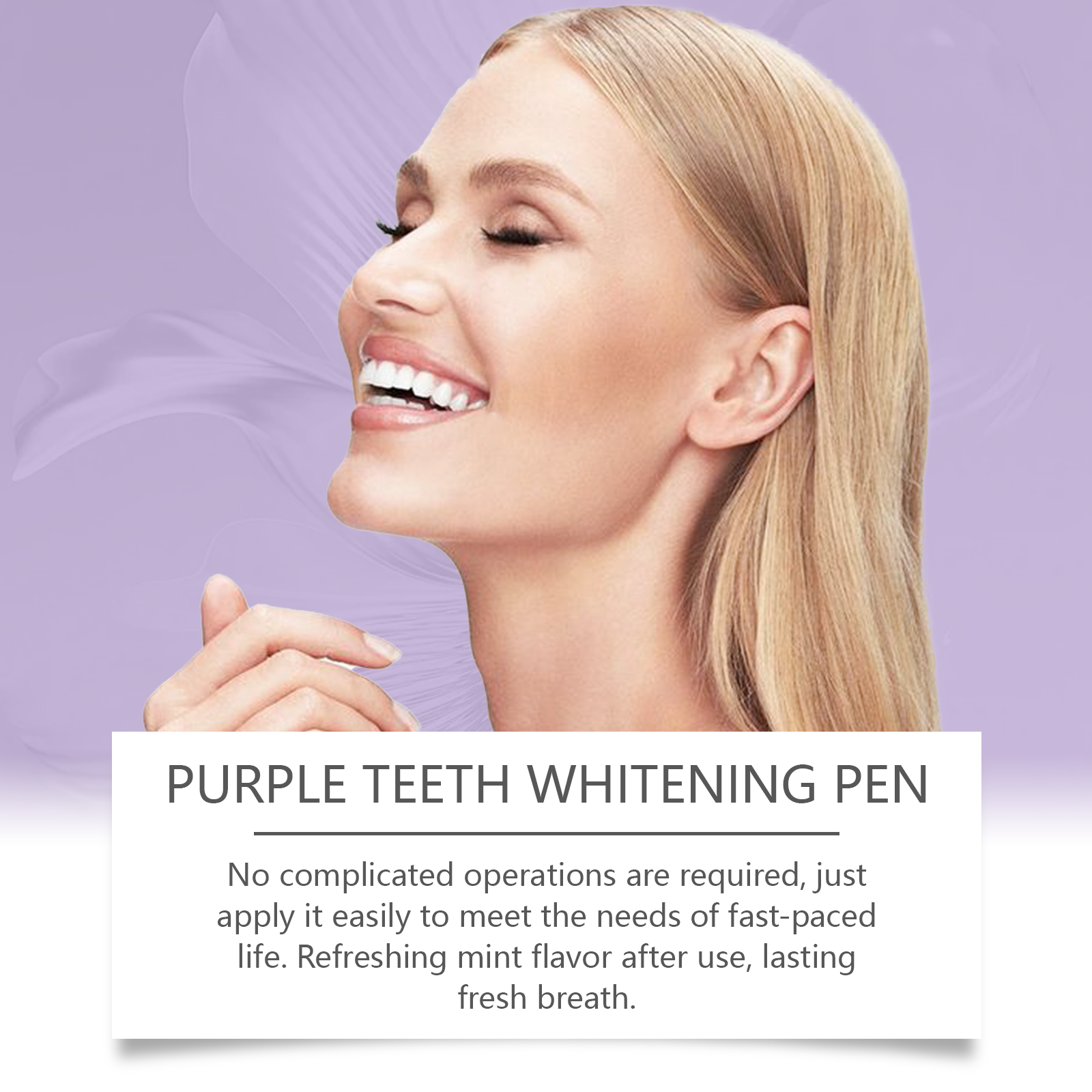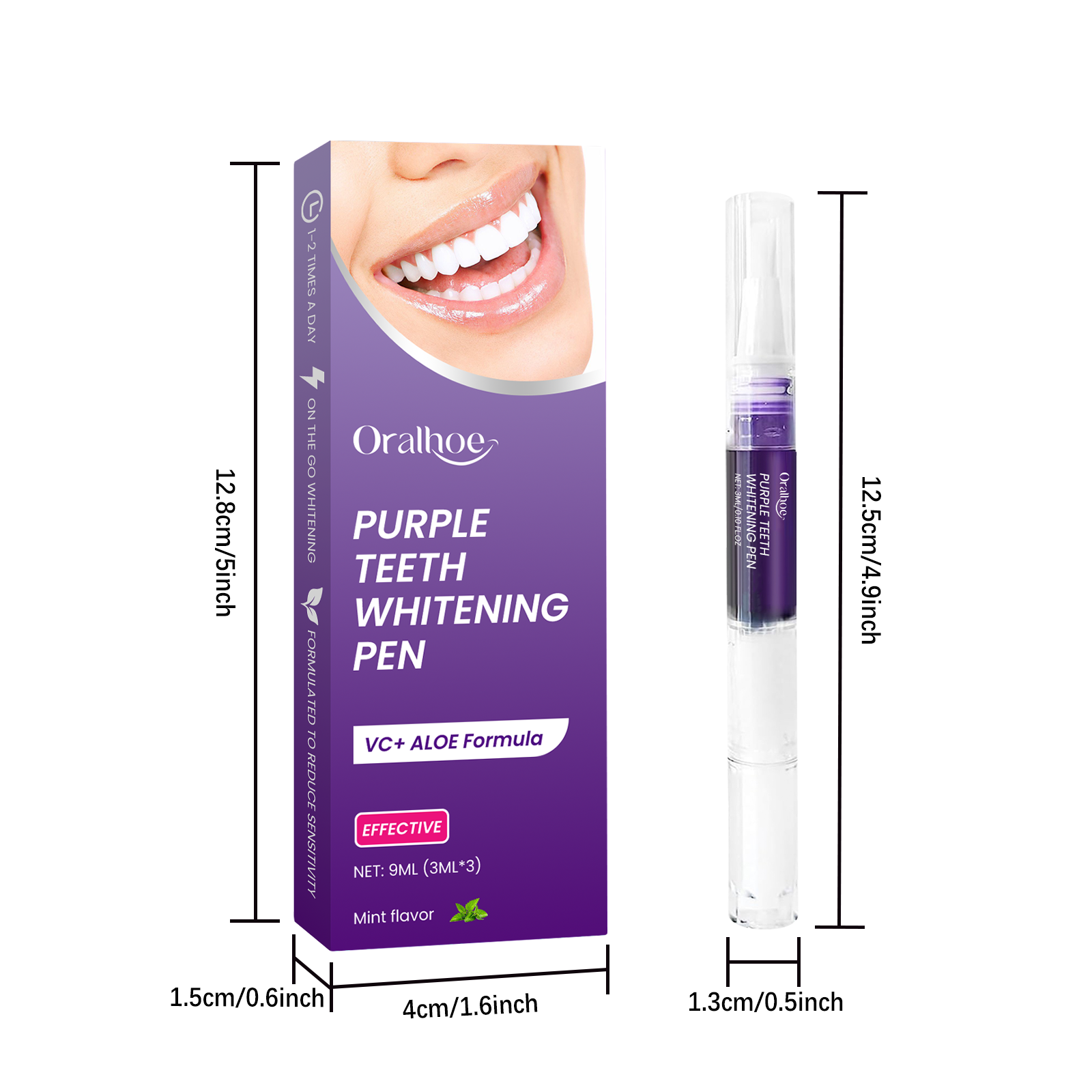 我们的紫色牙齿护理笔,由维生素C(抗坏血酸)、芦荟叶提取物、薄荷油精心调配而成。专为有助于去除表面污渍,让牙齿看起来容光焕发设计。使用方法极为便捷:1.首先,确保你的牙齿清洁干燥。2.转动笔的底部,挤出适量的液体,轻轻涂抹在每颗牙齿上,均匀覆盖。然后等它变干。并且无需复杂的操作,简单易用,满足快节奏生活的需要。使用后清新的薄荷香味,持久清新的口气。