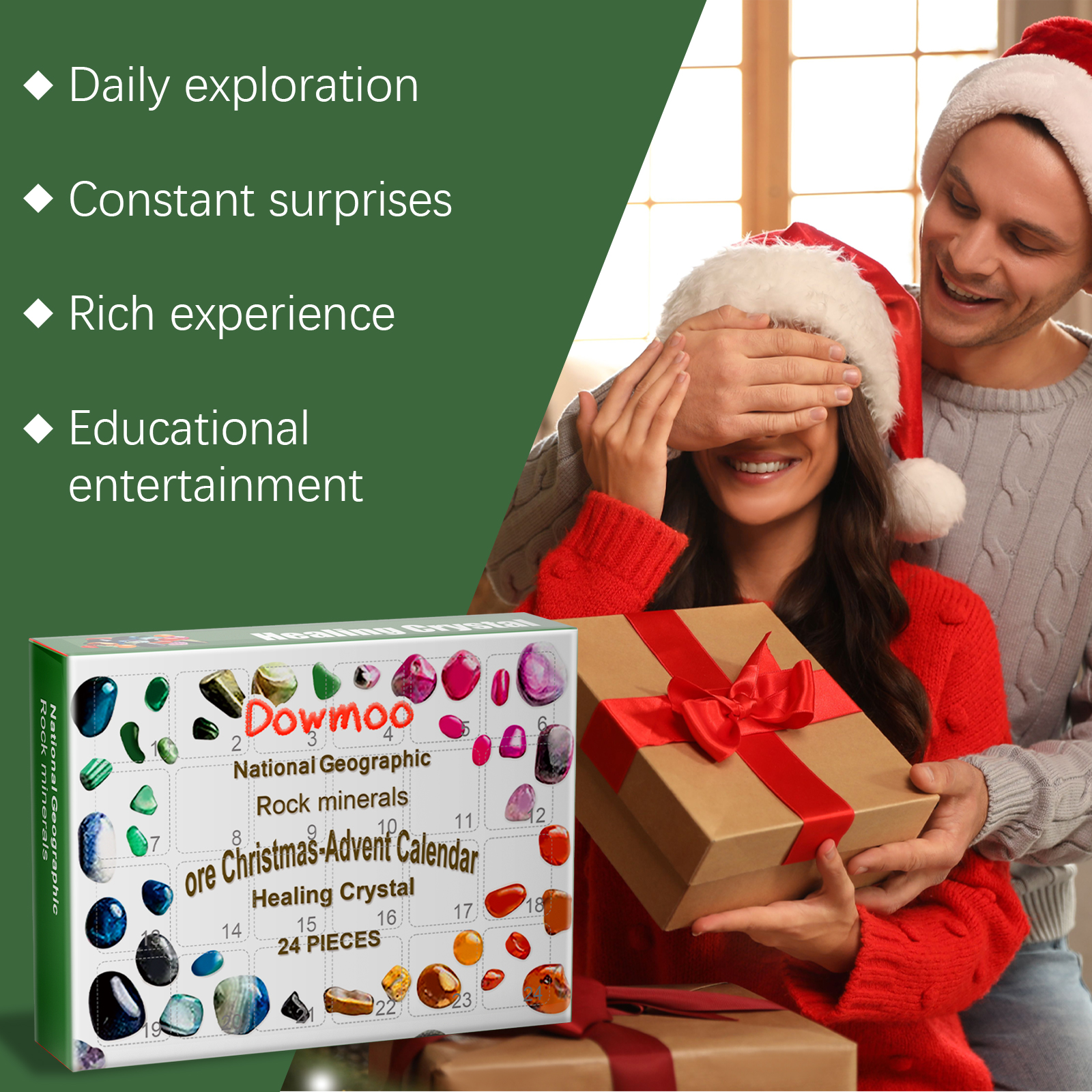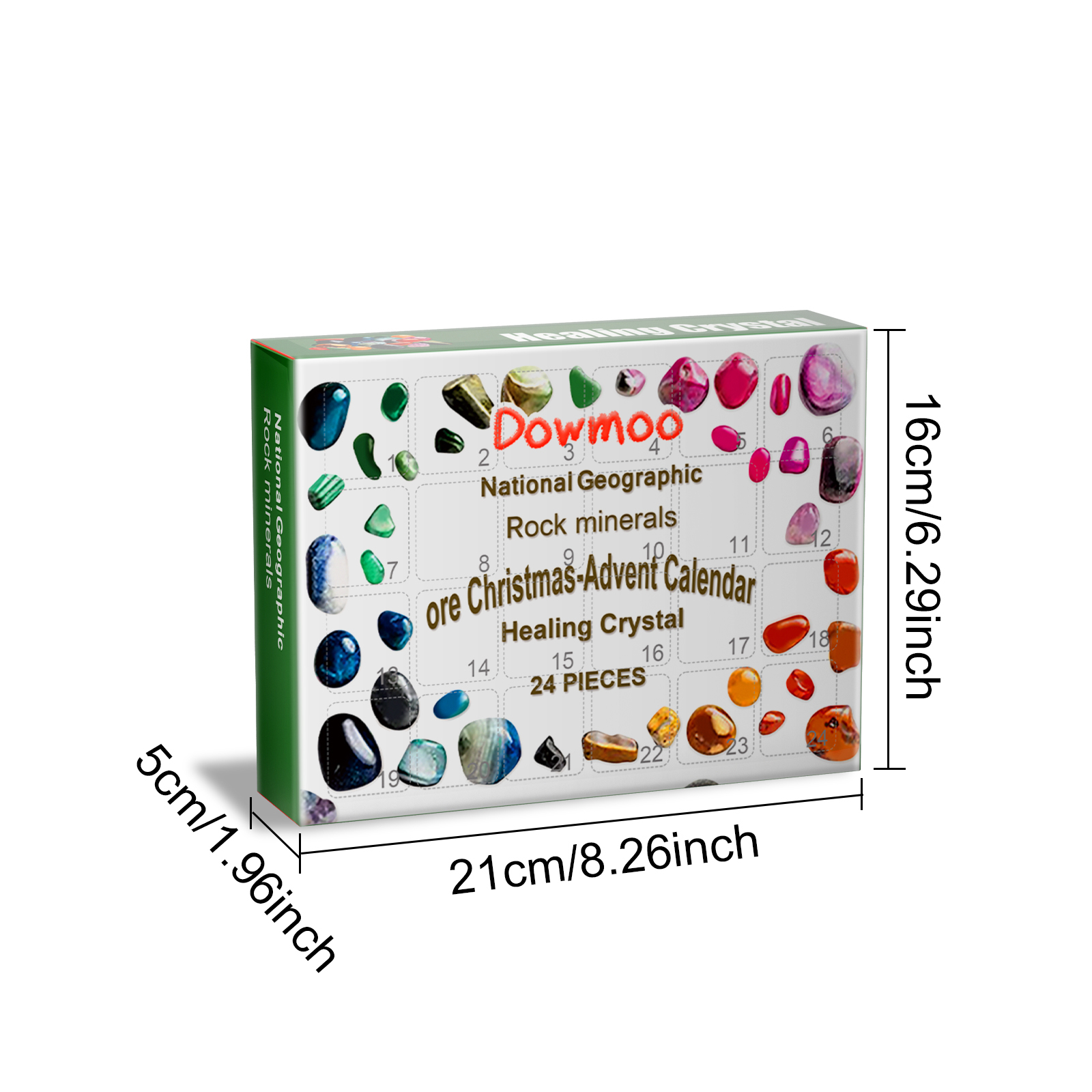 我们的24格矿石盲盒,由水晶原石精心调配而成。专为给孩子们带来圣诞节的乐趣,而倒计时盲箱的开箱方式充满了期待和惊喜设计。使用方法极为便捷:1.礼品盒里一共有24个盒子。每天都有一个新盒子按照倒计时的顺序打开。2.从一天的网格中取出矿石。每个网格中都有美丽的矿石。注意矿石的颜色、形状和特征。并且礼品盒里装着形状各异的精美石头,可以教育和娱乐孩子,增加他们的地质知识。