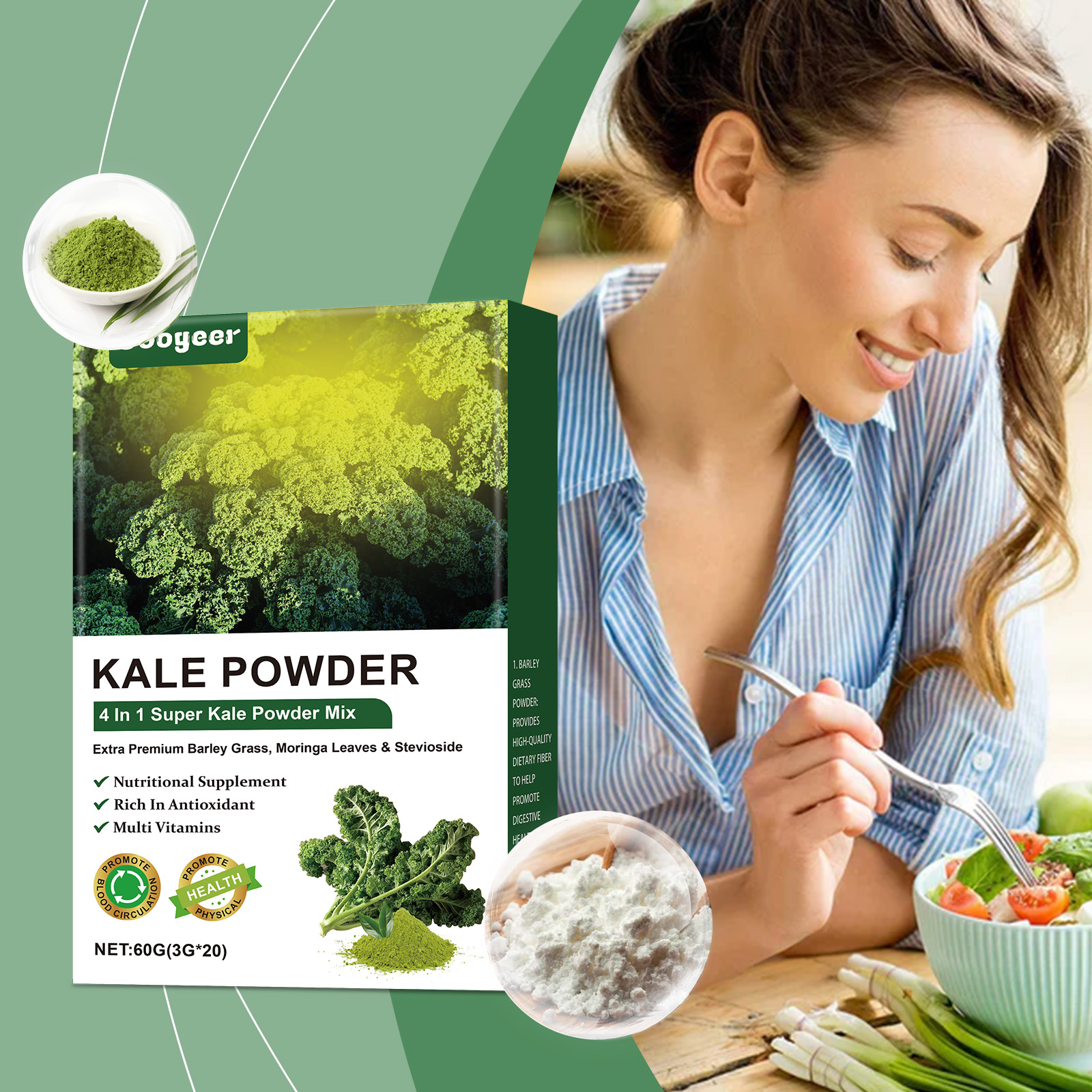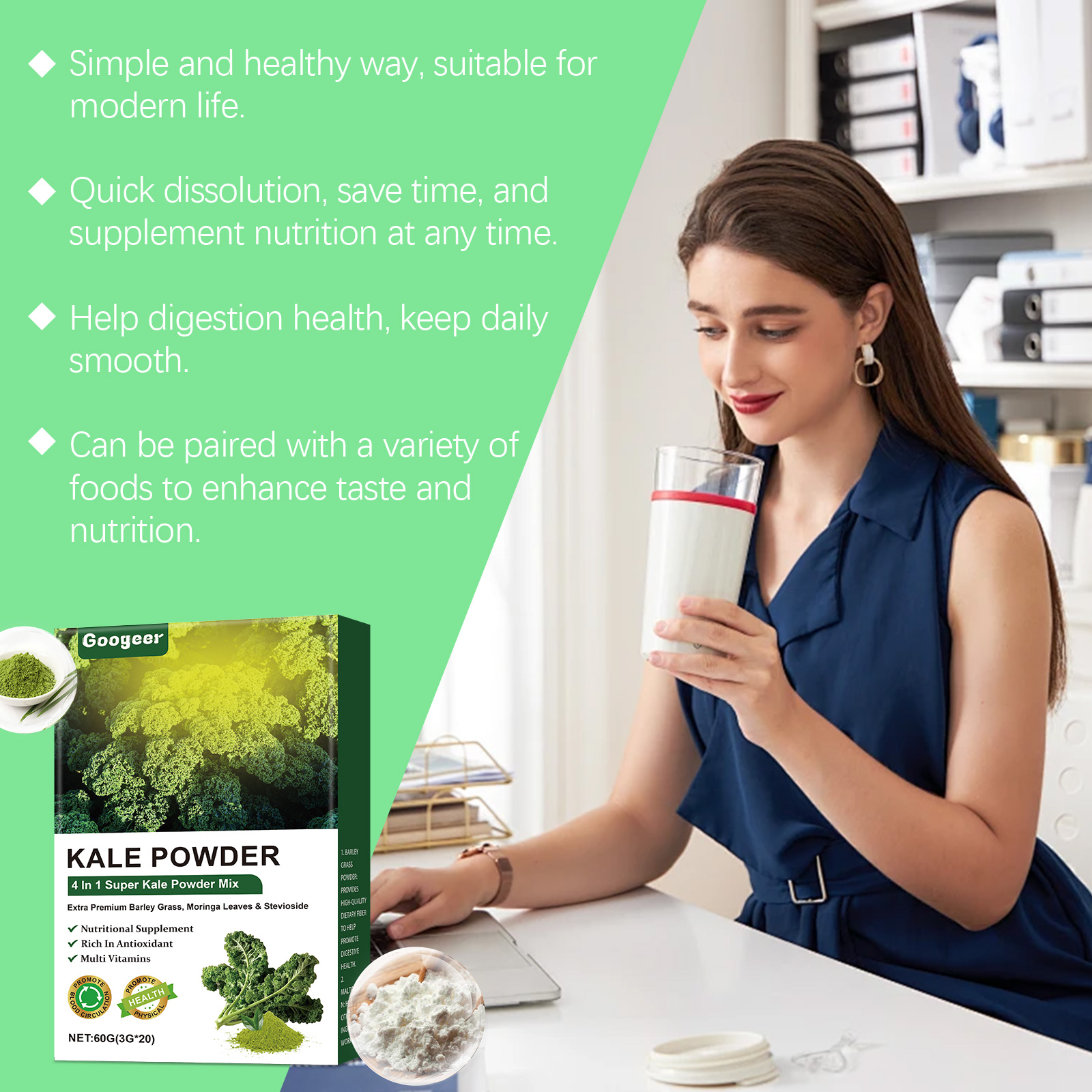 我们的羽衣甘蓝粉,由麦苗粉、麦芽糊精精心调配而成。专为帮助促进消化系统健康设计。使用方法极为便捷:取一包本品,将粉末倒入杯中,加入90度左右的热水,搅拌均匀即可饮用。并且可添加到各种饮料和食品中,以提高营养价值。