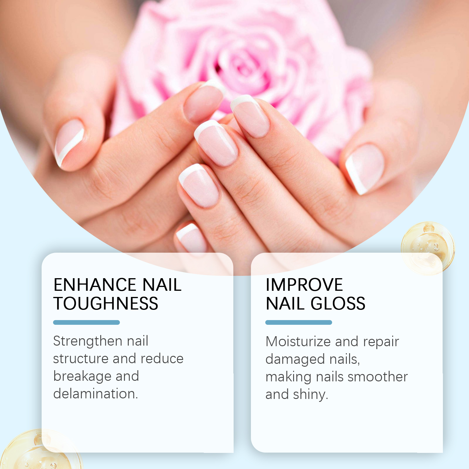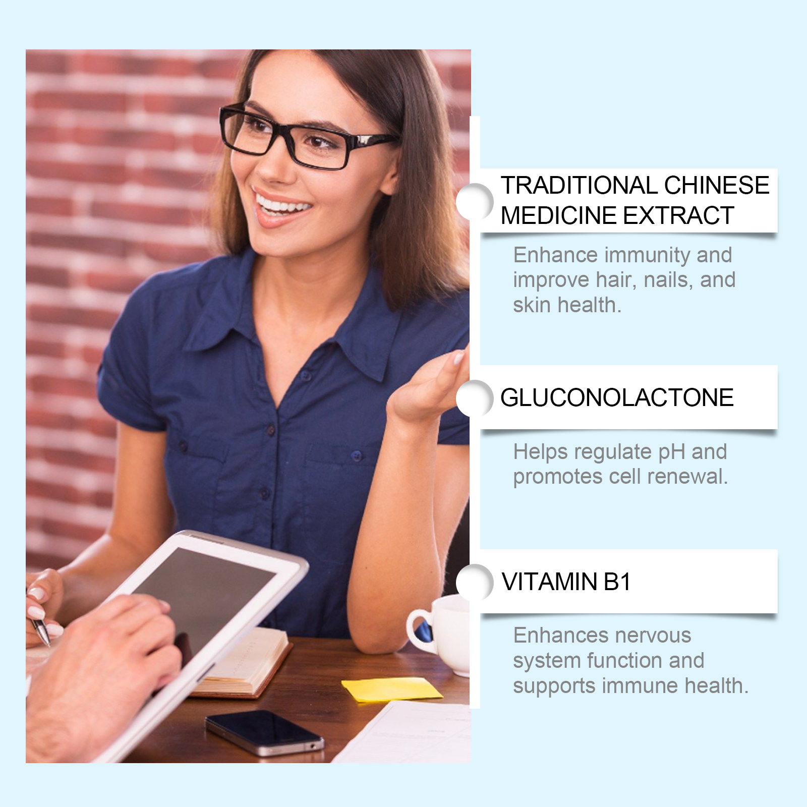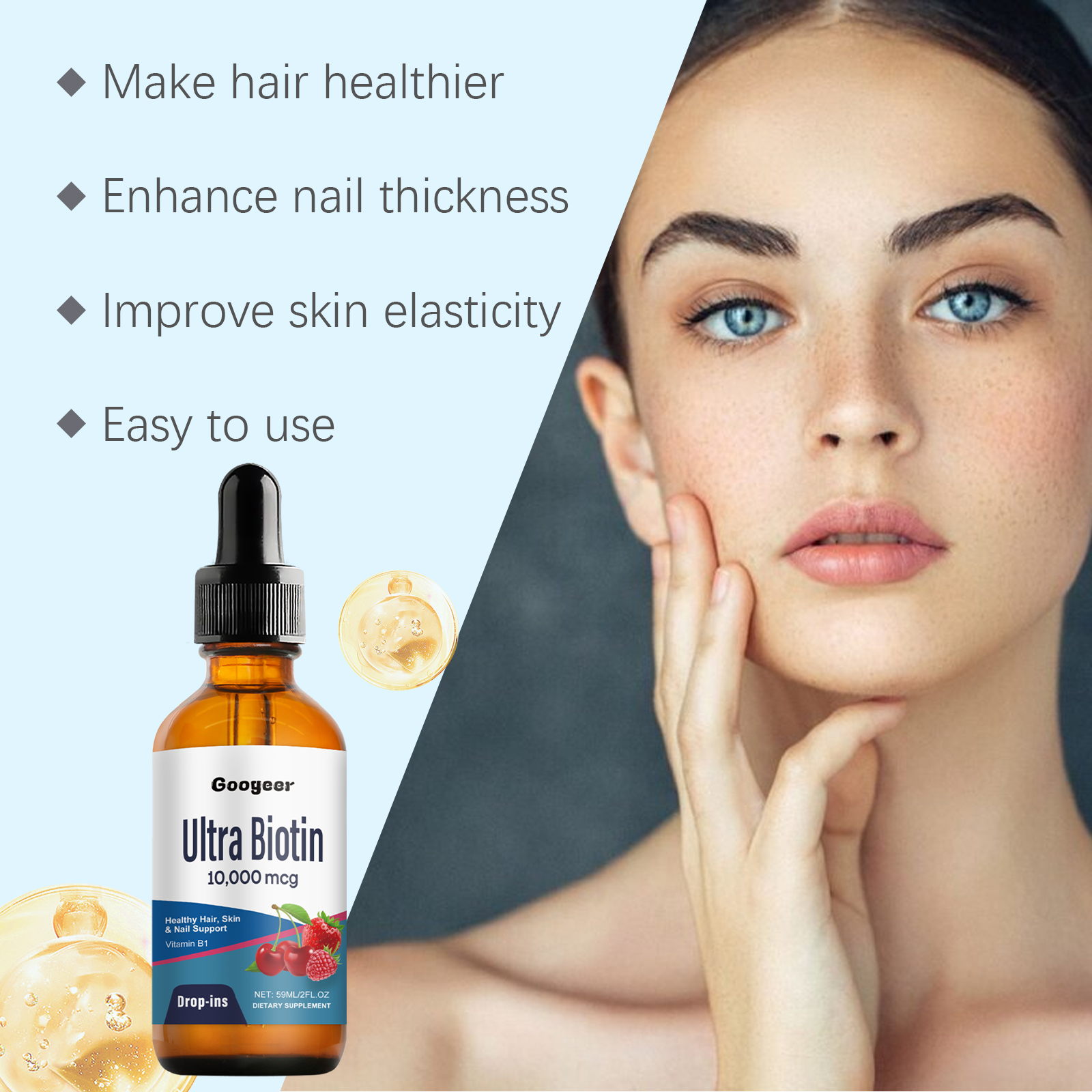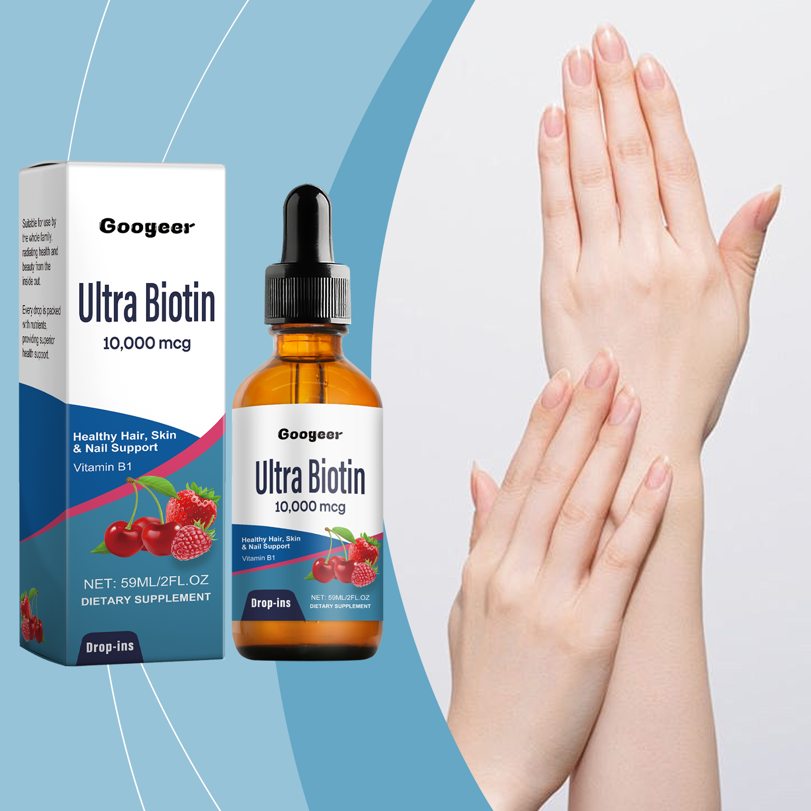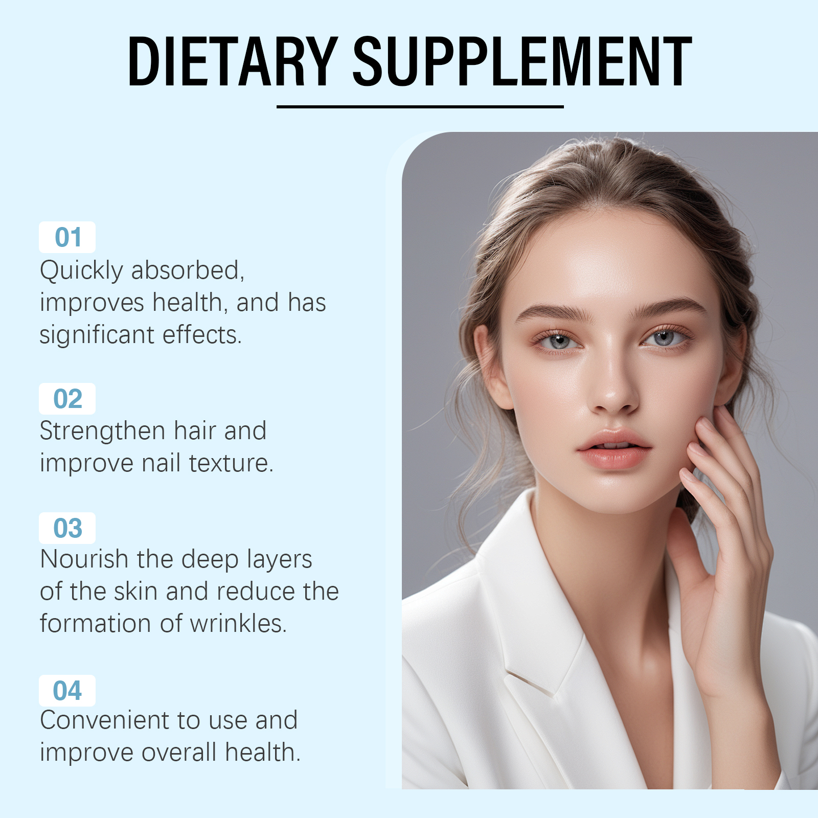 我们的膳食补充剂含有中药提取物、葡萄糖酸内脂、维生素b1。它可以强化指甲结构,减少指甲断裂和脱层。滋润和修复受损指甲,使指甲光滑有光泽。它的使用方法很简单:食用前请摇匀,每次1-2滴,每日1-2次。深层滋养,减少头发断裂和分叉。适合全家使用,由内而外散发健康与美丽。