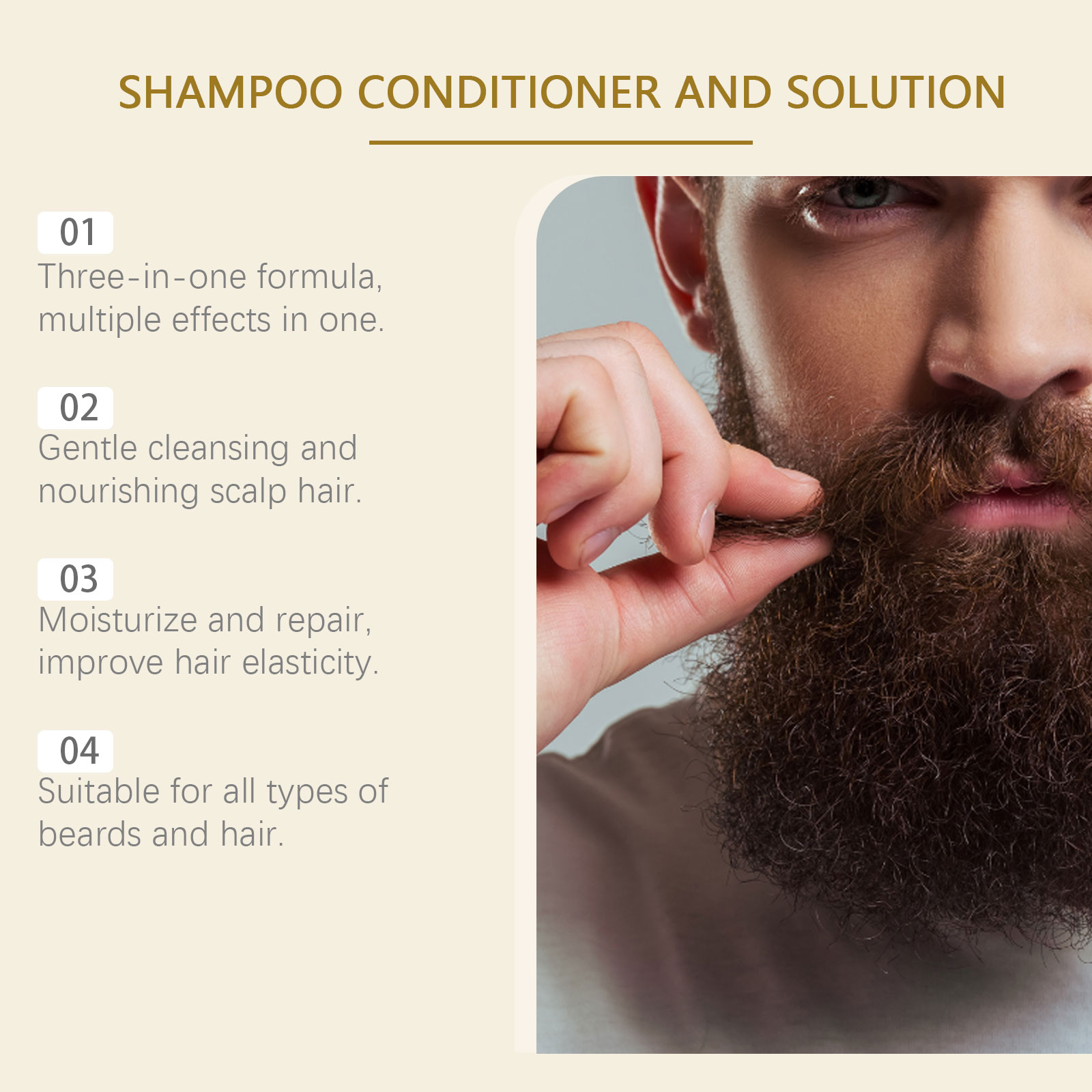 我们的3合1胡须护发剂含有摩洛哥坚果油、椰油酰胺丙基甜菜碱。它可以滋润头发,防止破裂,改善胡须健康。它的使用方法很简单:用温水湿润头发和胡须,将适量洗发水调理剂和溶液涂抹在湿发和胡须上,轻轻按摩头发和胡须,使其产生丰富的泡沫,按摩1-2分钟后用清水彻底冲洗干净。并且可以深层修复和改善胡须光泽。