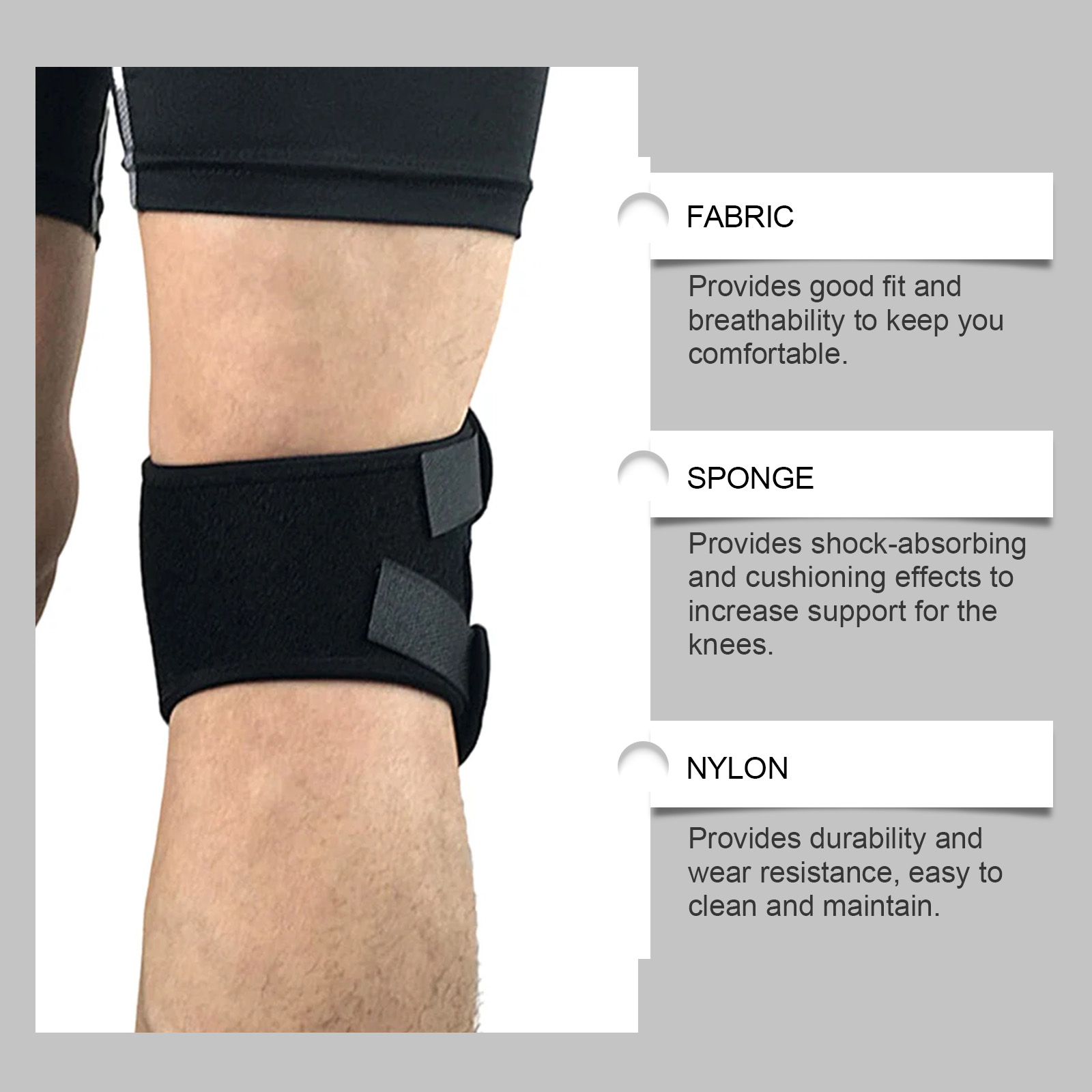 我们的黑色护膝支撑带含有海绵30%、尼龙30%。它可以改善步态,使行走更加稳定和舒适。它的使用方法很简单:清洁膝盖表面并保持干燥,将本品固定在膝盖上,调整紧度,使其贴合在膝盖部位。并且可以提供稳定的支持,减轻膝盖的负担,缓解站立时的压力,提高舒适度。