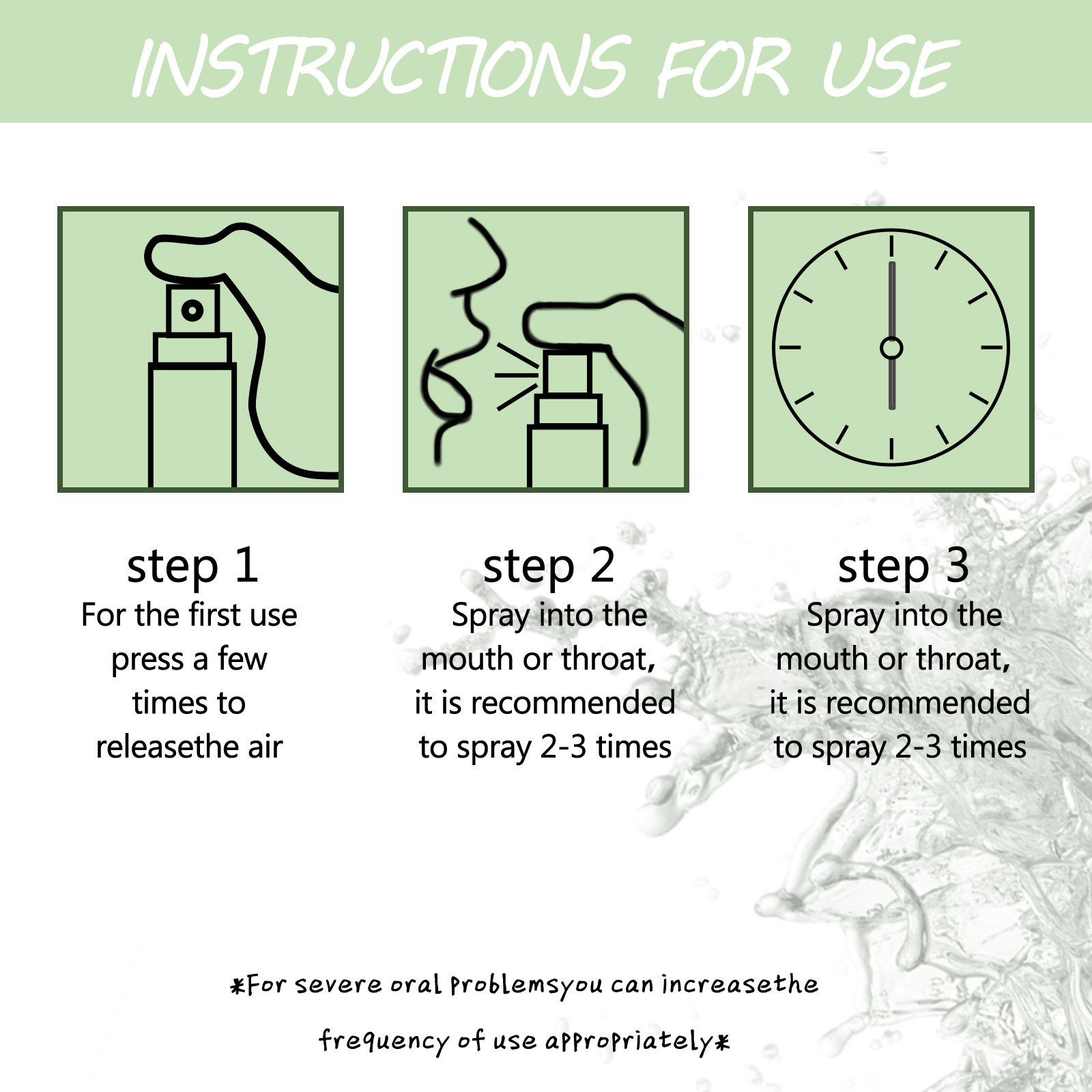 我们的口气清新剂含有山梨醇,木糖醇,薄荷醇。它可以去除改善口腔异味、臭味,清新口气,自然清香,持久清新。它的使用方法很简单:第一次使用按几次释放空气,喷入口腔或喉咙,建议喷2-3次。抑制口腔细菌,不辣,不干,口气清爽,留香净味,调理口腔环境。