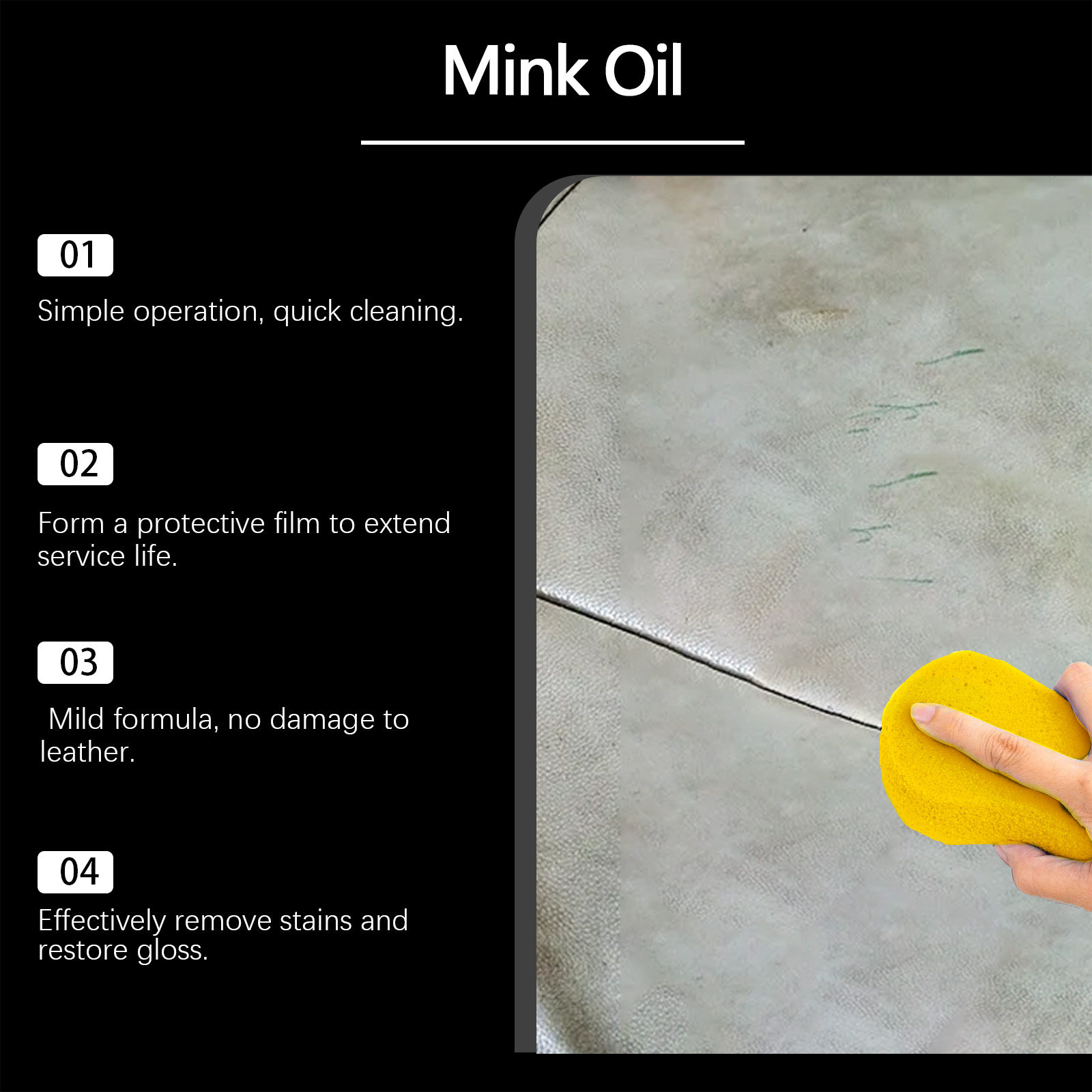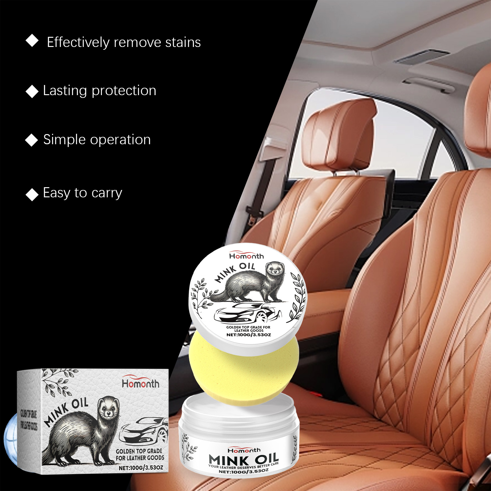我们的汽车皮革护理清洁膏含有貂油、蜂蜡。它可以有效去除污渍,深度清洁皮革。它的使用方法很简单:将适量产品倒在海绵上,来回擦拭需要护理的部位,直到皮革表面变得有光泽。并且可以恢复皮革的原始颜色和质地,给内部一个新的外观。