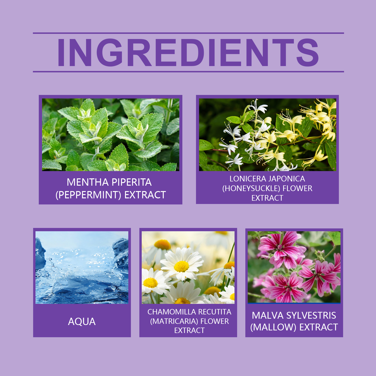 | 成分 | 薄荷提取物、金银花提取物、洋甘菊提取物 |