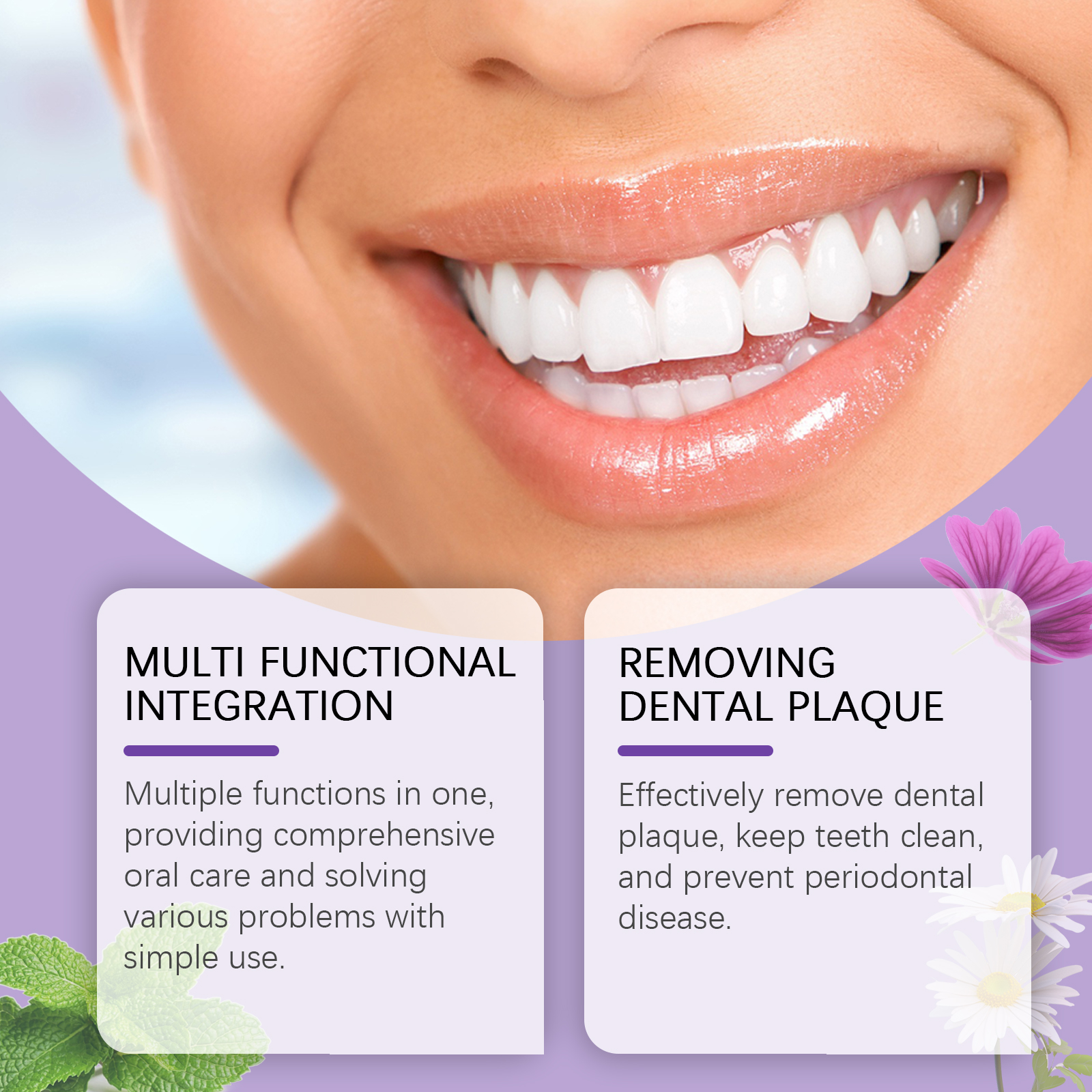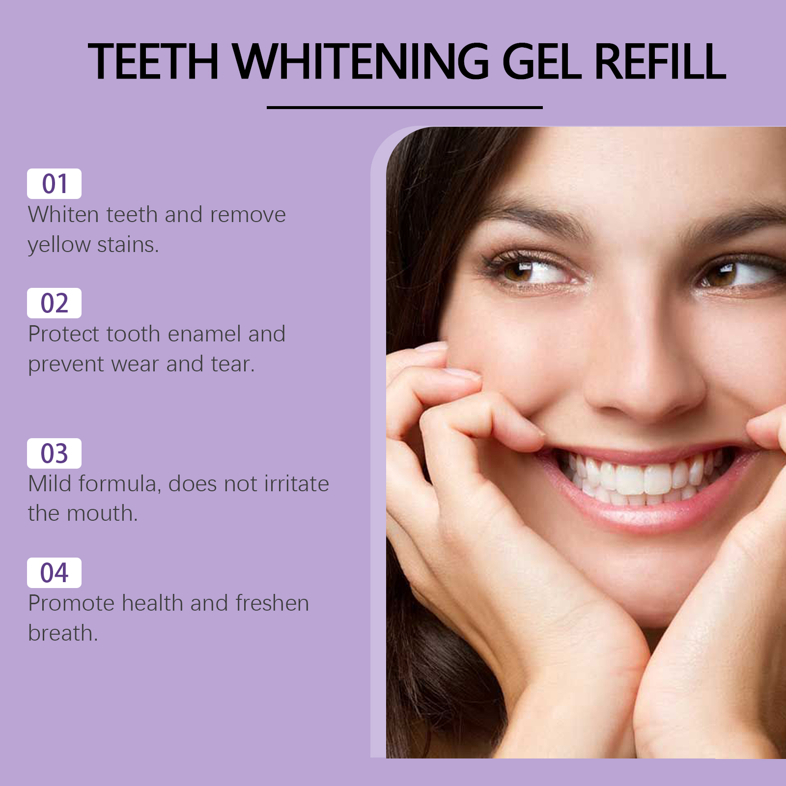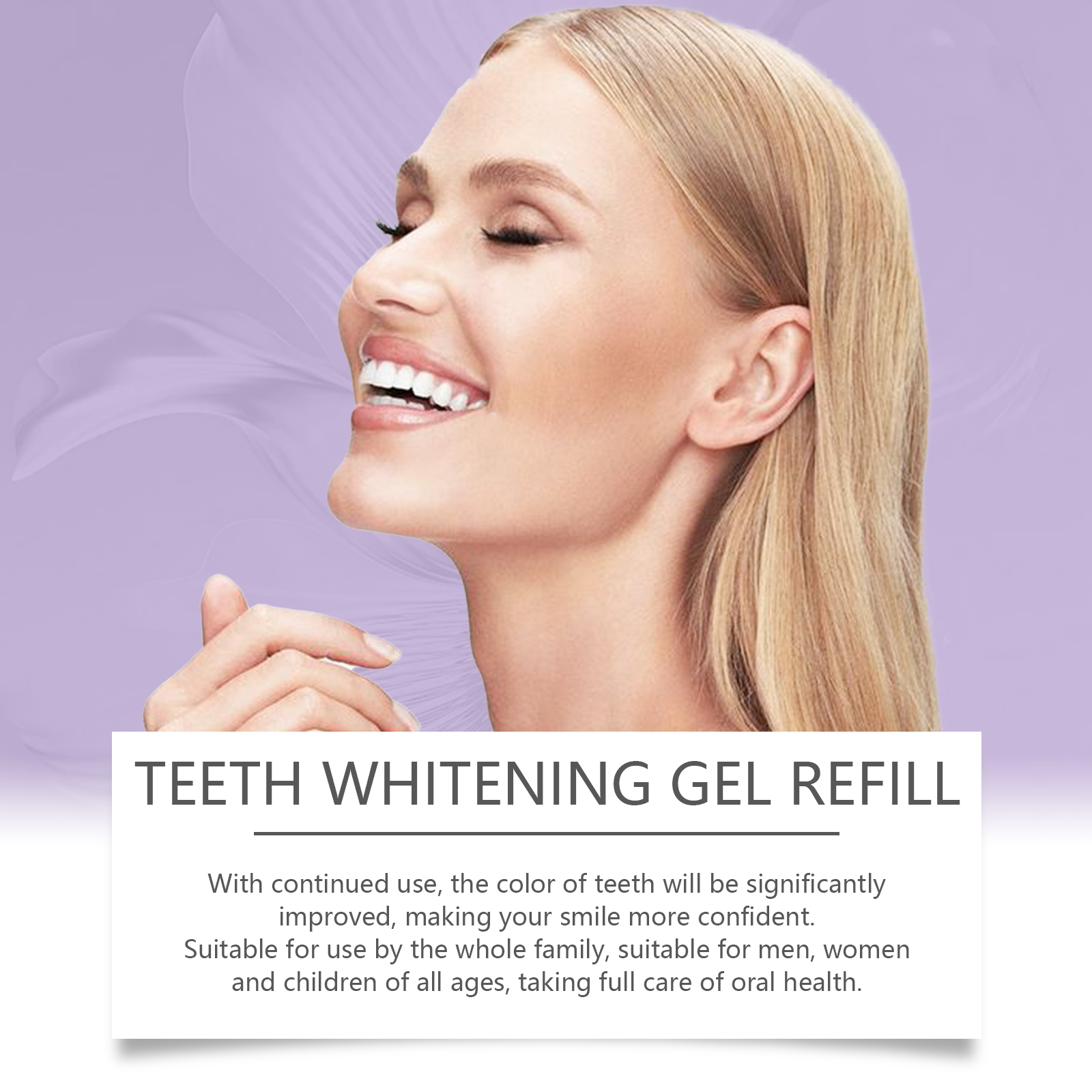 我们的牙齿清洁凝胶含有薄荷提取物、金银花提取物、洋甘菊提取物。它可以提供全方位口腔护理,有效清除牙菌斑,保持牙齿清洁,预防牙周病。它的使用方法很简单:1.清洁口腔;2.将凝胶滴在牙齿表面和牙缝处,等待30分钟,然后漱口。持续使用,牙齿的颜色会明显改善,让你的笑容更自信。适合全家使用,男女老少皆宜,充分呵护口腔健康。