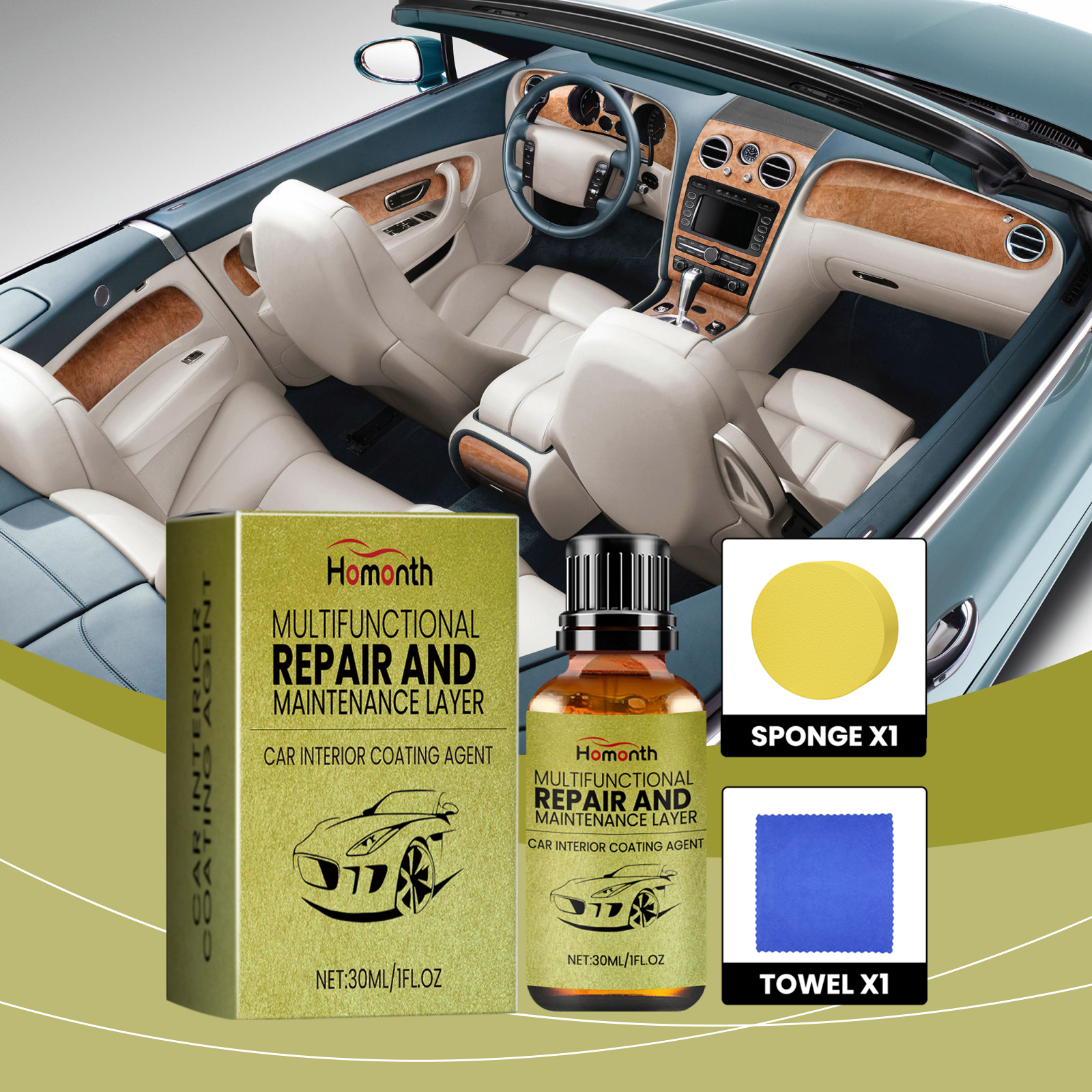 我们的汽车内饰修护涂层套件含有去离子水、纳米硅、甲基硅油。它可以提高涂层韧性,适应温度变化。耐磨,抗日常磨损,延长涂层寿命。它的使用方法很简单:保持表面清洁干燥,将适量本品倒在海绵上,在需要的表面上来回擦拭,最后用毛巾擦去残留物。恢复塑件原色,产生亮丽光泽。给人平滑的感觉,提高驾驶乐趣。