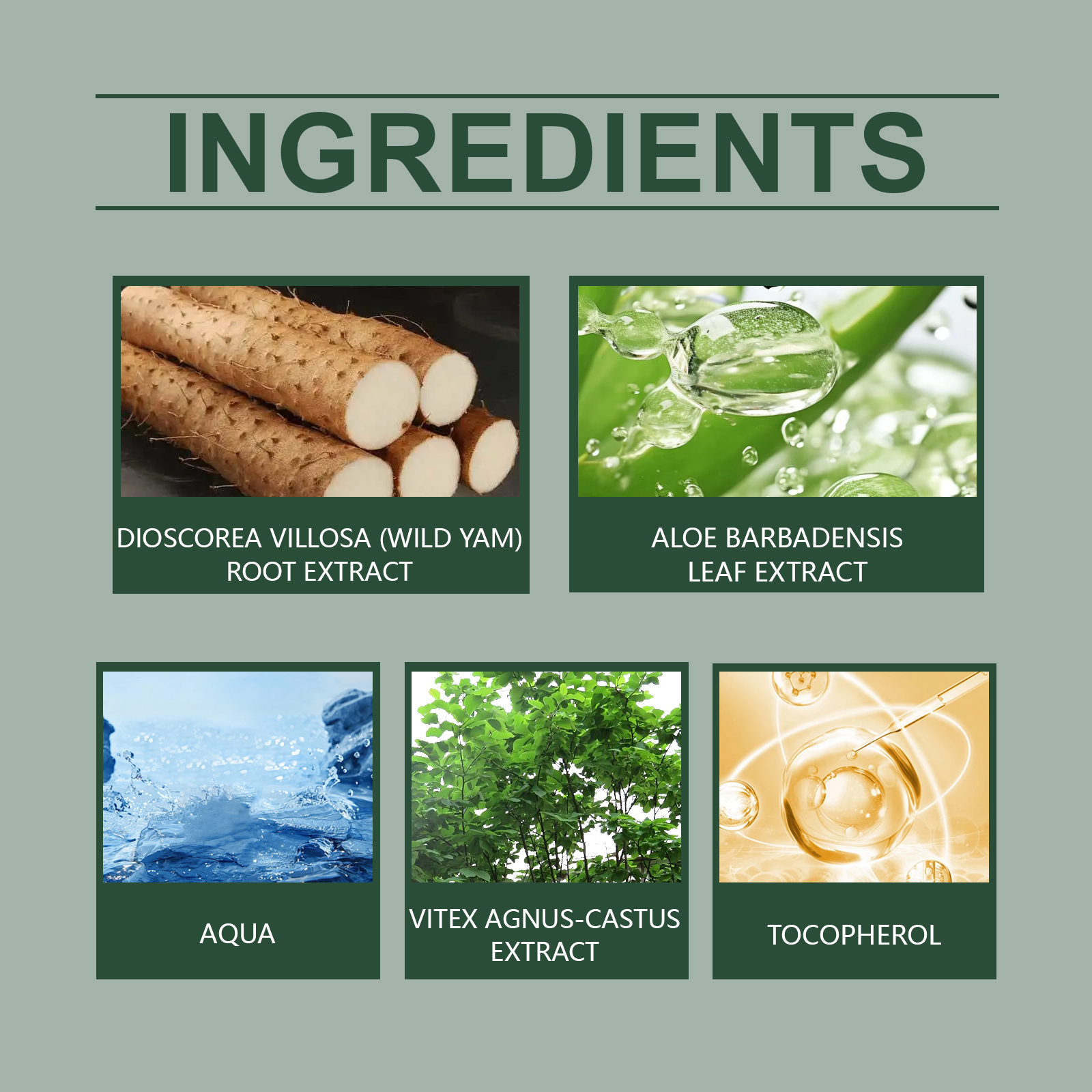 | 成分 | 贞洁树提取物、芦荟叶提取物、生育酚 |