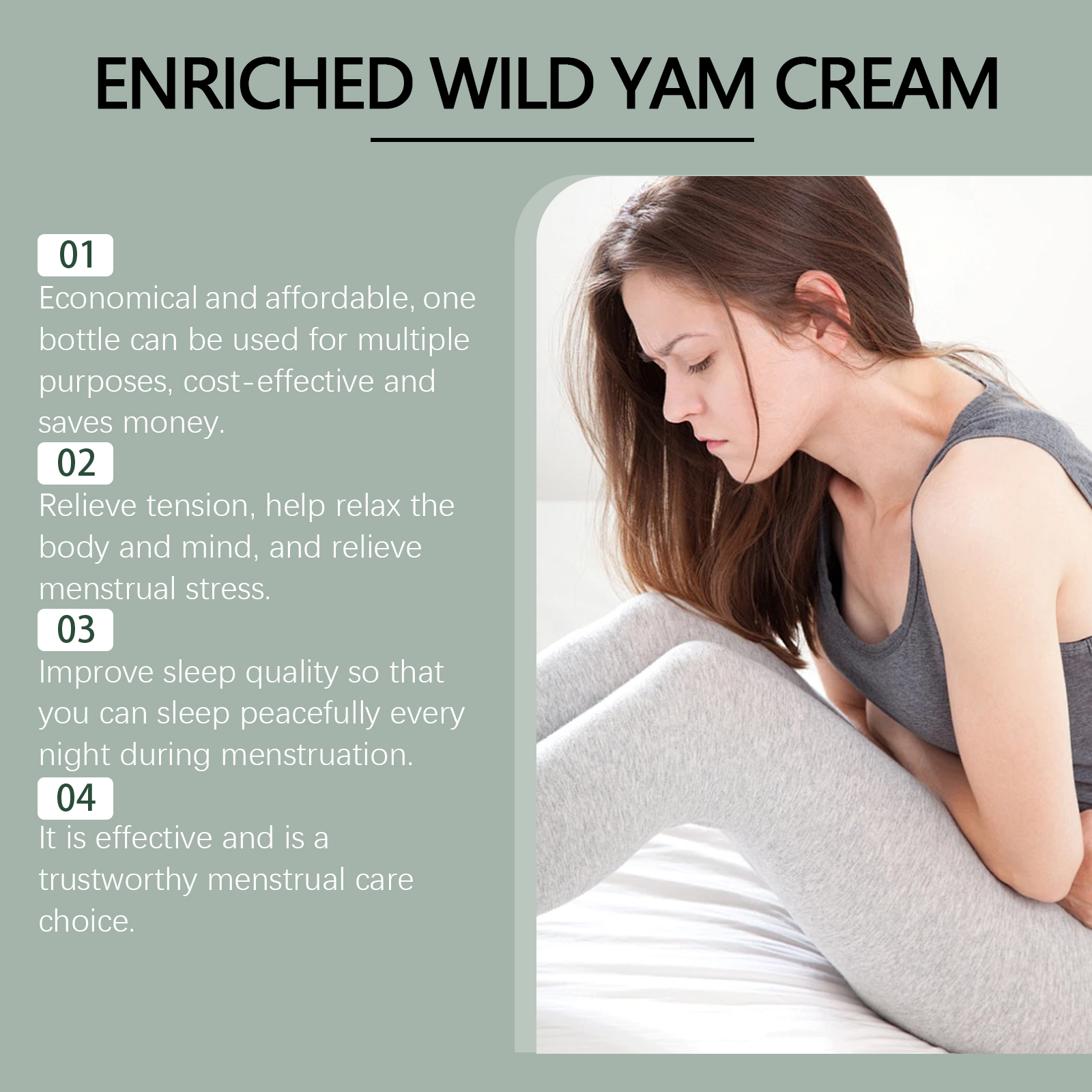 我们的山药霜含有芦荟叶提取物、生育酚。它可以调节月经周期,改善月经不调,并使其每个月都更容易。它的使用方法很简单:彻底清洁身体皮肤,并先将其干燥,取适量本品均匀涂抹于胸部、颈部、腹部、内臂、大腿等身体皮肤部位,轻轻按摩直至完全吸收。并且无刺激性,安全可靠。
