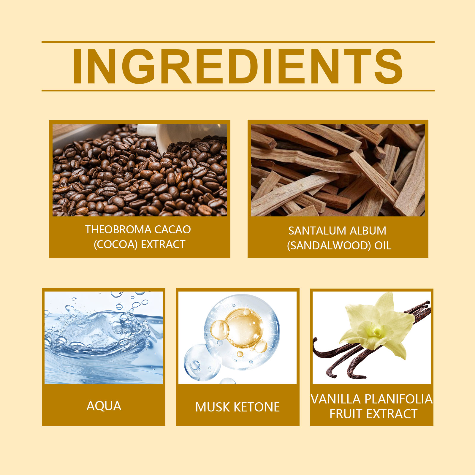 | 成分 | 麝香酮、可可提取物、香草豆提取物 |