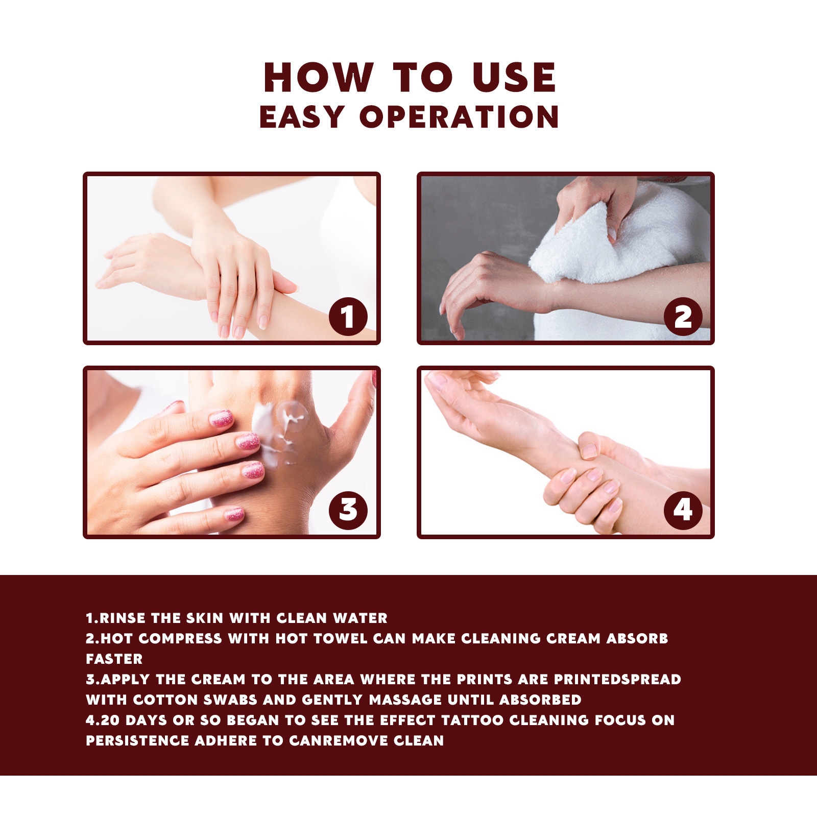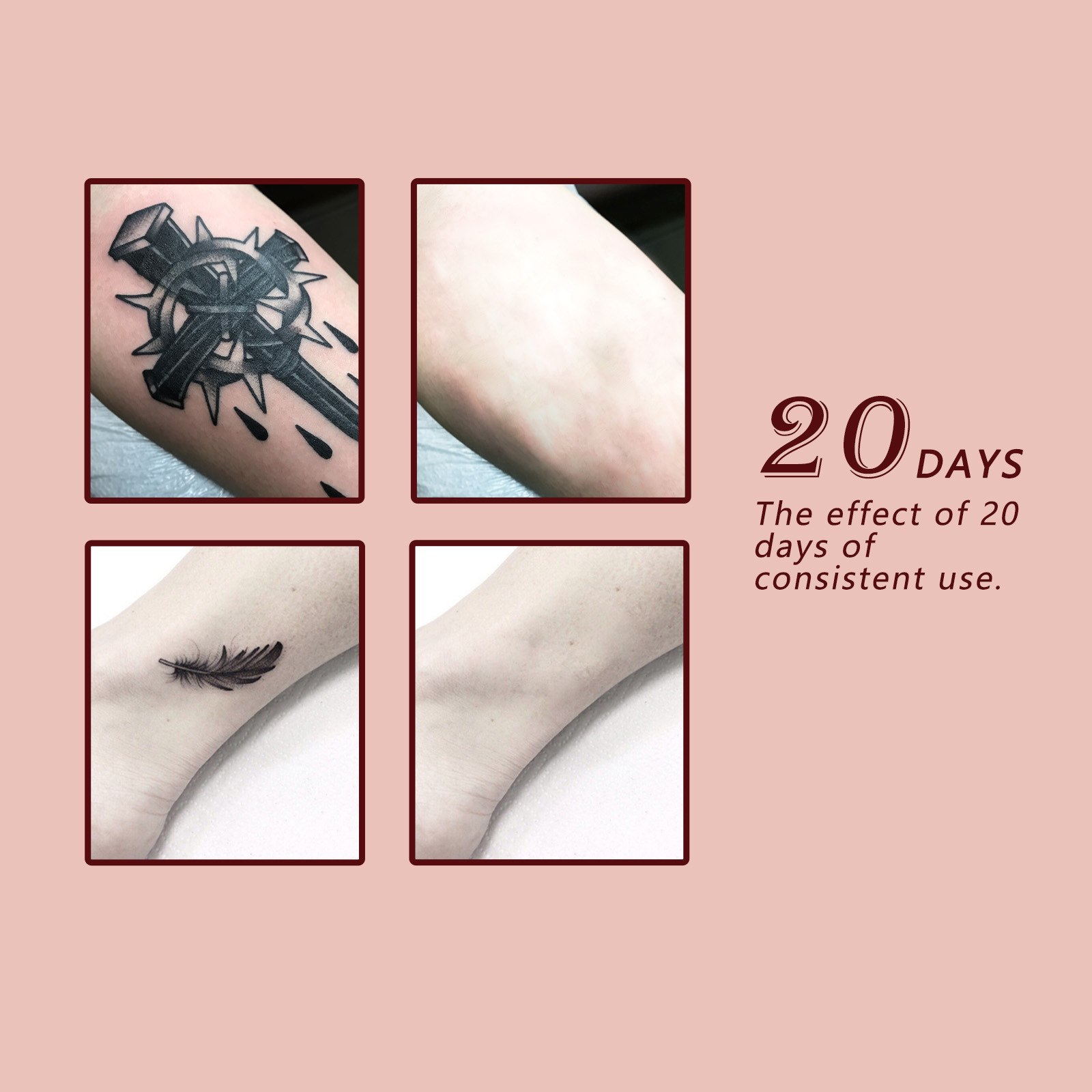 我们的纹印清洗精华膏含有油酸十六酯、芦丁、肉碱。它可以快速去除纹身,修护受损的肌肤,消除皮肤的色素。它的使用方法很简单:首先用清水冲洗皮肤,之后用热毛巾热敷可以使清洁霜吸收更快,将修护膏涂抹在印花部位,用棉签涂抹,轻轻按摩至吸收,20天左右开始看到纹身清洗的效果重点坚持坚持就可以去除干净了。使用后有效去除纹身,让你的皮肤恢复成原来的模样,让肌肤更加光滑。