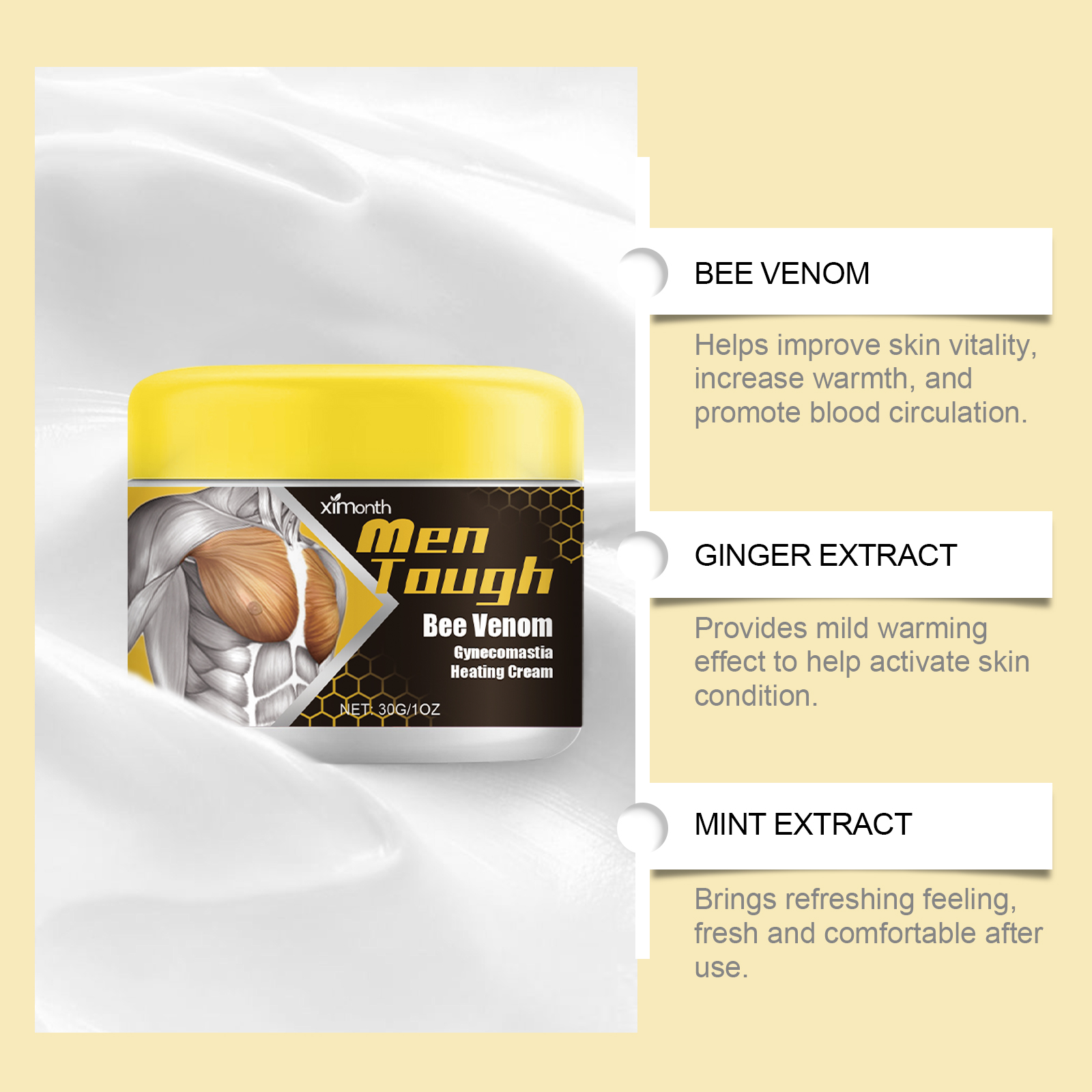 我们的男性乳房护理霜含有甘油、矿油、甘油硬脂酸酯。它可以滋养肌肤,保持肌肤柔软和弹性。它的使用方法很简单:1. 清洁胸部皮肤,保持干燥;2. 取适量本品均匀涂抹于胸部肌肤;3. 轻轻按摩直至完全吸收。姜和蜜蜂毒液的结合带来温和温暖的感觉,促进皮肤活力。蕴含薄荷精华,使用后清爽不粘手,提高舒适度。
