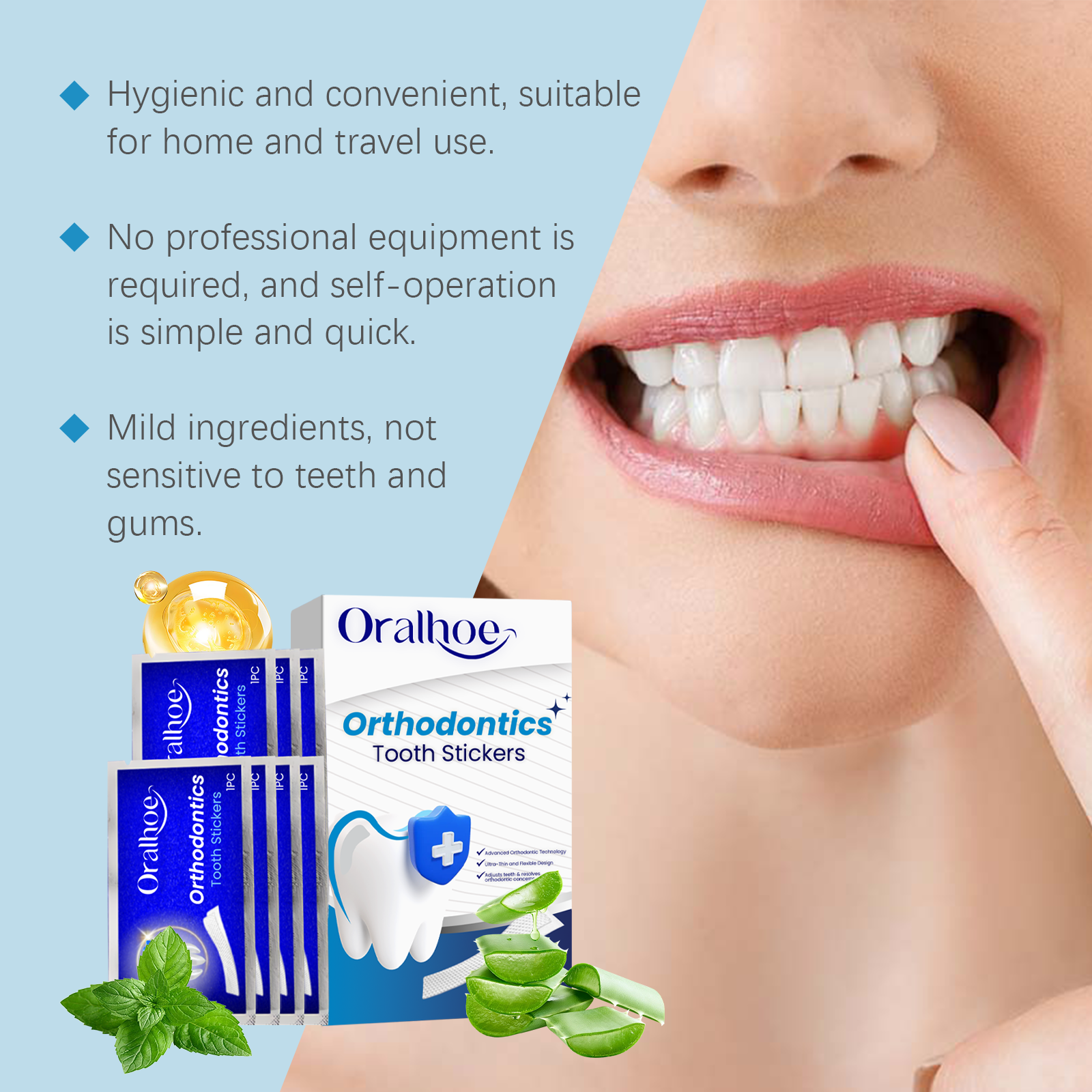 我们的牙齿矫正牙贴含有薰衣草提取物、薄荷提取物、维生素C(抗坏血酸)。它可以带来清新的口气,使用后清爽怡人,有助于逐渐矫正牙齿,改善整体口腔健康,保持牙齿整洁美观。它的使用方法很简单:冲洗完口腔后,将产品的凝胶面贴在牙龈和牙齿上,轻轻按压,确保产品完全粘附在表面。使用后短时间内即可看到明显的美白效果。带着自信的微笑。温和无刺激性,适合敏感牙齿使用。