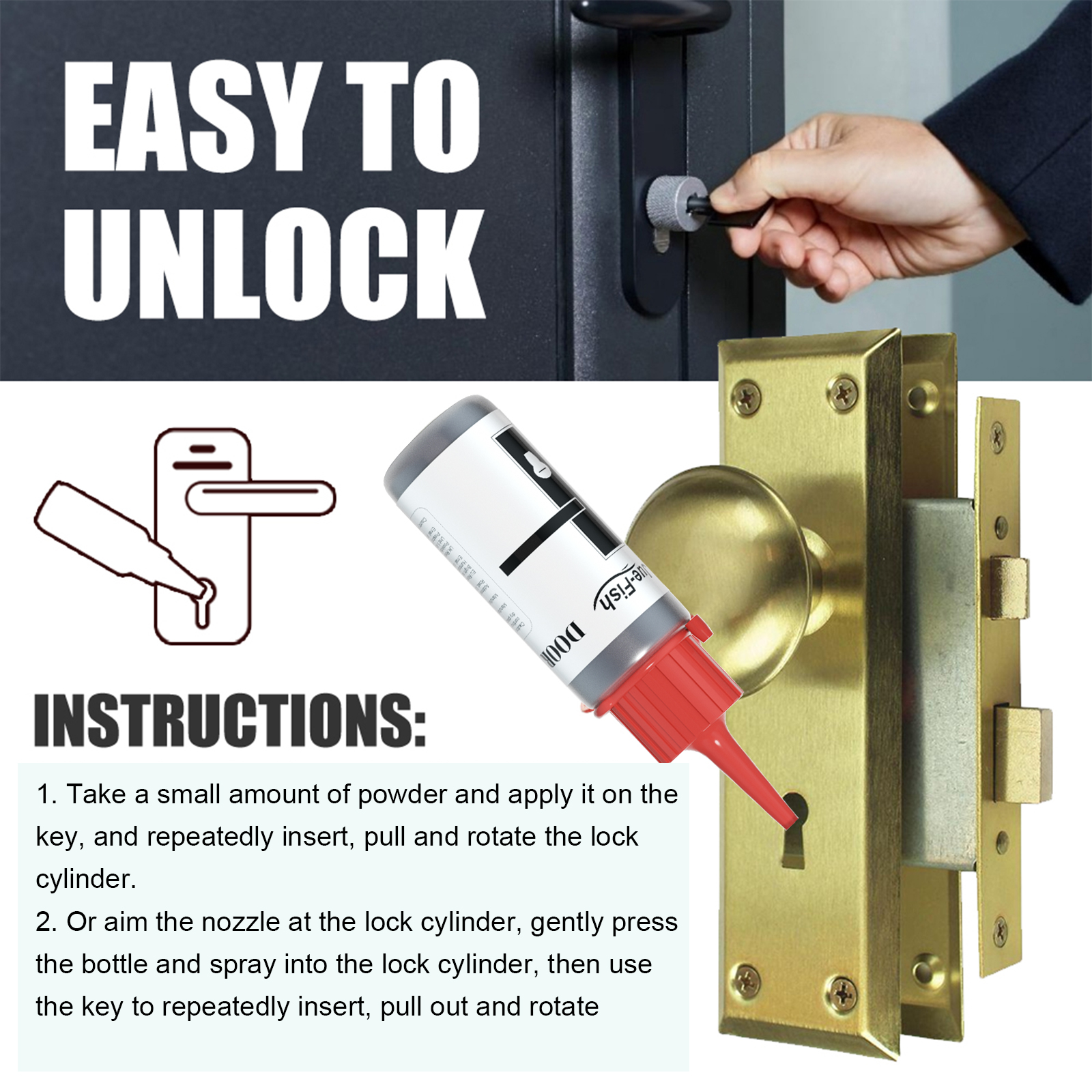 我们的锁芯润滑剂含有石墨粉。它可以缓解恼人的开门与关门吱吱声,门铰链上使用的润滑剂提供持久的保护,防止摩擦和磨损,让你家的门使用更加顺滑。它的使用方法很简单:首先取少量粉末涂抹在钥匙上,反复插入、拉动、旋转锁芯,或将喷嘴对准锁缸,轻轻按压瓶身,喷入锁缸,然后用钥匙反复插入、拔出、旋转即可。使用后让门锁恢复如新,开门与锁门更加轻松,消除发出的杂音,使用更加丝滑。