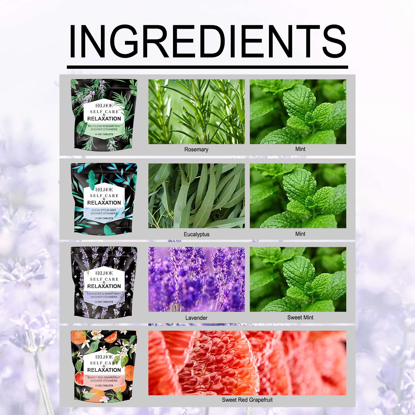 | 成分 | 甜红葡萄柚:甜红葡萄柚;薰衣草:薰衣草、甜薄荷;迷迭香薄荷:迷迭香、薄荷 |