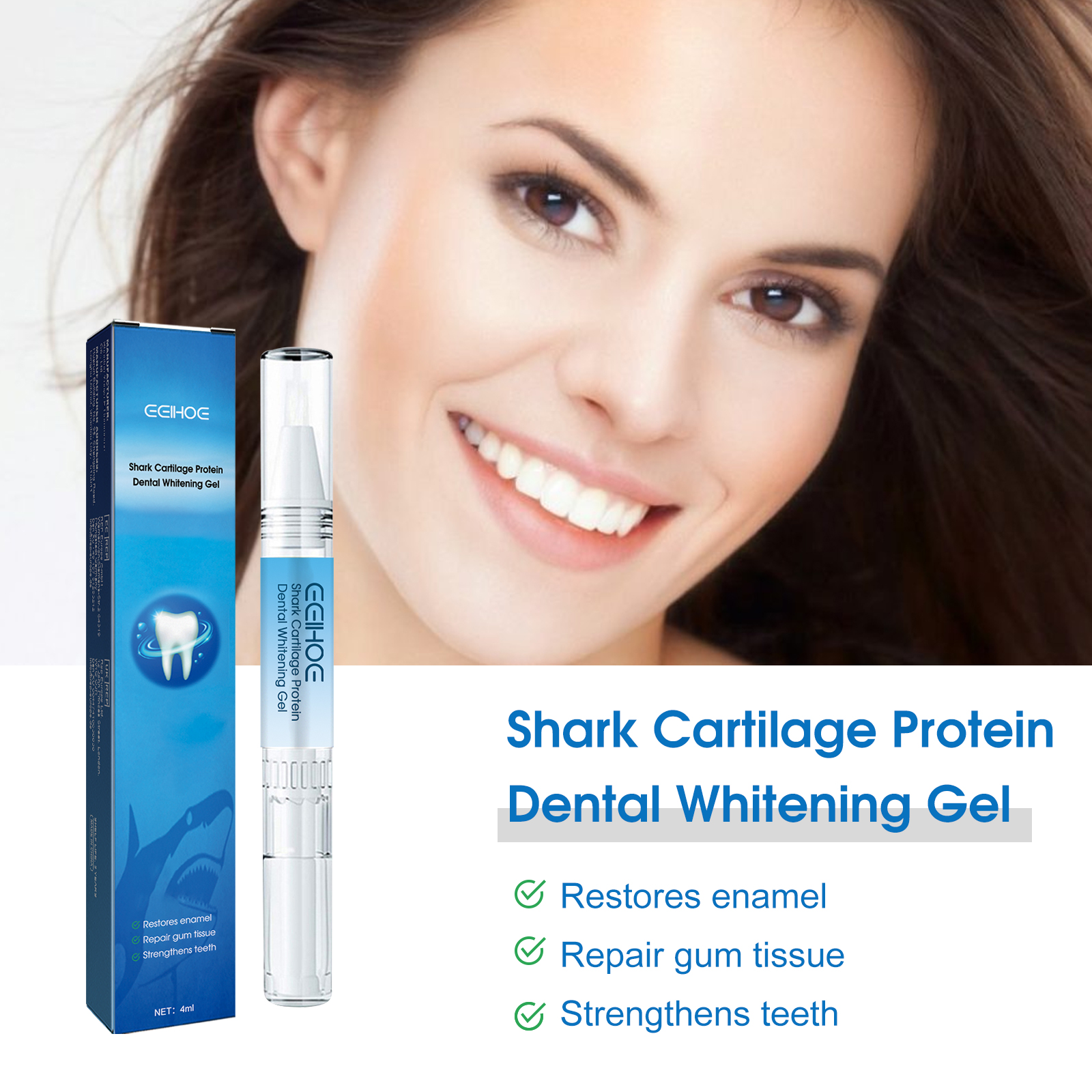 我们的牙齿修护凝胶含有鲨鱼软骨素、木糖醇、三果宝。它可以通过减少炎症和抑制有害细菌的生长,促进牙龈健康。它的使用方法很简单:1.用温水清洁口腔,擦干牙齿;2.打开瓶盖,拧一下钢笔的另一端;3.将精华液涂抹在牙齿上,静置30秒至1分钟,期间不要接触牙齿。4.30分钟后用清水漱口。可以清新口气,去除口臭用一个微笑让你的牙齿更明亮,让你恢复年轻的活力。