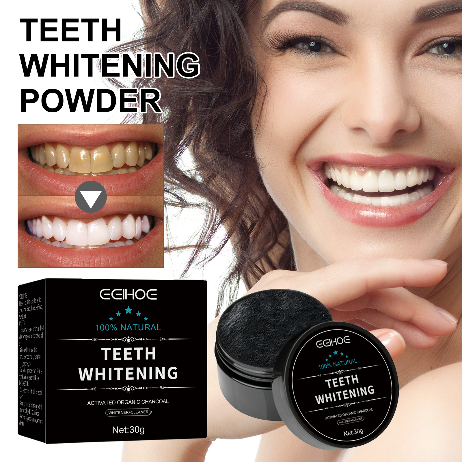 我们的美牙粉含有竹炭粉、椰壳活性炭、薄荷提取物。它可以去除牙齿上的污渍,使牙齿更白,口腔更清洁。它的使用方法很简单:1.用勺子或手指捏取适量的牙粉,加入湿牙刷中;2. 用牙粉刷牙2分钟;3. 再次用水或牙膏刷牙,清除牙齿上残留的牙粉。保护牙龈提供蛋白质,保护牙釉质;牙齿像珍珠一样明亮;去除牙齿上的污渍,跟黑牙和黄牙说再见;清新口气消除口臭,让你自信。