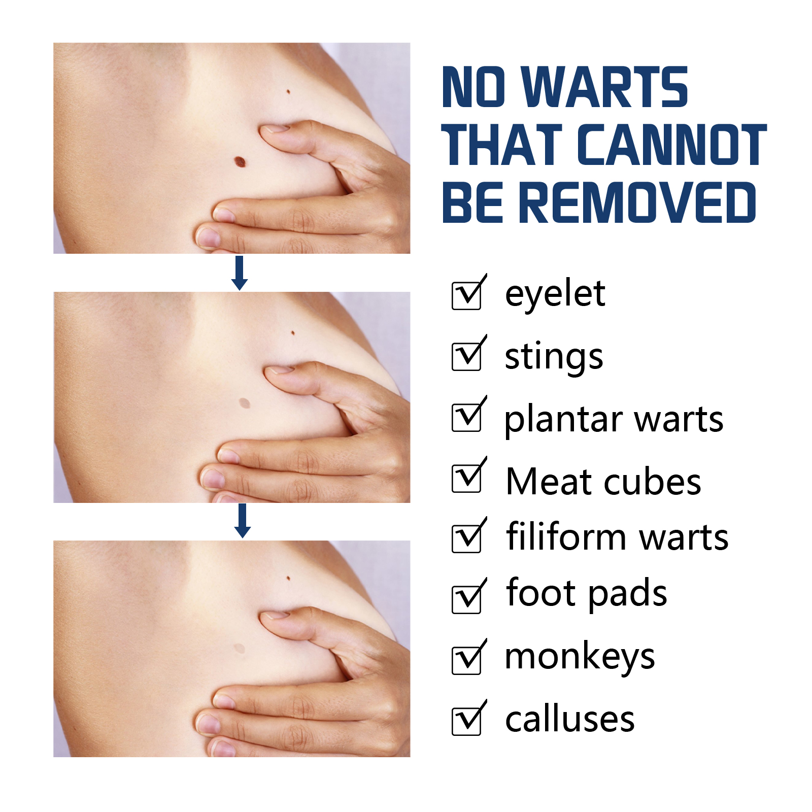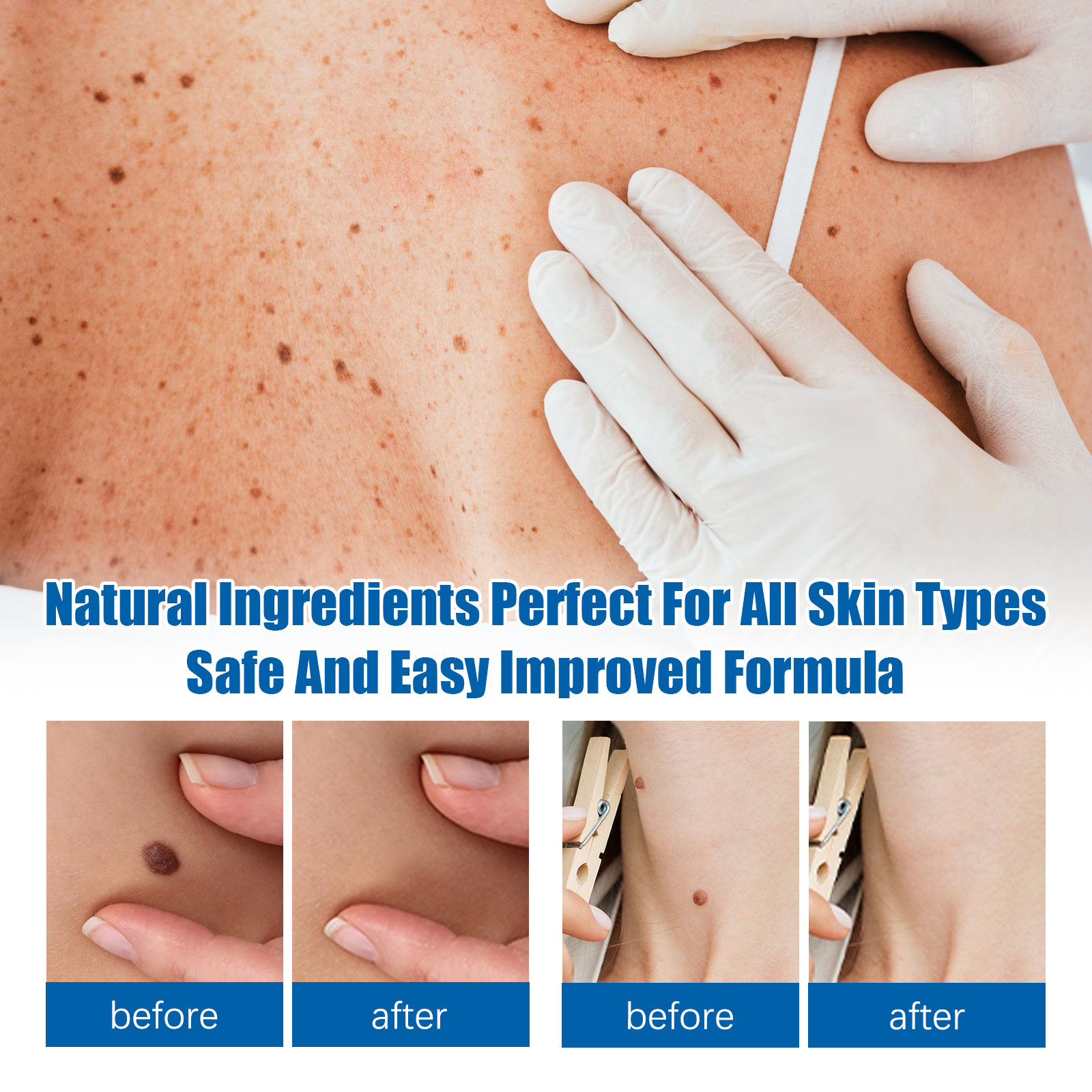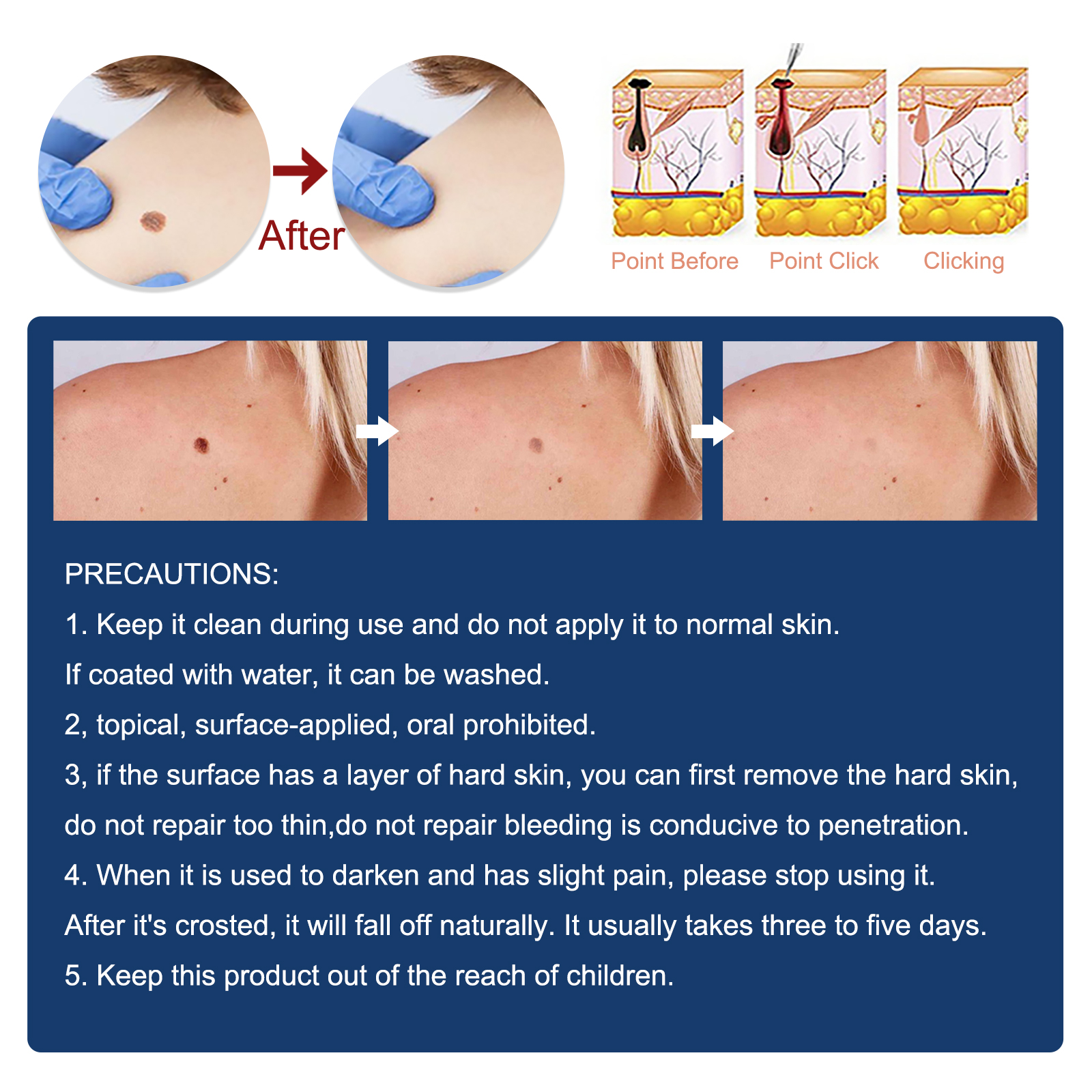 我们的皮肤护理套装含有透明质酸,芦荟汁,积雪草。它可以软化溶解的角蛋白,去除疣,高性能穿透直接到达受影响的区域。它的使用方法很简单:用小牙签取适量,涂在皮肤上,等几分钟,冲洗干净,就完成了。采用高品质精油及高效成分配制,有效安全祛除疣,没有刺激性和腐蚀性,7天内疣自然脱落,独特的去除配方可以给你快速和可见的效果。