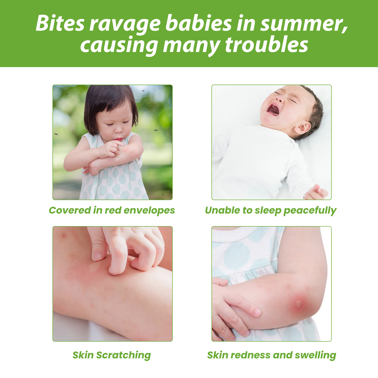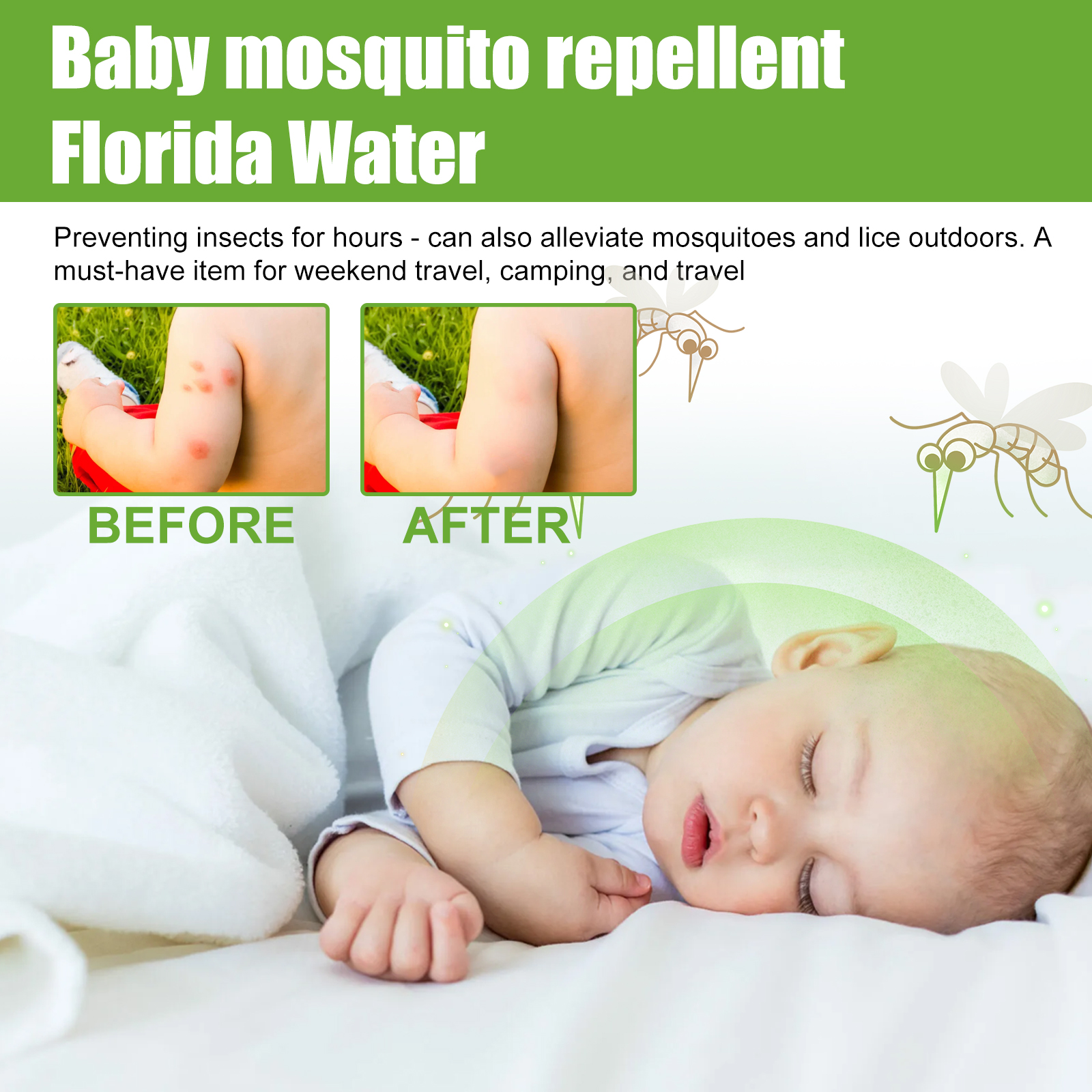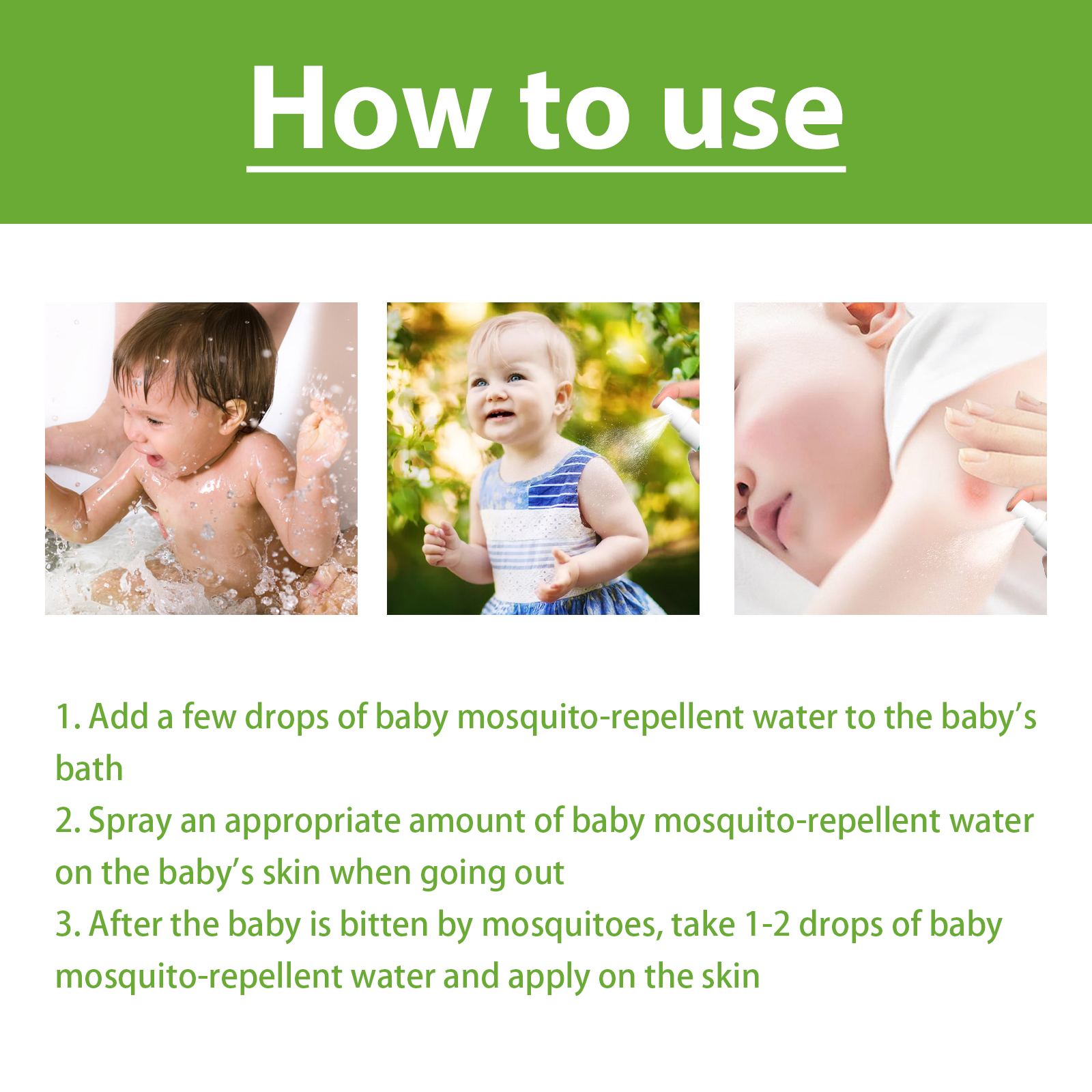 我们的驱蚊花露水含有薄荷提取物、金银花提取物、野菊花提取物。它可以防止户外的蚊子和虱子的叮咬,有效止痒。它的使用方法很简单:给宝宝洗澡时加几滴本品,外出时在宝宝的皮肤上喷上适量本品,宝宝被蚊子叮咬后,取1-2滴婴儿驱蚊水涂在皮肤上即可。长效驱蚊、有效止痒。