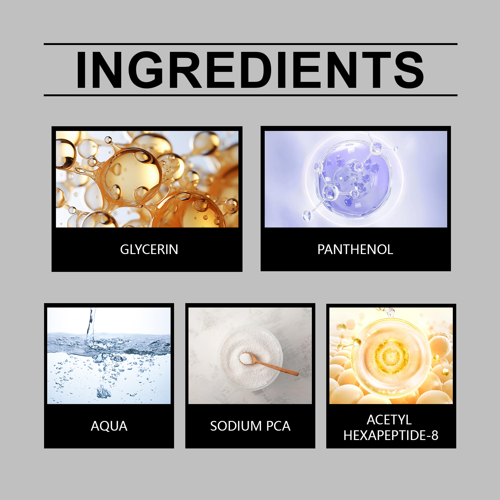 我们的保湿精华液含有甘油、透明质酸、芍药根提取物。它可以显著改善肌肤紧致度,使肌肤更具弹性和活力;有效锁住水分,帮助皮肤长时间保持水润。它的使用方法很简单:1.洗脸。2.取适量本品均匀涂抹于面部。3.轻轻按摩眼眶,促进吸收。减缓衰老的迹象,线下的线条和皱纹的可见性明显减少。均匀肤色,改善肤质,呈现健康肤色。