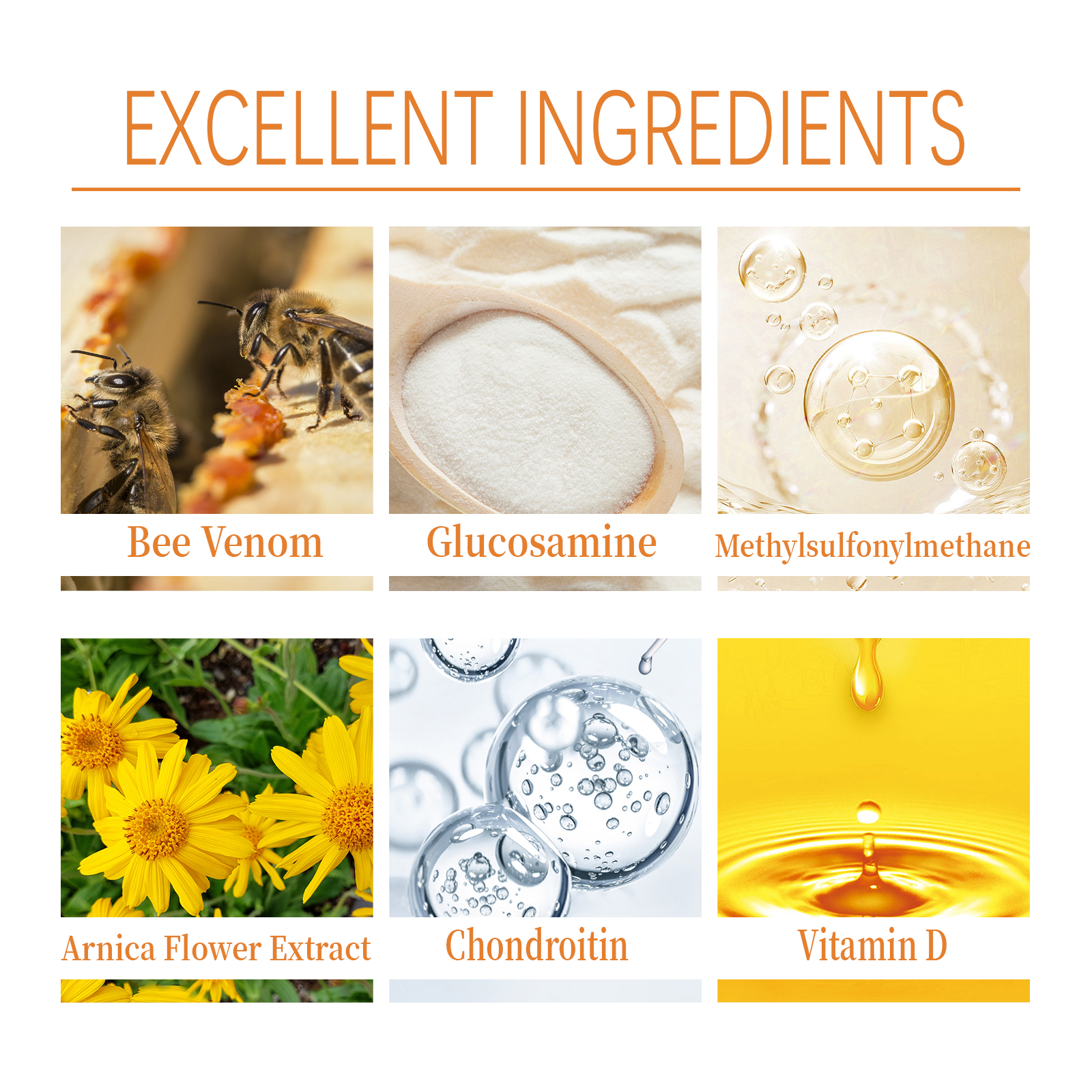 | 成分 | 蜂毒、葡萄糖胺、甲基磺酰甲烷 |