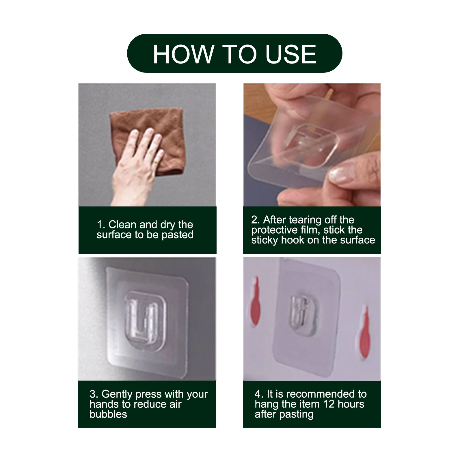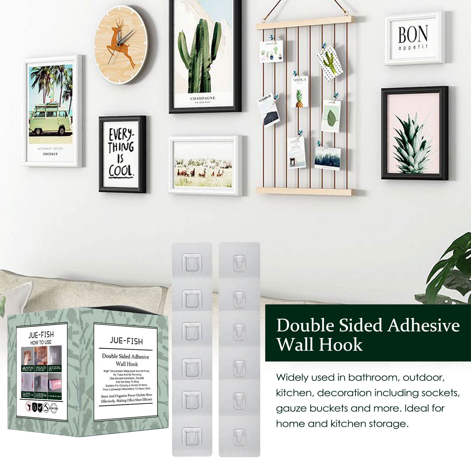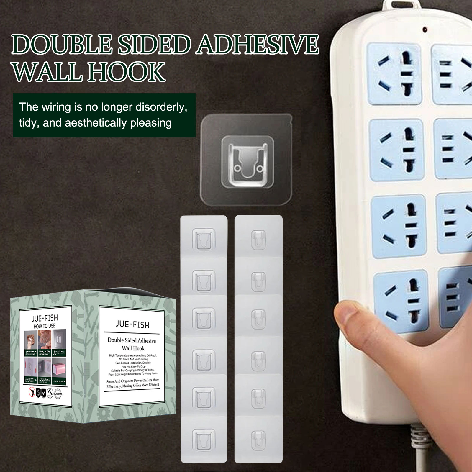 我们的双面粘性墙钩含有树脂、塑料。它可以广泛应用于浴室、户外、厨房、装修包括插座、纱布桶等。是家庭和厨房储物的理想选择。它的使用方法很简单:首先将待粘贴的表面清洁干燥,撕下保护膜后,将粘钩粘在表面,之后用手轻轻按压,减少气泡,建议粘贴后12小时悬挂物品。使用后可以牢固悬挂各种物品,让家庭更加美观,让你的生活更加便利。