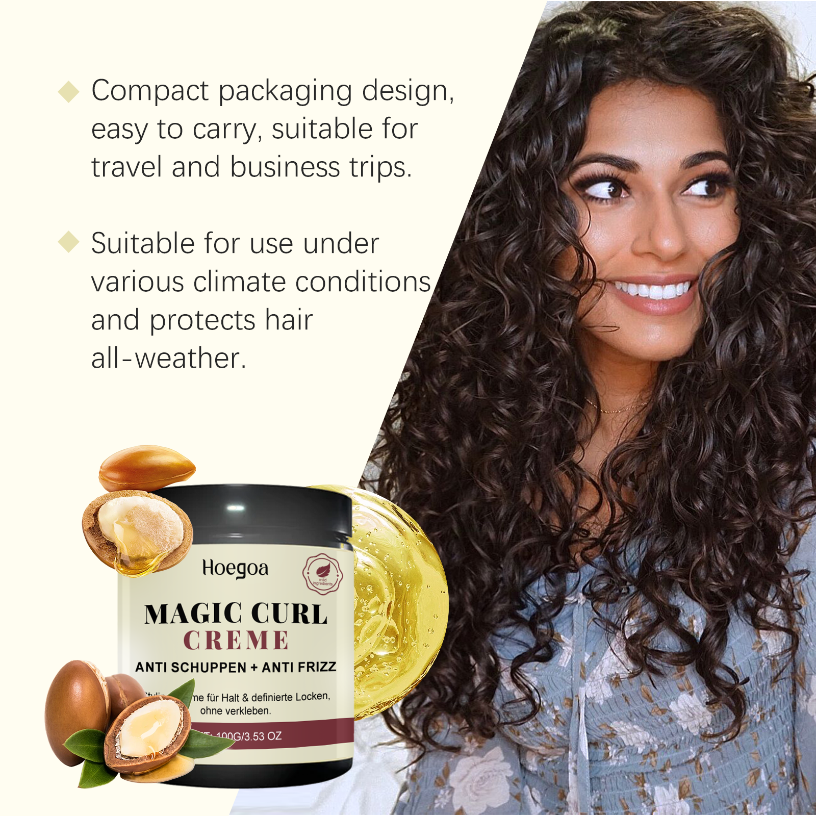 我们的卷发护理定型霜含有乳木果油、摩洛哥坚果油、甘油。它可以深层滋养,使头发更有弹性和活力,造型持久。它的使用方法很简单:1.清洁头发,保持头发干燥。2.取适量本品均匀涂在头发上,塑造你想要的发型。长时间保持卷发造型,有助于减少外界环境的影响。