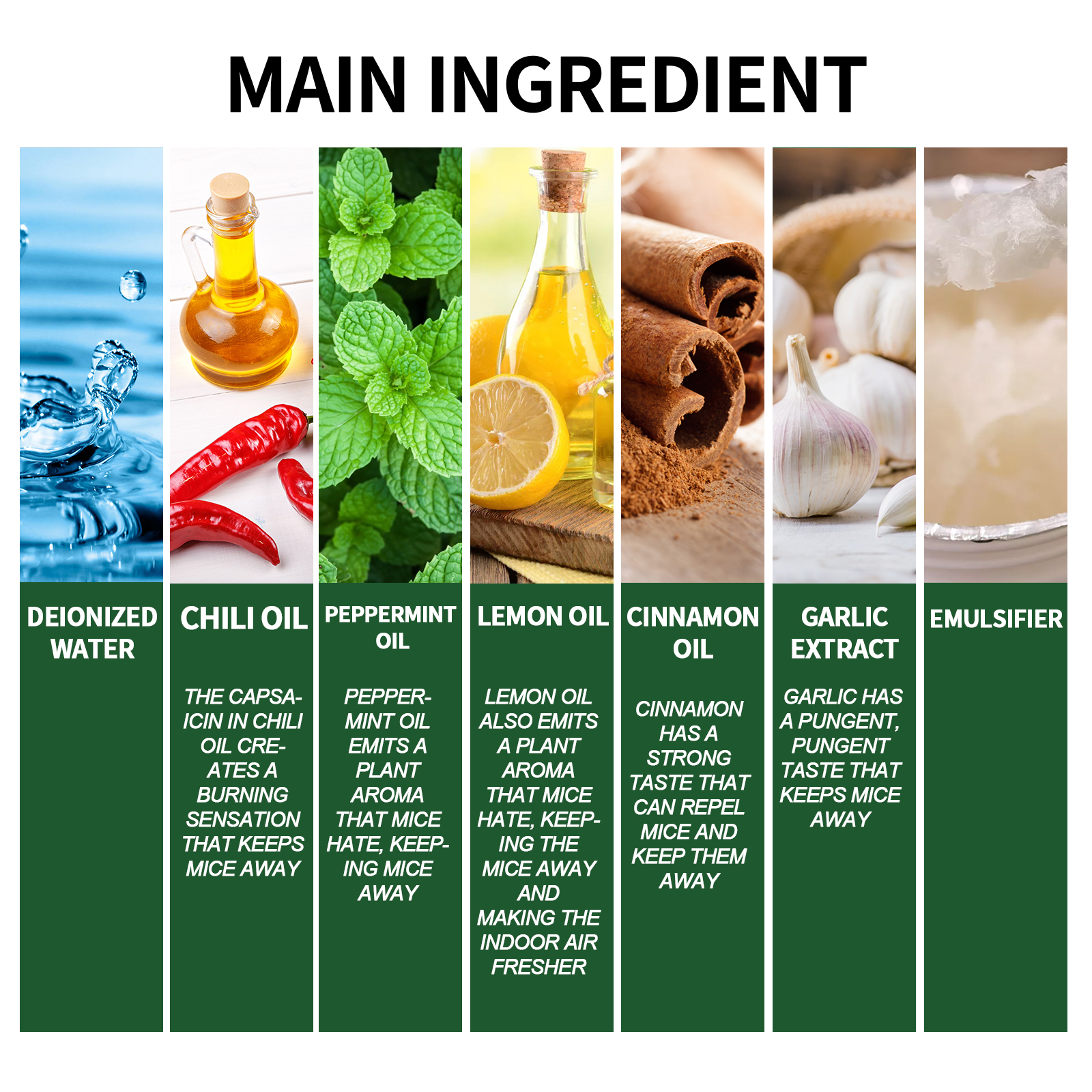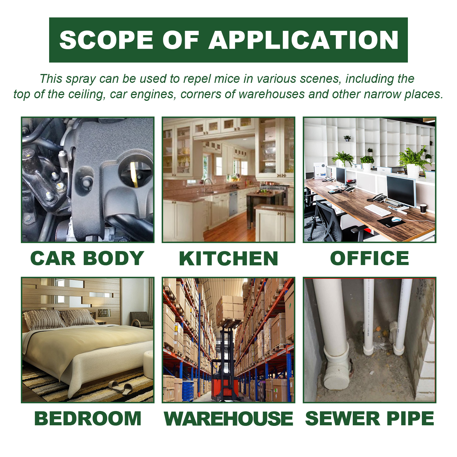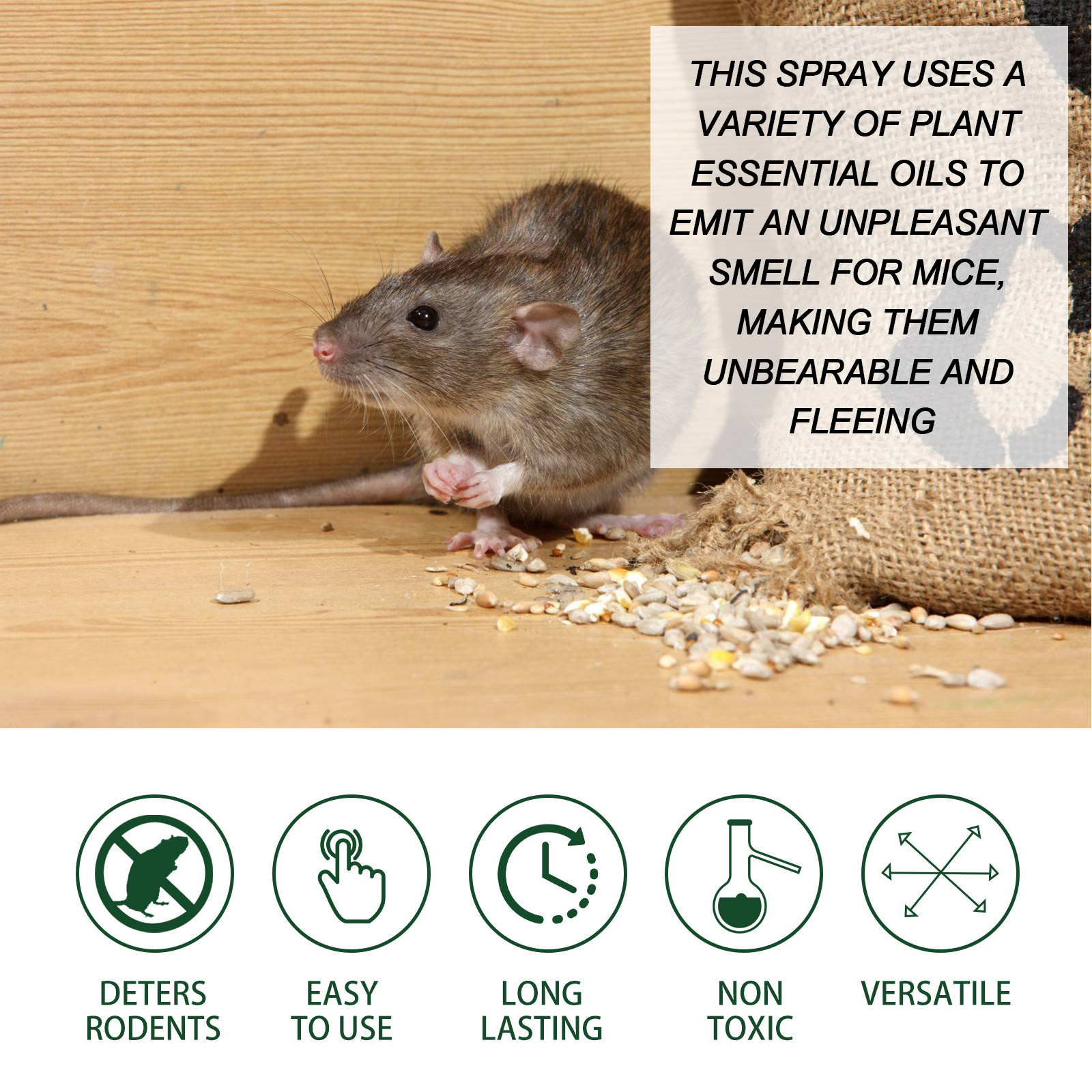 我们的驱鼠喷雾剂含有去离子水、辣椒油、薄荷油。它可以在各种场景中驱鼠,包括天花板顶部、汽车发动机、仓库角落等狭窄的地方,可以多次喷洒,加深对老鼠厌恶的记忆,达到长期驱鼠的效果。它的使用方法很简单:首先旋转喷嘴至“喷”喷状态或“流”直喷状态,之后将喷雾剂喷洒在经常出现老鼠的地方,建议每天喷4 ~ 5次,连续喷3 ~ 4天,可以使驱鼠效果更好。使用后可以达到高效驱除老鼠的效果,让你免受老鼠的困扰,效果持久,让老鼠彻底消失。