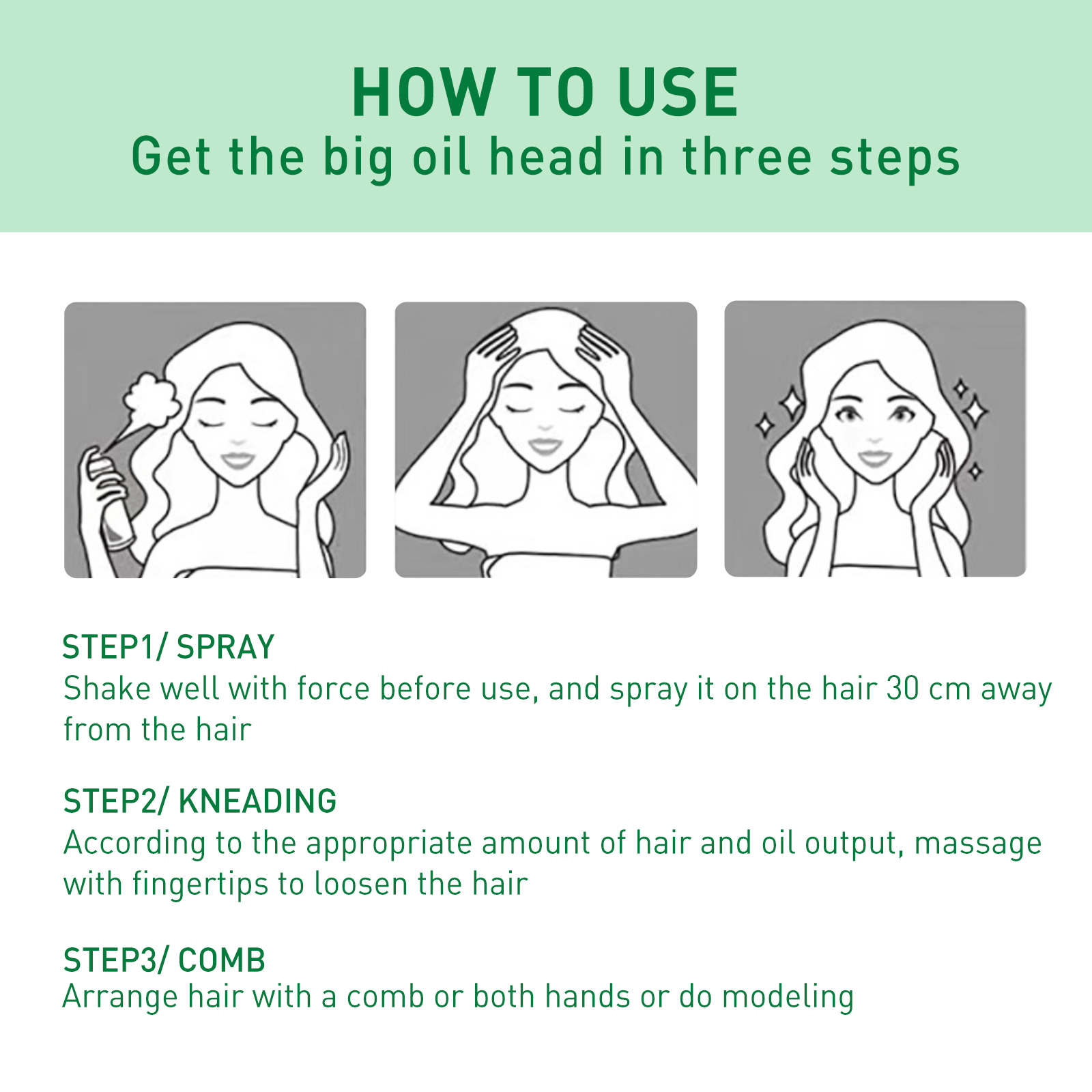 我们的头发蓬松喷雾含有大米,氨基酸,何首乌。它可以滋养头发,保养头皮发根,植物成分控制油脂而不伤害头皮,乌黑发亮的头发,补充营养,促进血液循环,保护头皮。它的使用方法很简单:喷雾,使用前用力摇匀,喷在距离头发30厘米处;捏,根据发量和出油量适量,用指尖按摩使发丝松弛;梳,用梳子或双手梳理头发或做造型。让油头迅速变平、变蓬松,增加头发毛茸程度,保留香味,控制头发油脂,蓬松发质。