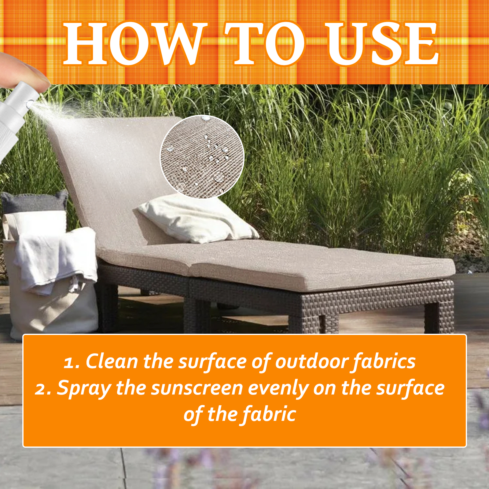我们的户外防水防护织物喷雾含有有机硅混合物、树脂、表面活性剂。它可以通过阻挡有害的射线,帮助防止织物褪色。提供卓越的防水效果。适用于户外面料,干燥无味,抵御泛黄。它的使用方法很简单:首先清洁户外面料表面,之后将户外防水防护织物喷雾均匀喷在物品表面即可。使用后可以提供卓越的防水性,维护家具,高效防水防晒,使用效果持久,使用方便,让你的家具一直崭新。