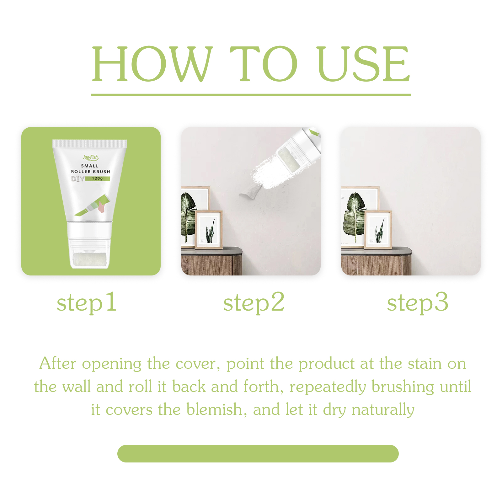 我们的补墙漆白色小滚刷含有水性漆、香精。它可以修复墙面干裂,起到抗碱、防霉的效果,使用后快速干燥,非常环保。它的使用方法很简单:首先打开瓶盖后,将产品对准墙壁上的污迹,来回滚动,反复刷至覆盖住污渍,让它自然风干即可。使用后墙面裂痕可以快速修复,成分安全环保,防水防裂,快速生效,让你的墙面焕然一新。