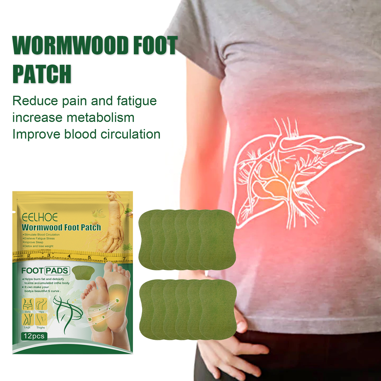 我们的艾草足贴含有艾草提取物、人参。它可以减轻疼痛和疲劳增加新陈代谢改善血液循环。它的使用方法很简单:1.首先清洁脚底的表层皮肤和表面皮肤,2.打开盒子,拿起那块薄片。3.将脚贴贴在脚底。在睡觉前将其贴好,第二天早上将其撕下,这样持续 68 小时。并且可以提高睡眠质量支持身体排除毒素帮助缓解压力和防止疲劳给日常生活带来平衡和健康。