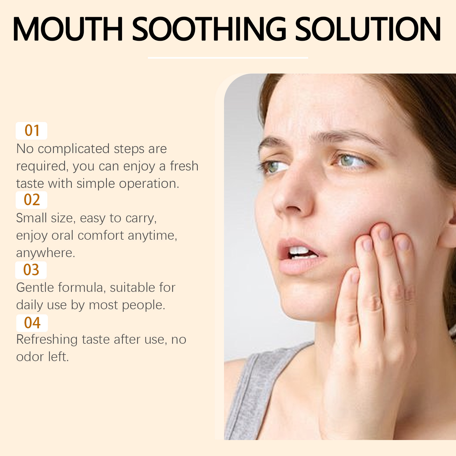 我们的草本口腔护理液含有芦荟提取物、柠檬提取物。它可以给予口腔温和的体验,适合日常使用。它的使用方法很简单:使用前摇匀产品;取适量本品,倒入口中。并且可以舒缓口腔不适,帮助保持清新的感觉。