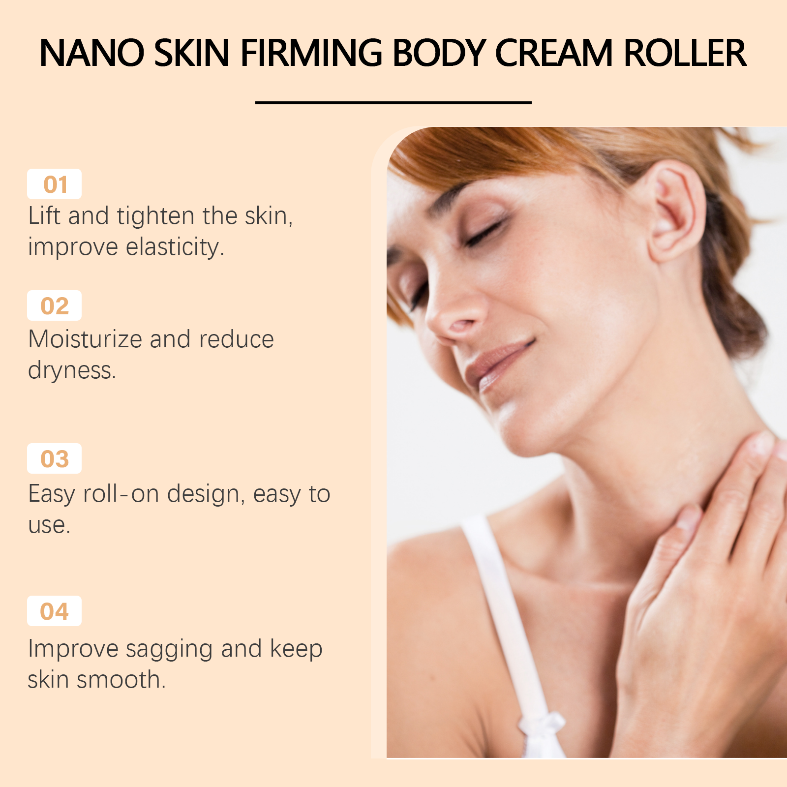 我们的身体乳霜滚轮含有甘油、蜂毒、山金车花提取物。它可以帮助肌肤紧致,减少松弛感,提高肌肤整体弹性。它的使用方法很简单:1.清洁并擦干皮肤。2.挤出适量的身体乳,使用本产品附带的滚筒涂在身体上;3.轻轻按摩直至吸收。角鲨烷成分滋养皮肤,使皮肤看起来更健康,更容光焕发。