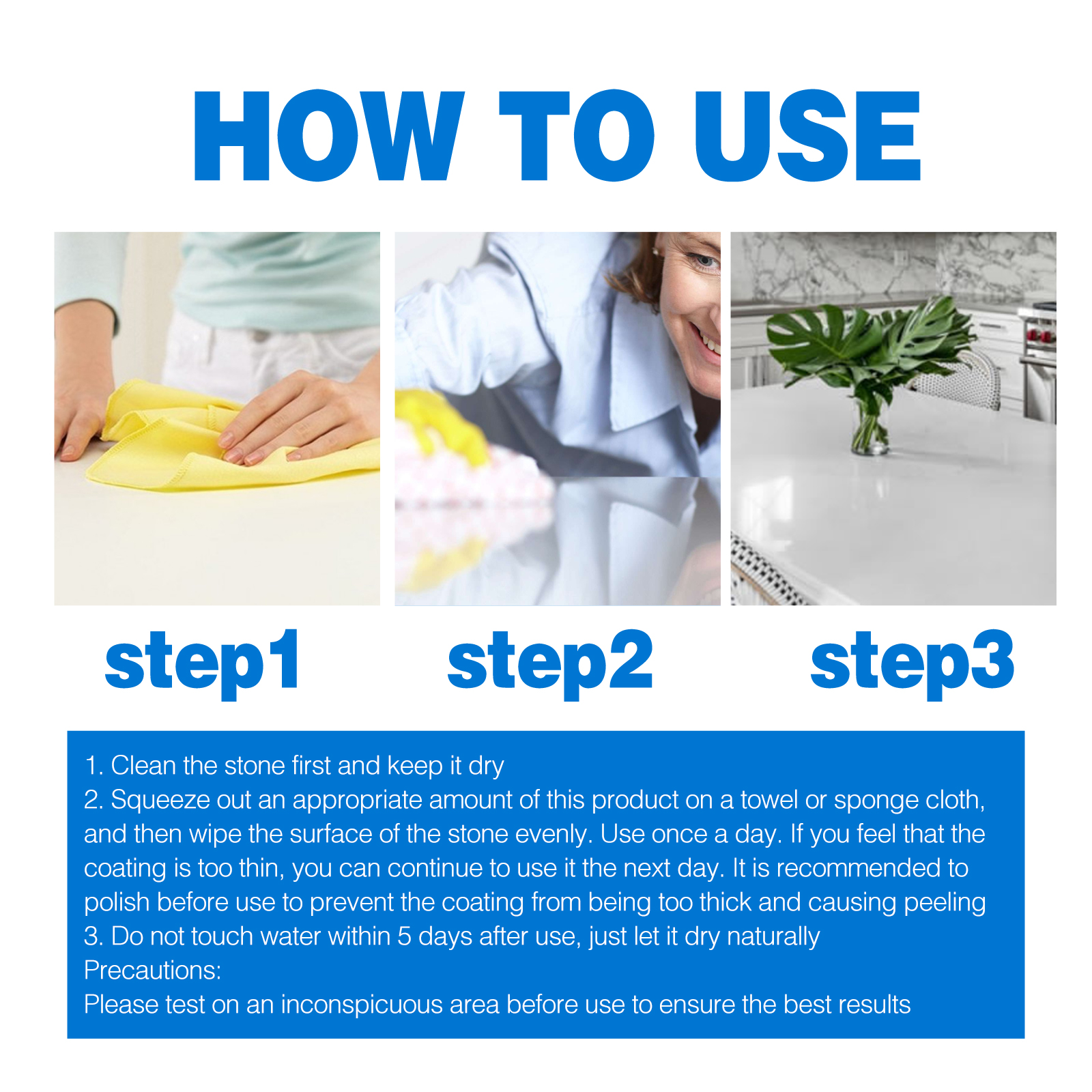 我们的瓷砖镀膜剂含有聚氨树酯、二氧化硅、表面活性剂。它可以让厨房台面重新焕发亮丽光泽,防止污染、霉变和渗透。它的使用方法很简单:首先先把石头清洗干净,保持干燥,在毛巾或海绵布上挤出适量本品,然后均匀擦拭石材表面。每天使用一次。如果感觉涂层太薄,第二天可以继续使用。建议在使用前打磨一下,防止涂层太厚,造成剥落,使用后5天内不要接触水,只是让它自然风干预防措施:使用前请在不显眼的地方进行测试,以确保最佳效果。使用后厨房台面焕然一新,充分得到保养,变得如同全新的一样。