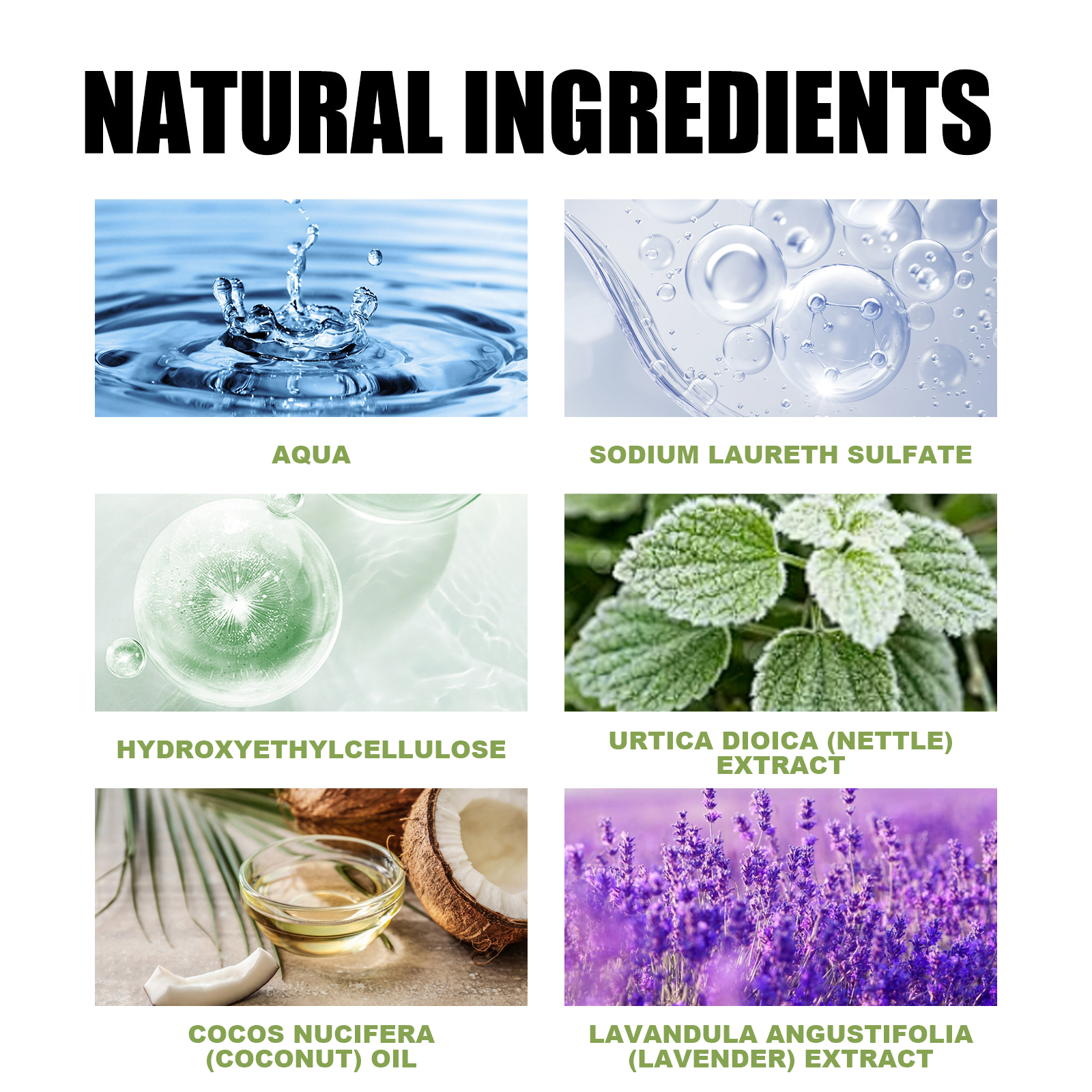 我们的草本洗发水含有椰子油、薰衣草提取物。它可以有效缓解干燥、脱发、头皮屑等问题。它的使用方法很简单:1.用温水湿润头发。2.取适量的洗发水,将其揉搓在手掌上,使其产生泡沫。3.从发根到发梢轻轻搓洗。4. 然后用清水冲洗。并且可以滋养头发,滋润头皮。