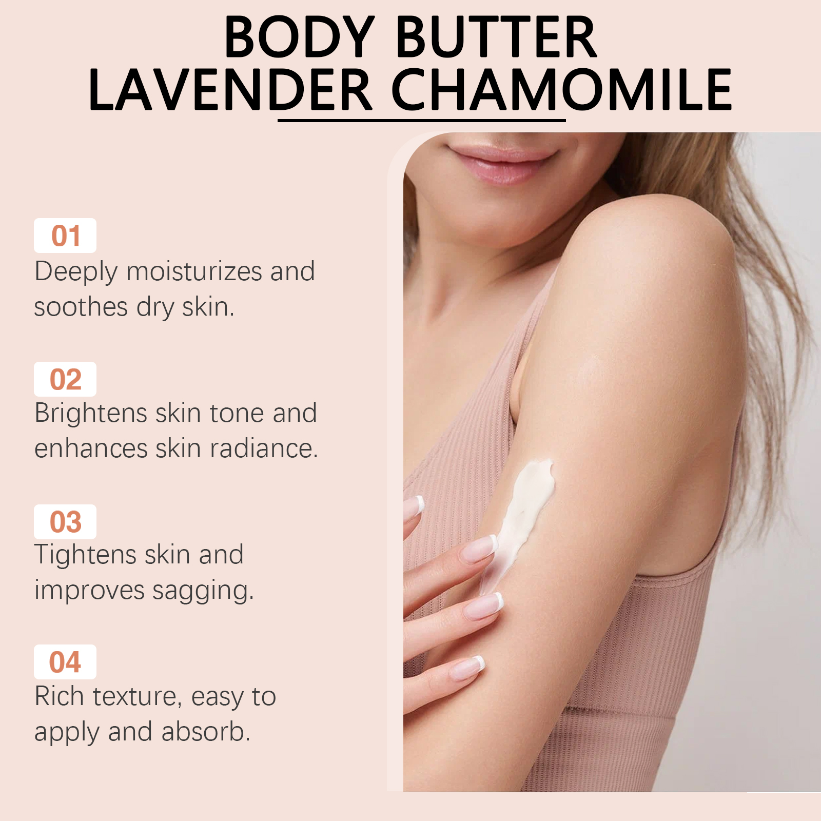 我们的身体黄油润肤霜(薰衣草洋甘菊味)含有乳木果油、薰衣草提取物、洋甘菊提取物。它可以改善肌肤紧致及松弛。舒缓皮肤,减少红肿和瘙痒。它的使用方法很简单:1.清洁皮肤,保持干燥。2.取适量本品均匀涂抹于全身肌肤。3.轻轻按摩至吸收。改善肌肤紧致度,令肌肤柔软紧致。肌肤柔软细腻,给人一种容光焕发的感觉。